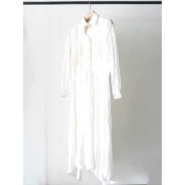 めちゃくちゃ可愛いウエスタンドレス☺︎ しっかり古めな70s頃のお品。 綺麗なホワイトカラー、更には高品質な100%アセテート生地の一着です。 シルクの様な滑らかで光沢感のあるラグジュアリーなファブリック◎ 袖はレースがあしらわれたシースルー生地での切り替え、フロント、背中部分にもレース、リボン、スパンコール、フリンジ等、ヴィンテージならではな贅沢で繊細な装飾がめちゃくちゃ素敵です♪ ウエストから裾にかけて生地分量がたっぷりとられたドレスで、着用時のドレープがとても雰囲気良く、特徴的な裾のカッティングからくるシルエットもイケてます。 めちゃくちゃ可愛いですよ、此方☺︎ 気になられた方は是非この機会に 【カラー】 ホワイト (※お使いのモニター環境により、画像の色味が実物と異なって見える場合がございます。) 【素材】 100% アセテート 【サイズ】 表記サイズ : 5/6 肩幅 41cm / 身幅 51cm / 袖丈 64cm / 着丈 122cm / ウエスト 42×2cm ※測定における若干の誤差はご了承下さいませ。 【状態】 ヴィンテージ製品らしい襟元、フロントに所々薄シミがございます(画像参照よろしくお願いします。)着用に支障をきたす汚れやダメージ等は無く古着慣れされてる方なら問題無いレベルかと。 ※尚、実店舗でも販売しております為、掲載されていても時間差で在庫切れになる場合がございます。予めご了承下さい。