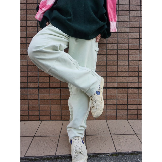 1990年代頃のFILAより、 ダブルニー仕様のペインターパンツです。 こんなのあるんですね。な一本☺︎ 写真だと伝わりづらいですが、淡いミントグリーンの色味にほんのり起毛感のあるモールスキンの様なコットンファブリック◎ フロント2ポケットに、ダブルニー、ハンマーループやツールポケットもしっかり付いたペインターパンツ仕様な一本となります。 めちゃくちゃ洒落たパンツかと☺︎ お好きな方も多い、ダブルニーペインターパンツ、中でも間違い無く他と差別化できるサラッと穿きたい一本です♪ サイズ、コンディションも申し分無し◎ 気になられた方は是非お見逃しなく! 【ブランド】 FILA 【カラー】 淡いミントグリーン (※お使いのモニター環境により、画像の色味が実物と異なって見える場合がございます。) 【素材】 不明 おそらくコットン 【サイズ】 表記サイズ : XL ウエスト 84cm / 股下 78cm / 総丈 105cm / 裾幅 22cm ※測定における若干の誤差はご了承下さいませ。 着用感 : メンズW33L30程度 着用モデル : 171cm 52kg 【状態】 古着特有の使用感程度の比較的綺麗な状態です。 ※尚、実店舗でも販売しております為、掲載されていても時間差で在庫切れになる場合がございます。予めご了承下さい。
