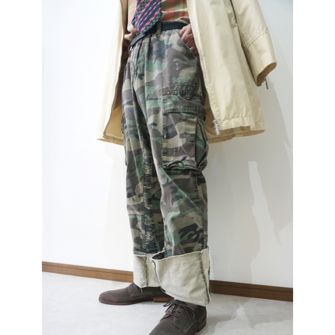 一見ありがちなウッドランドカモのパンツかと思いきや、股下、裾がタイガーカモで切り替えの入る初見なデザイン。。