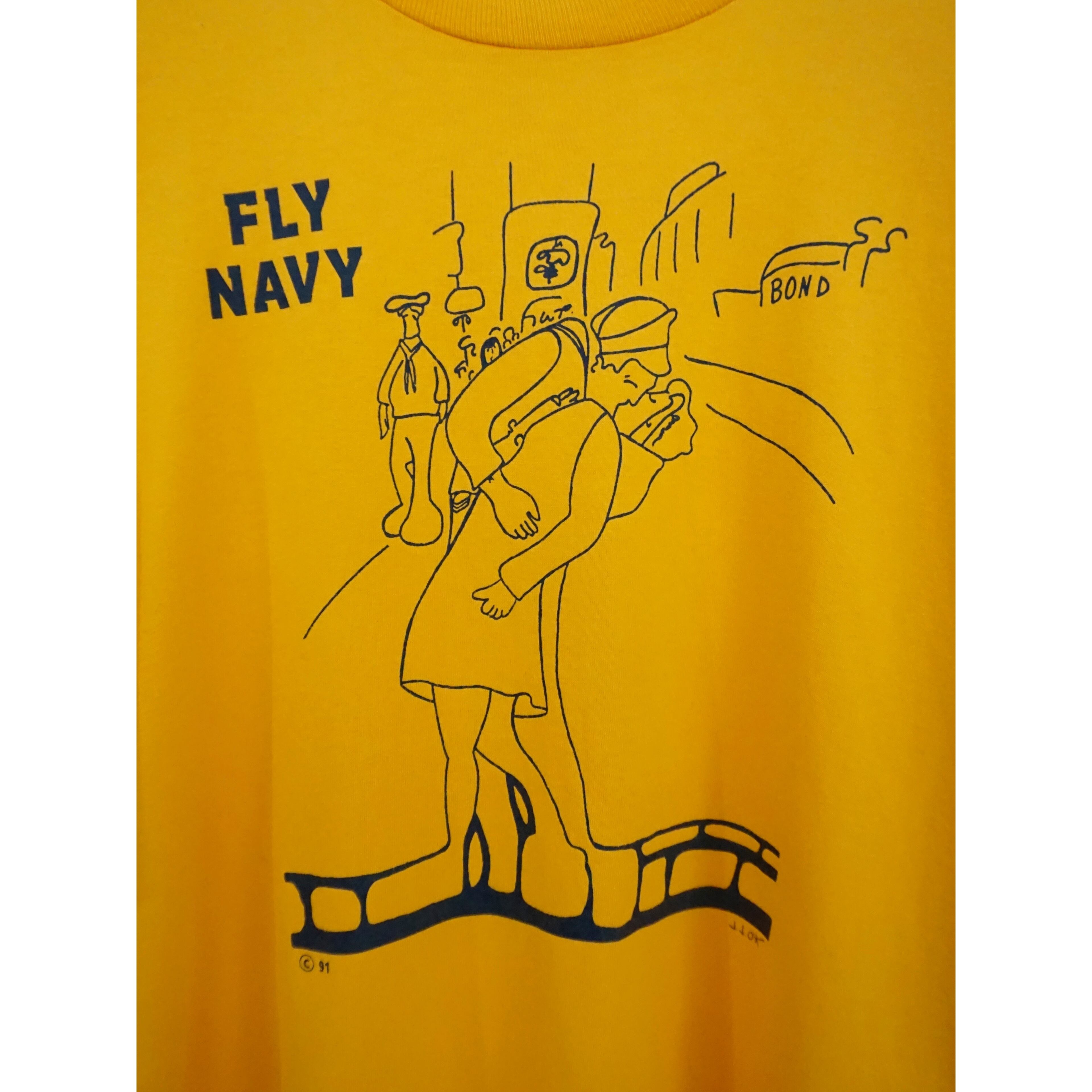 1990s vintage "FLY NAVY" drawing printed t-shirt made in USA