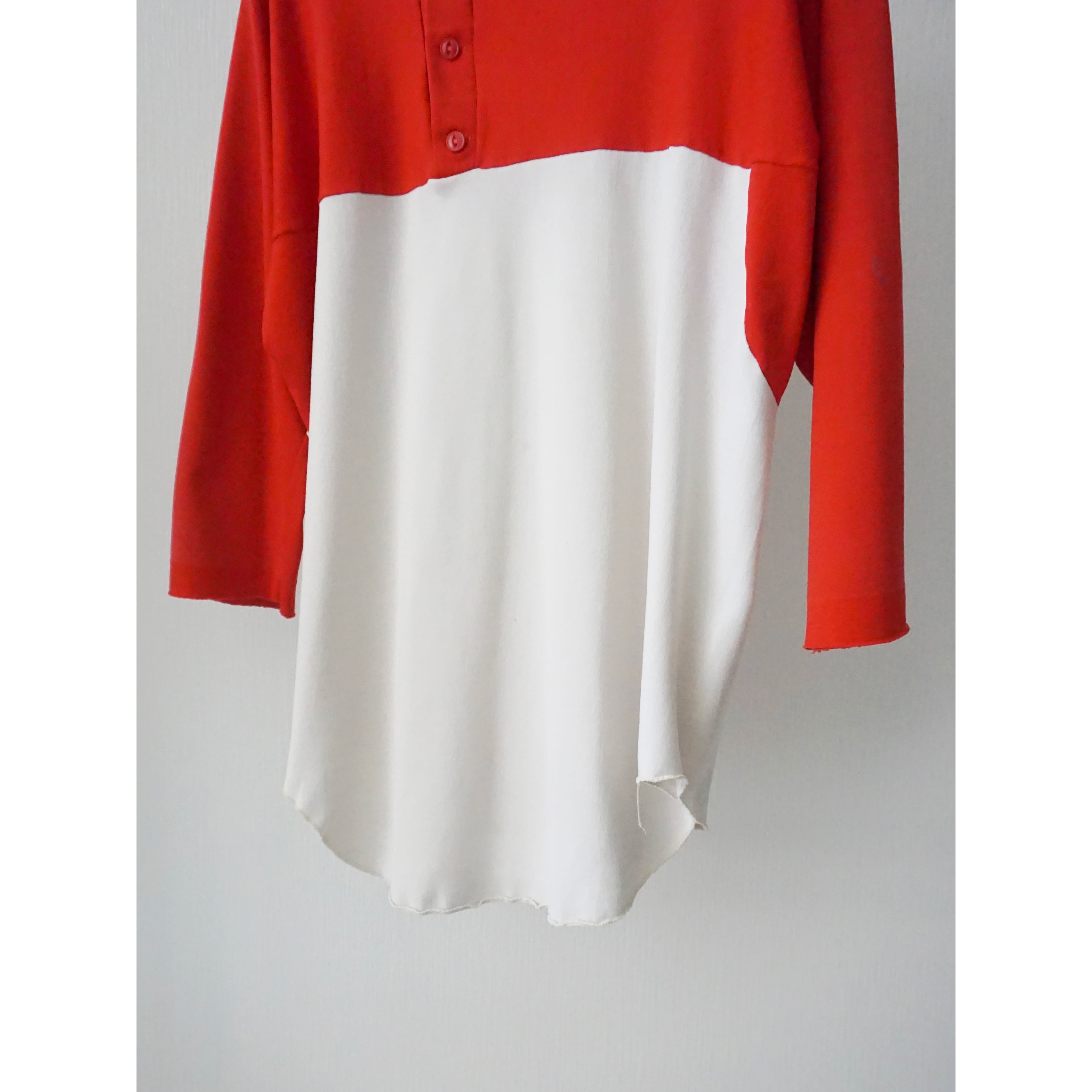 此方はレッド×ホワイトの2トーン、フロントはやや斜めにヘンリーネック仕様。