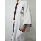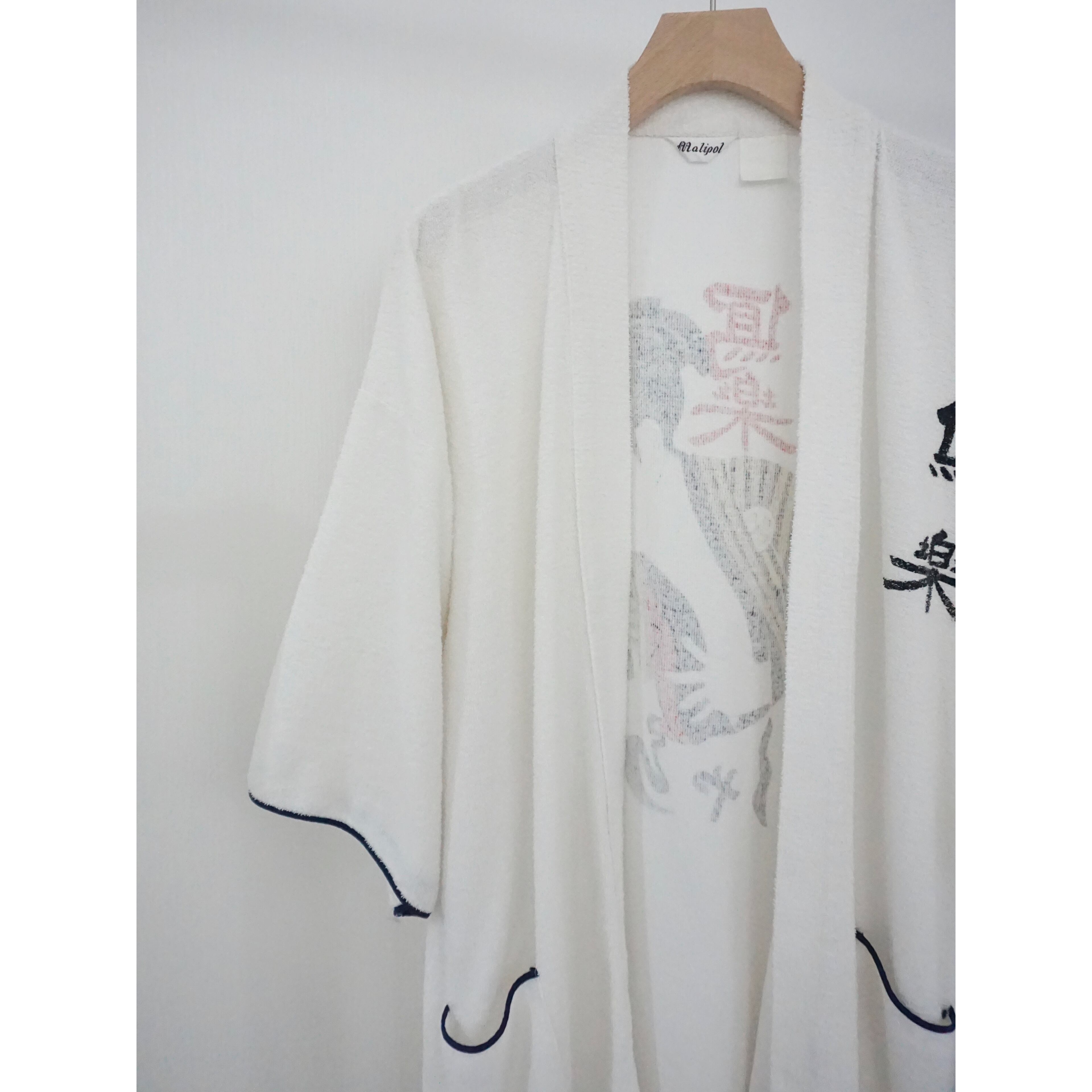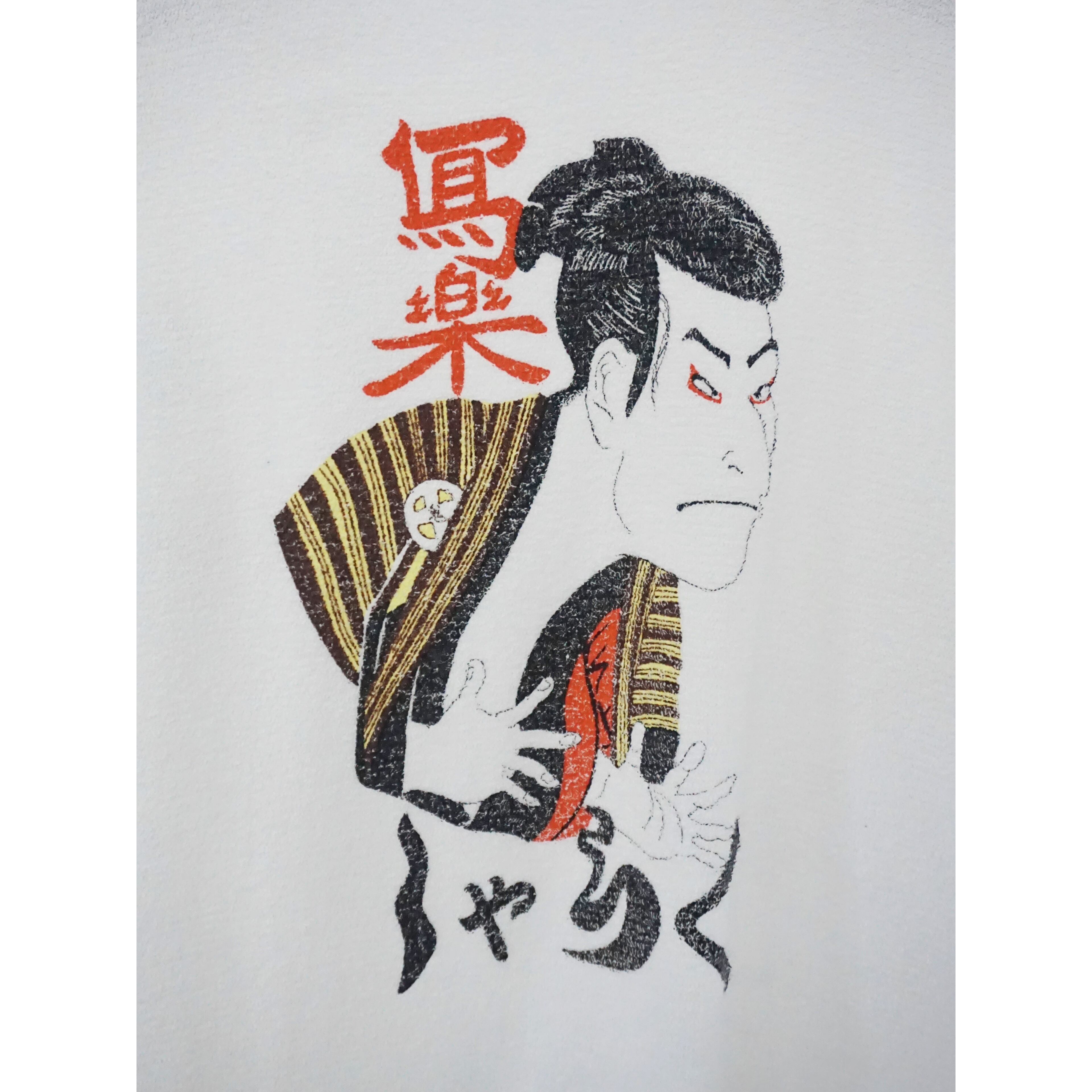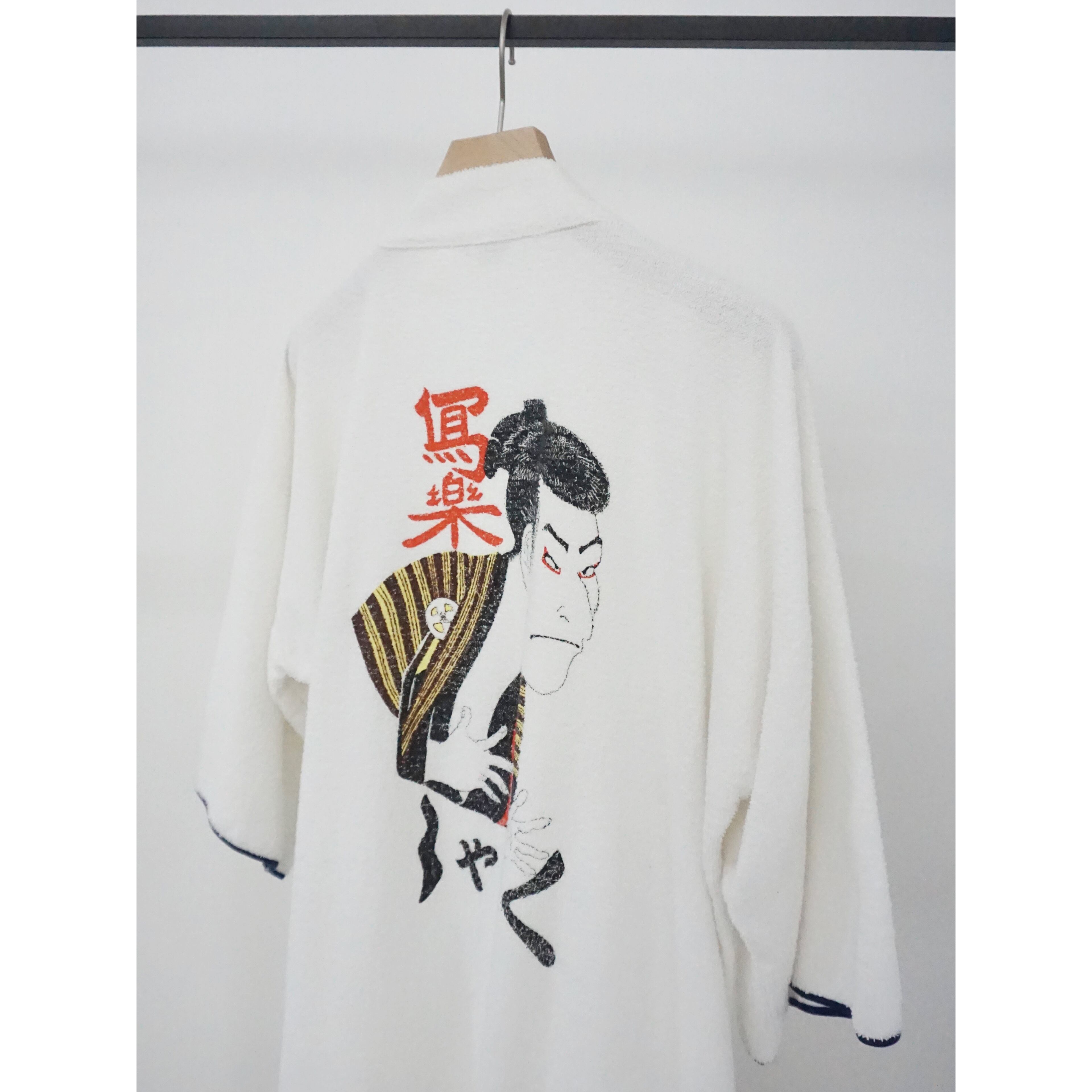 タグがほぼ読みとりづらくなってますが、素材はオールコットンのホワイトのパイル生地、半袖ガウン仕様の一着です。胸元に"写楽"、背面にも最高にクールなプリントが入ります☺︎