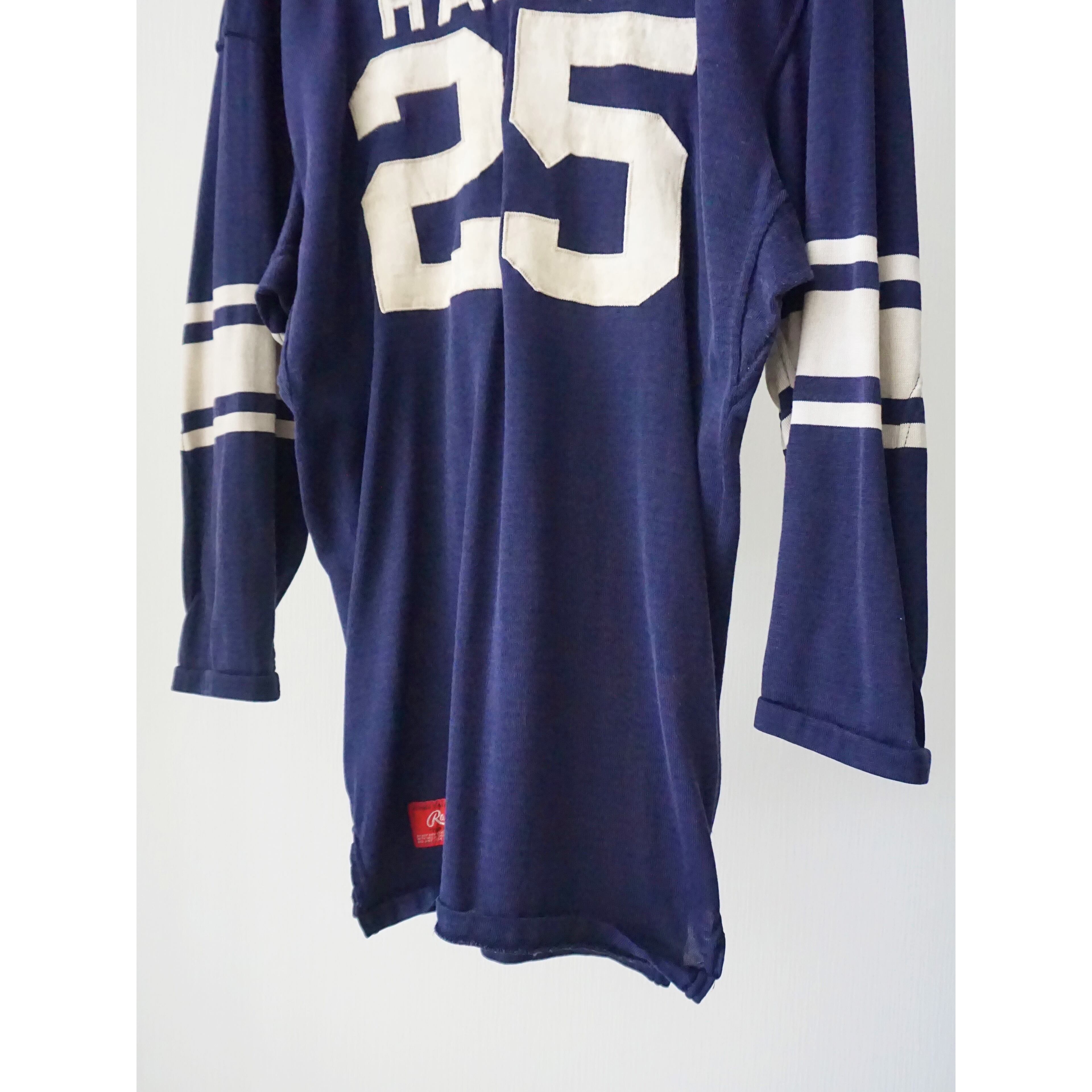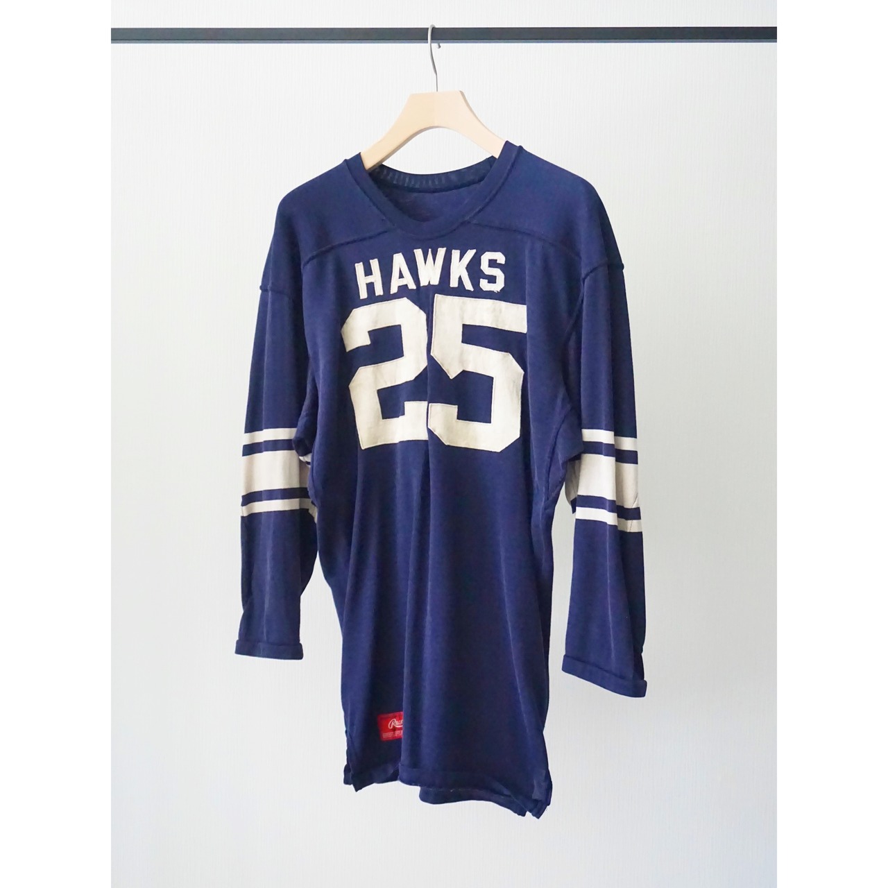 元は七分袖仕様ですが肩が落ちてロングスリーブ、ほんのりロングバランスなヴィンテージフットボールTならではなシルエットです