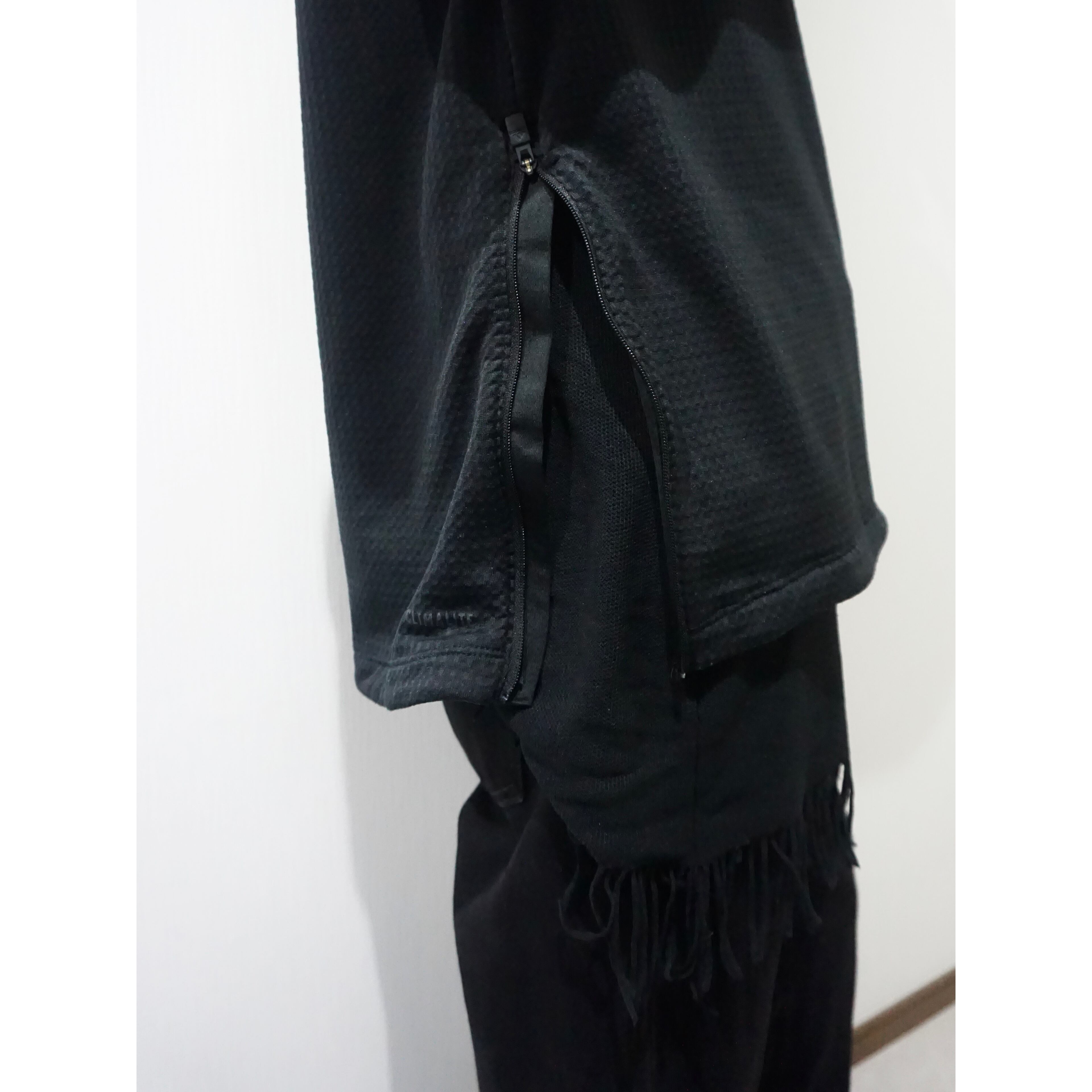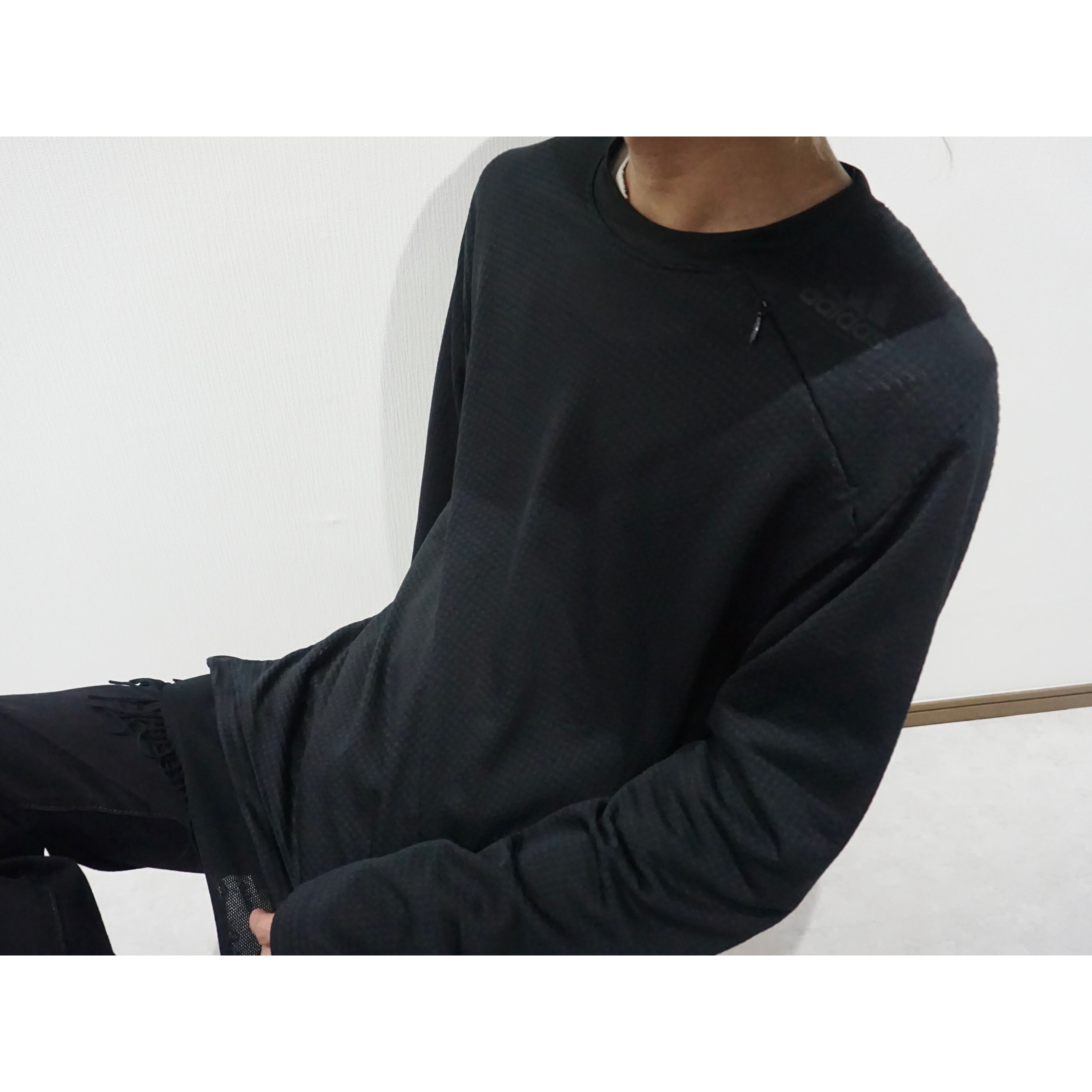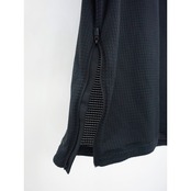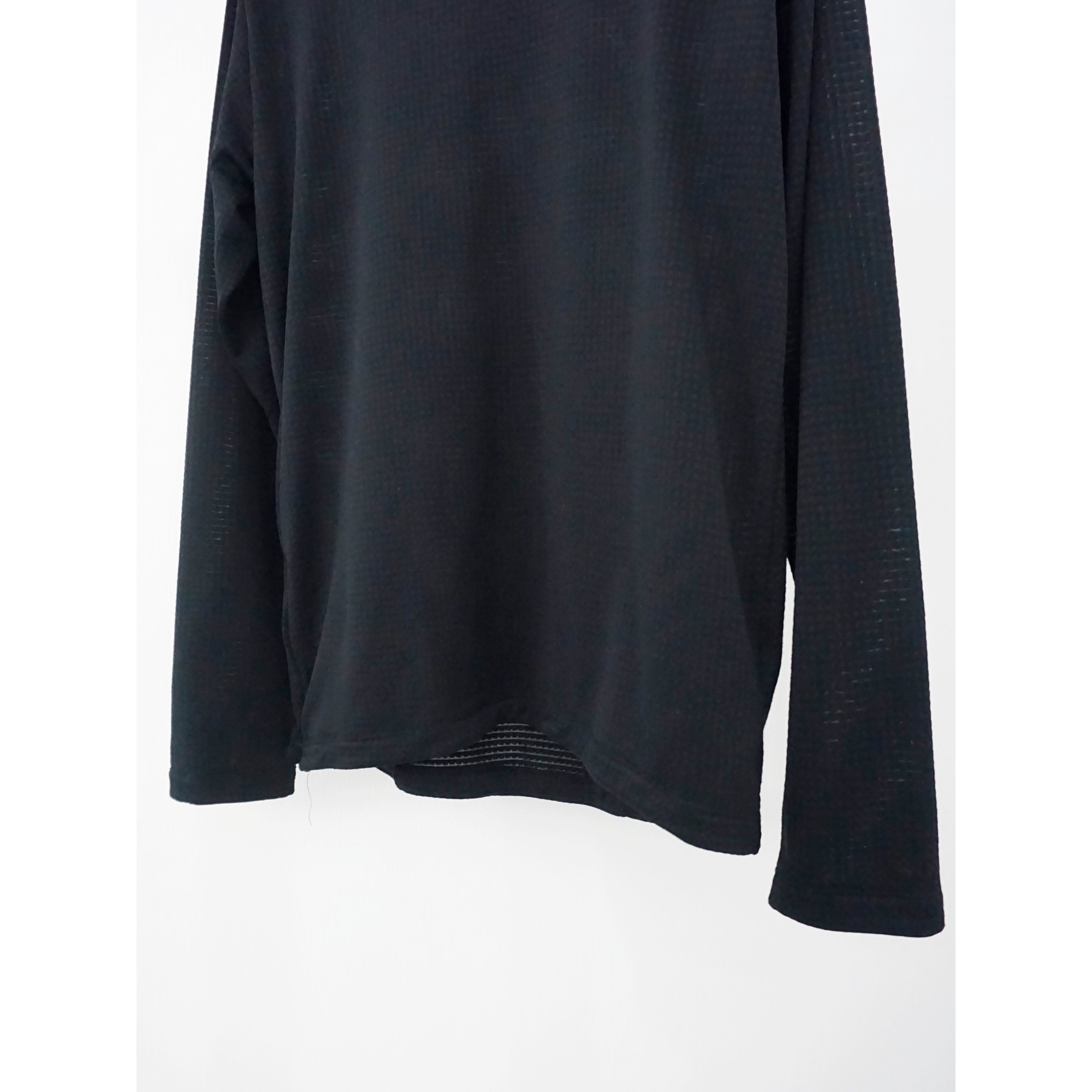 オールブラックカラーにほんのり透け感もあるポリ素材の凹凸あるファブリック。ジャージー生地みたいな伸縮性もあり、これからの蒸し暑い夏場でもドライタッチに着れる生地。