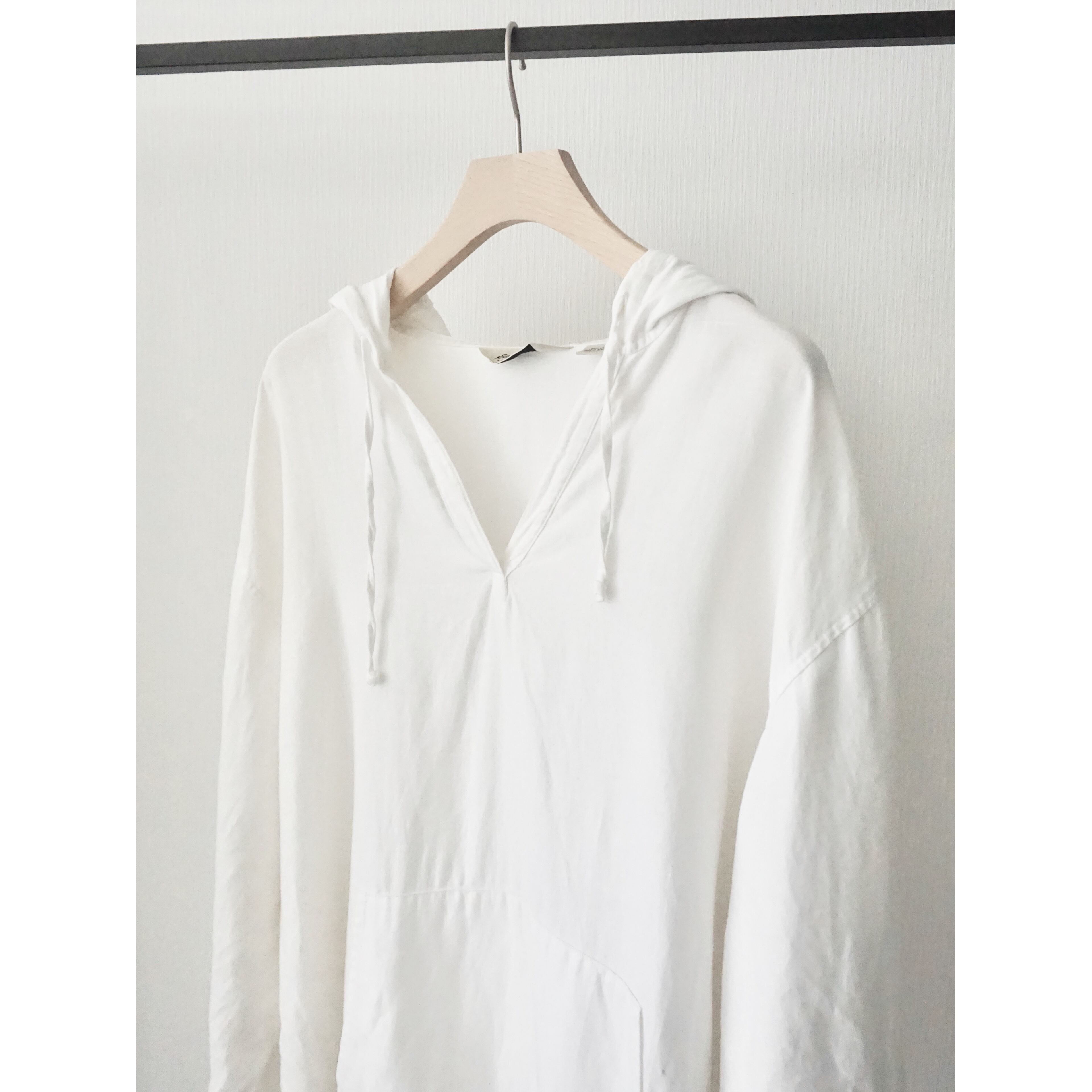 上質なプルプルとトロミのある着心地抜群なホワイトリネン、大き目なフードにドローコード、フロントポケット、両サイドスリット入りのデザイン◎