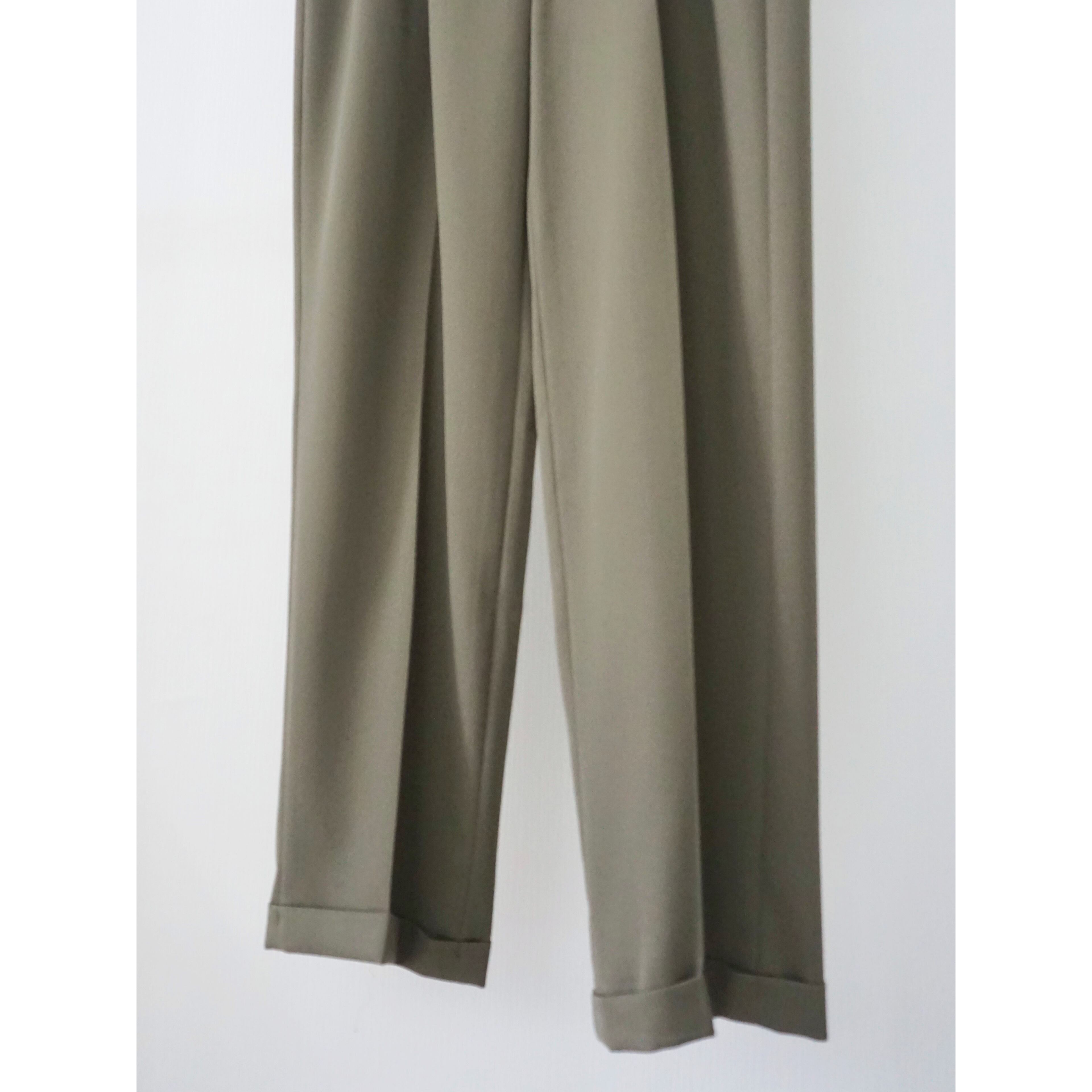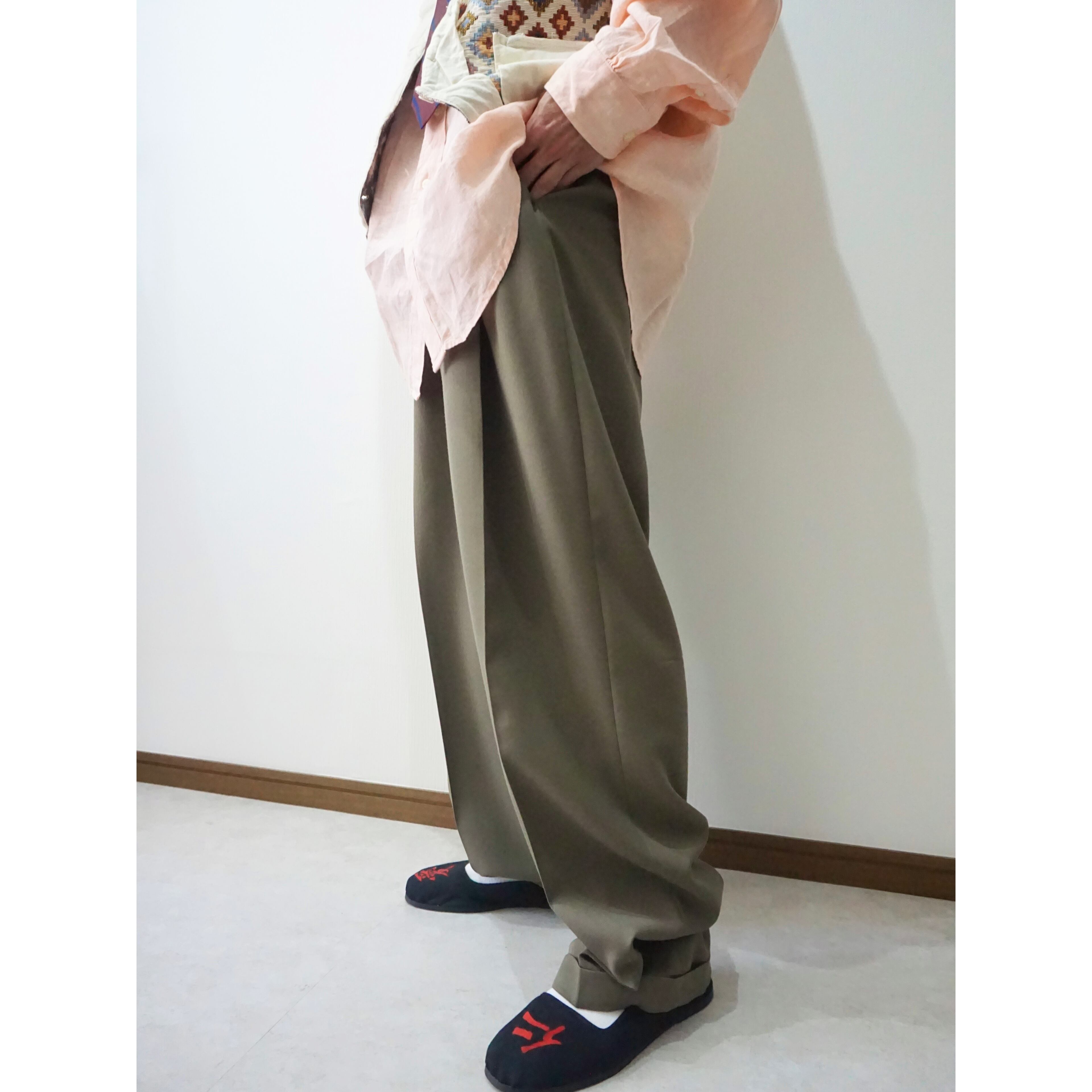 ウールギャバならではな起毛はせず滑らかで特有の鈍い光沢感、ハリがありながらもコシ、とろみのある生地となります。しっかり足のラインから離れたワイドシルエットで着用時の垂れる生地によるドレープが色気あります。