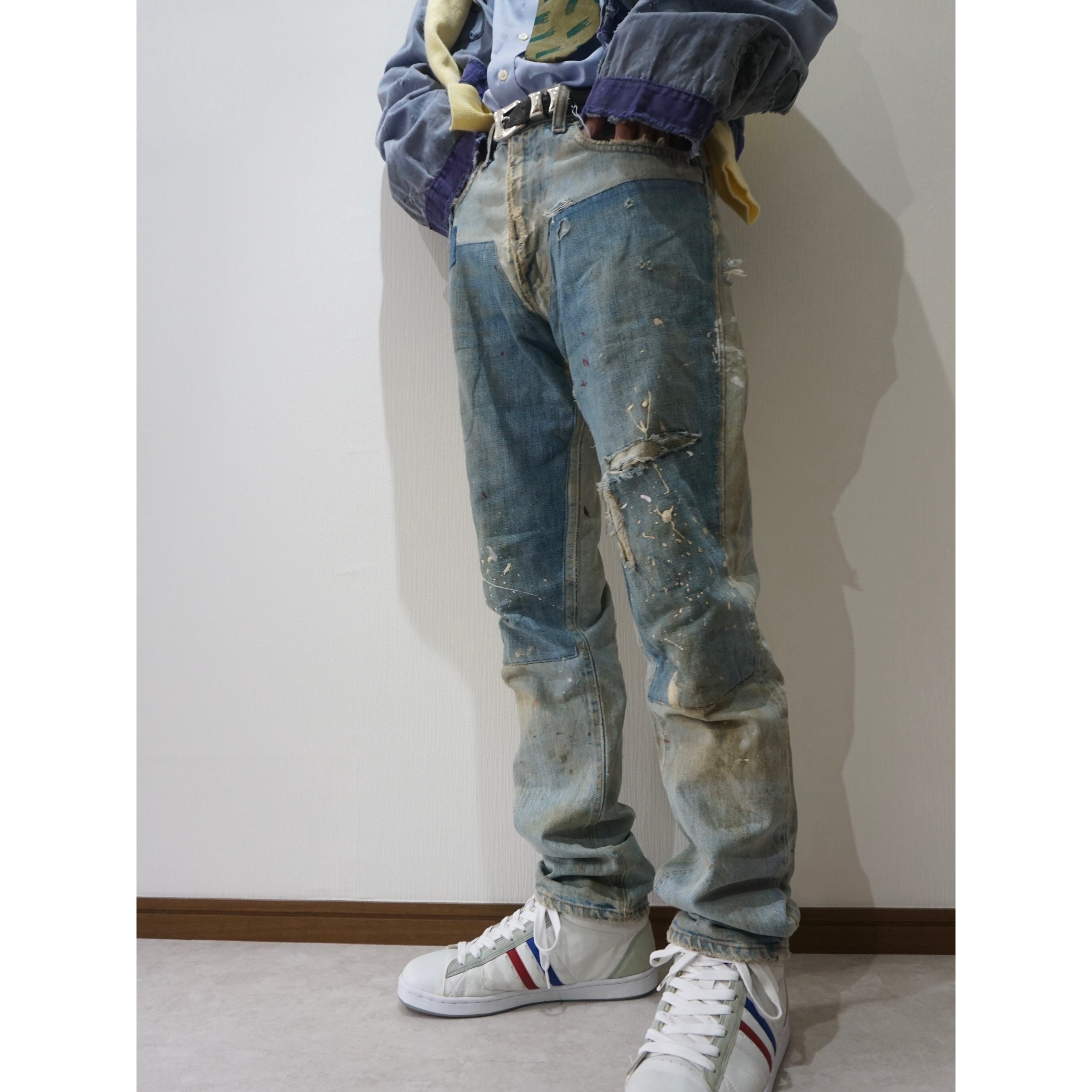 ヴィンテージならではな褪色したブルーデニムに、前所有者によるダブルニー的リペア、激しいペンキ汚れや各所のダメージ等、もはやアートピースなめちゃくちゃ格好良い一本です。