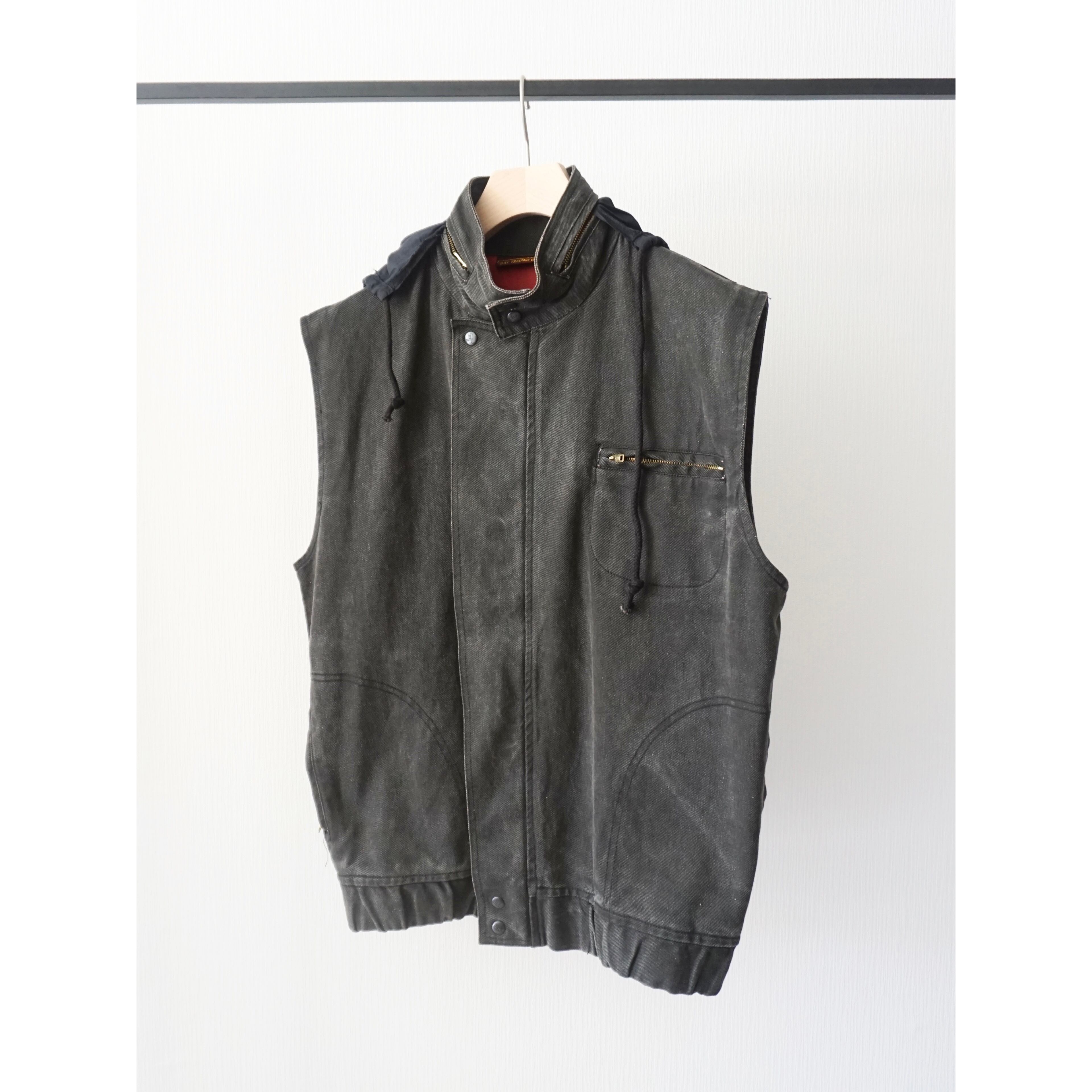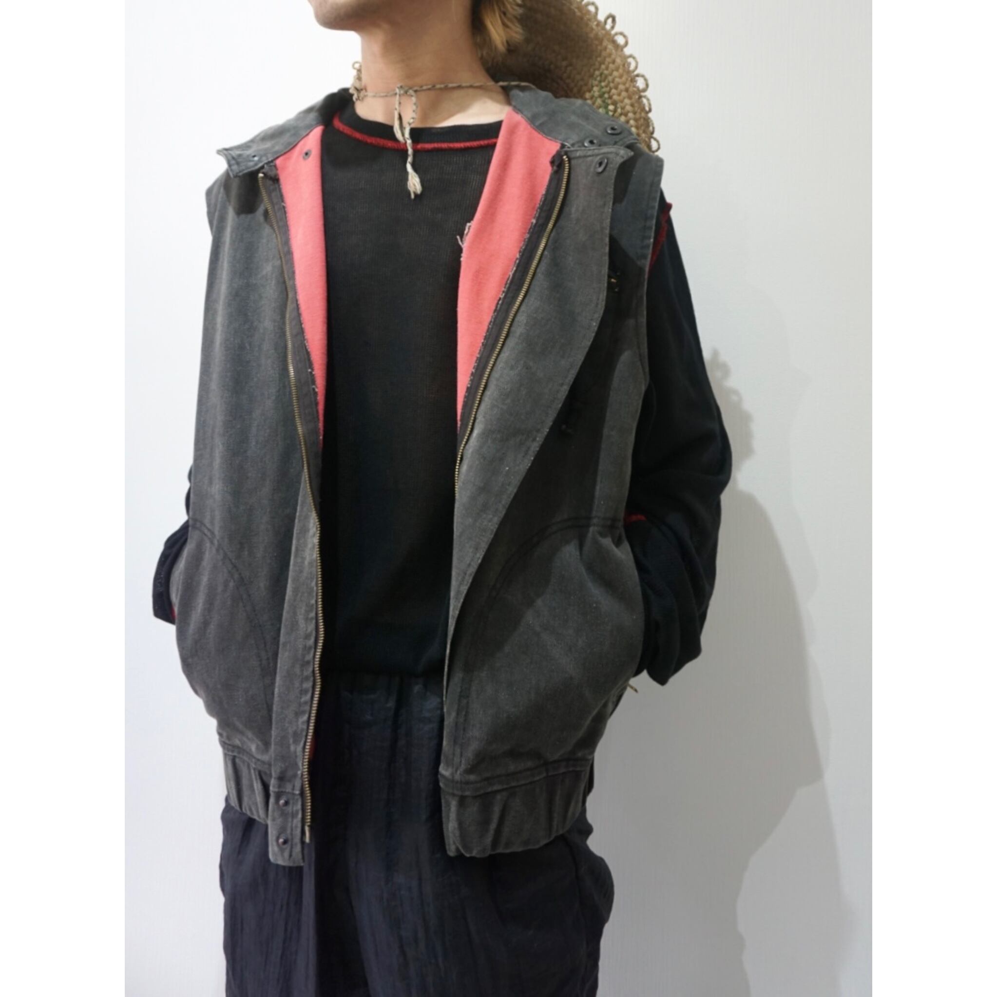 雰囲気良く褪色したブラックデニムで、汎用性高いジップアップ仕様のベストです。