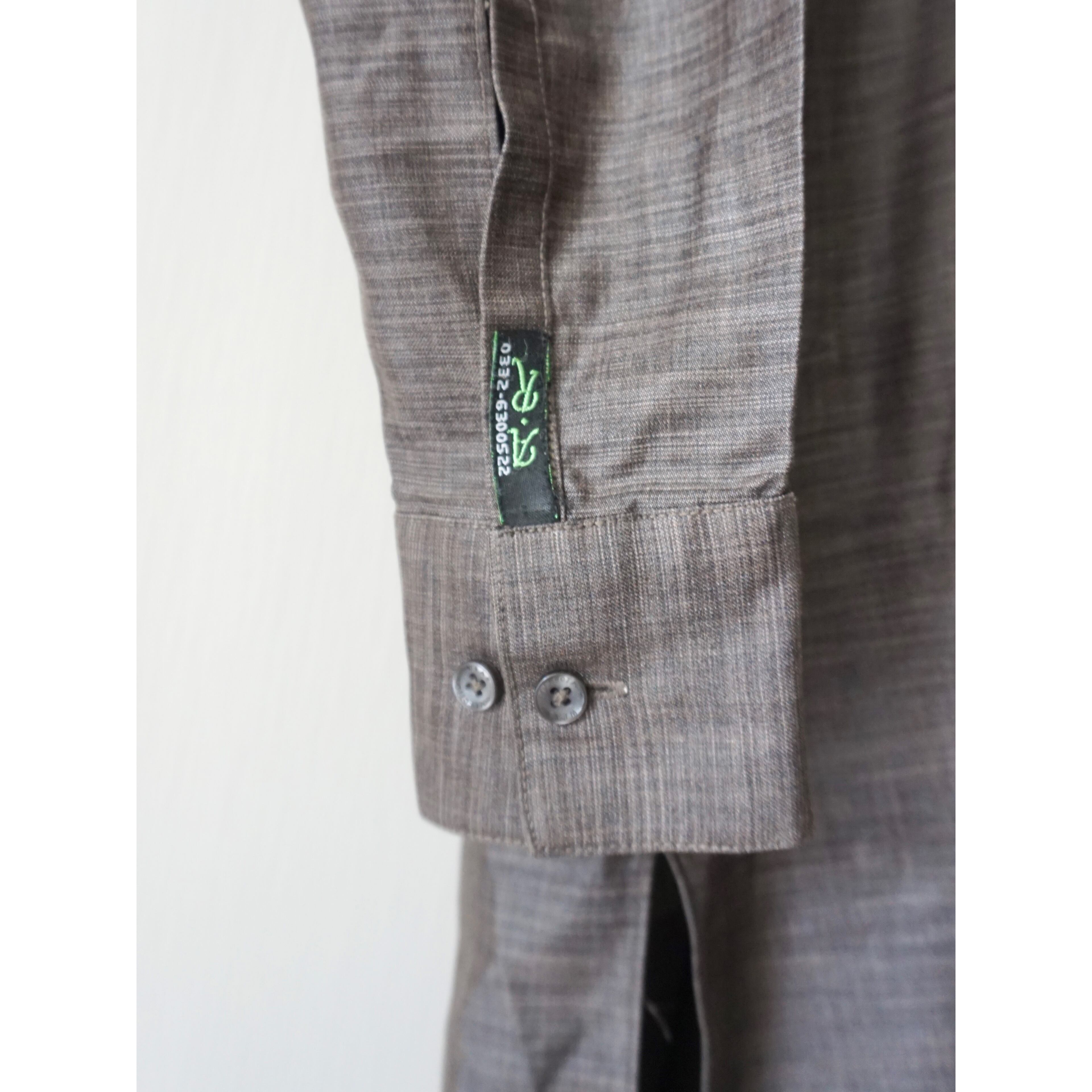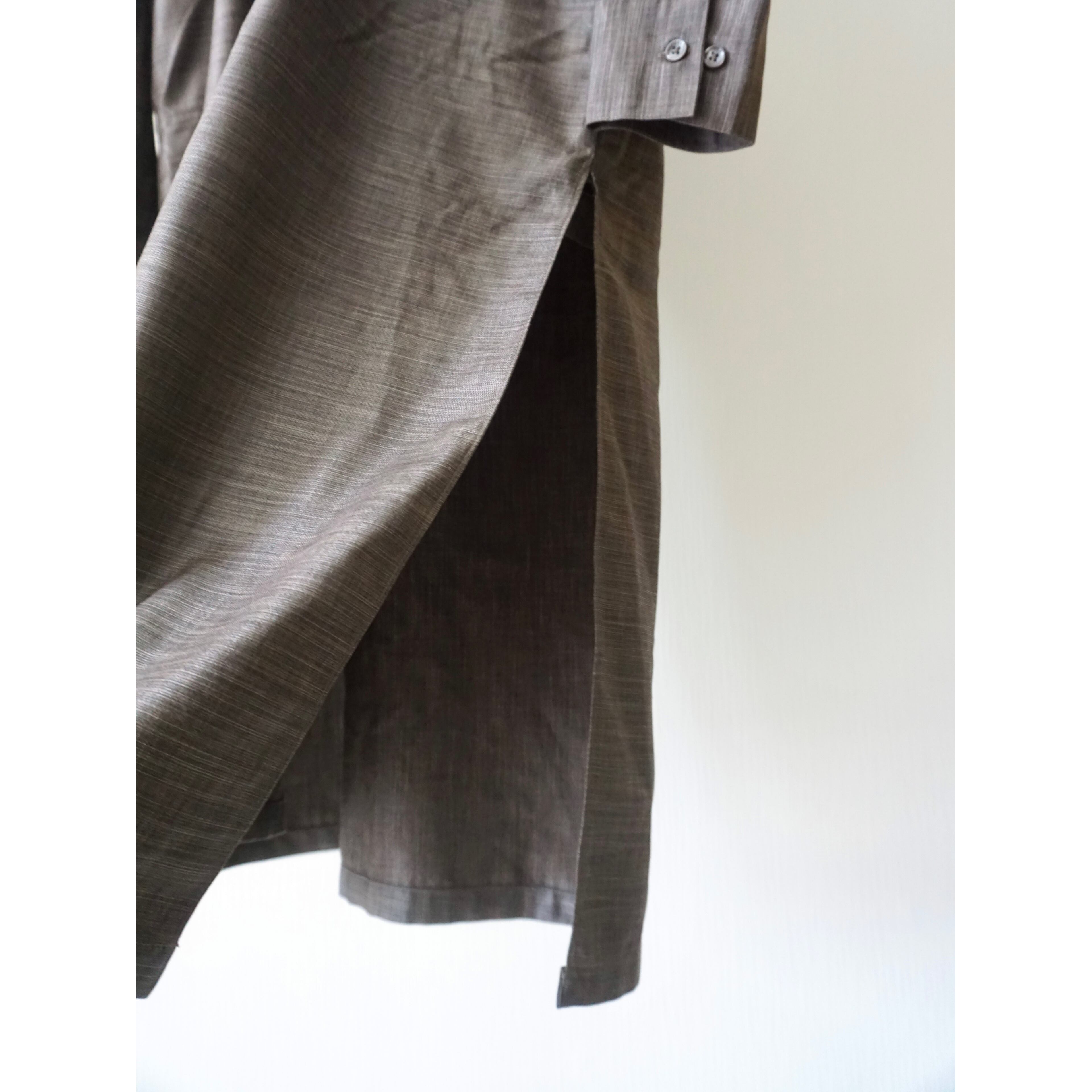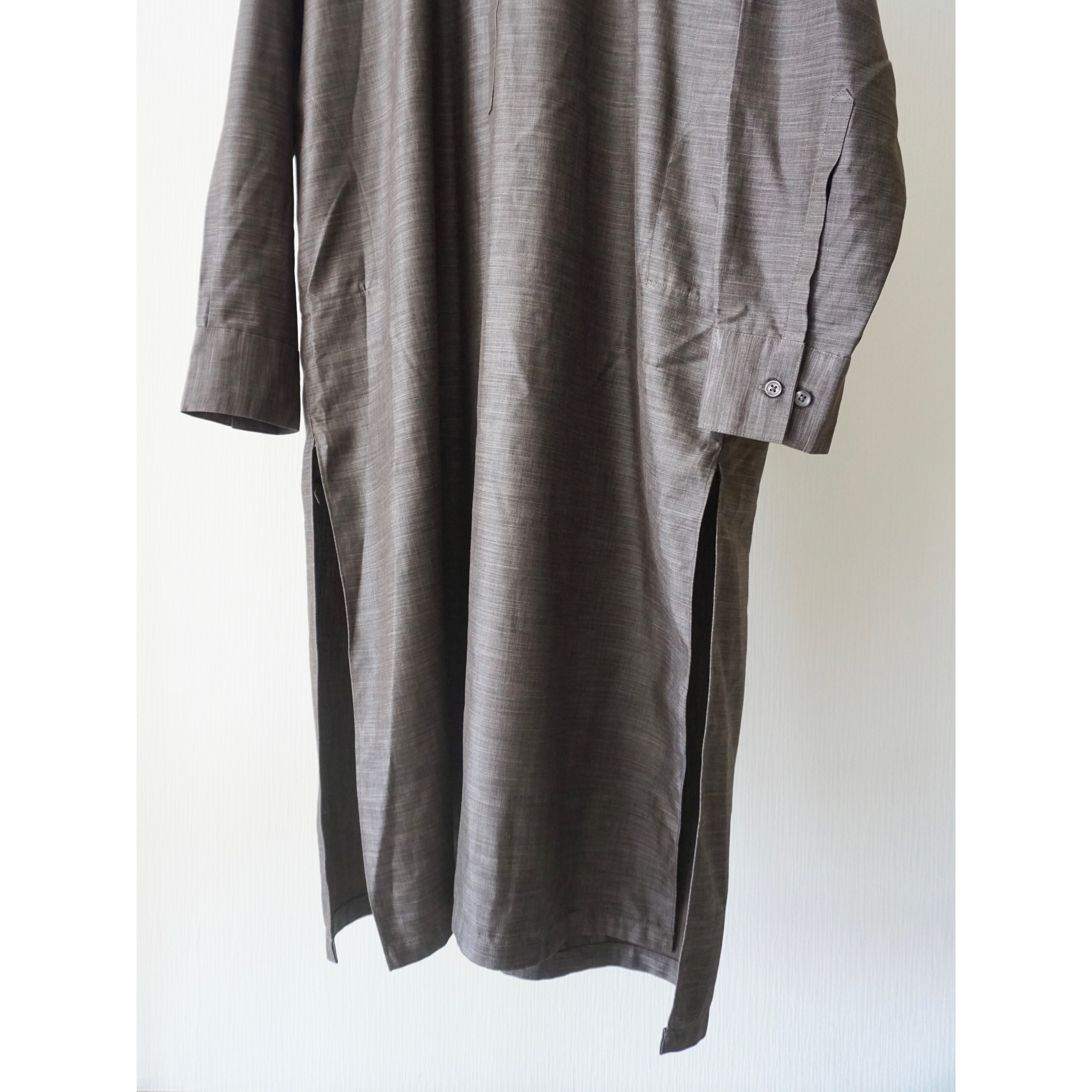 襟元は小柄なバンドカラー仕様で、フロント4ボタンのプルオーバータイプ。