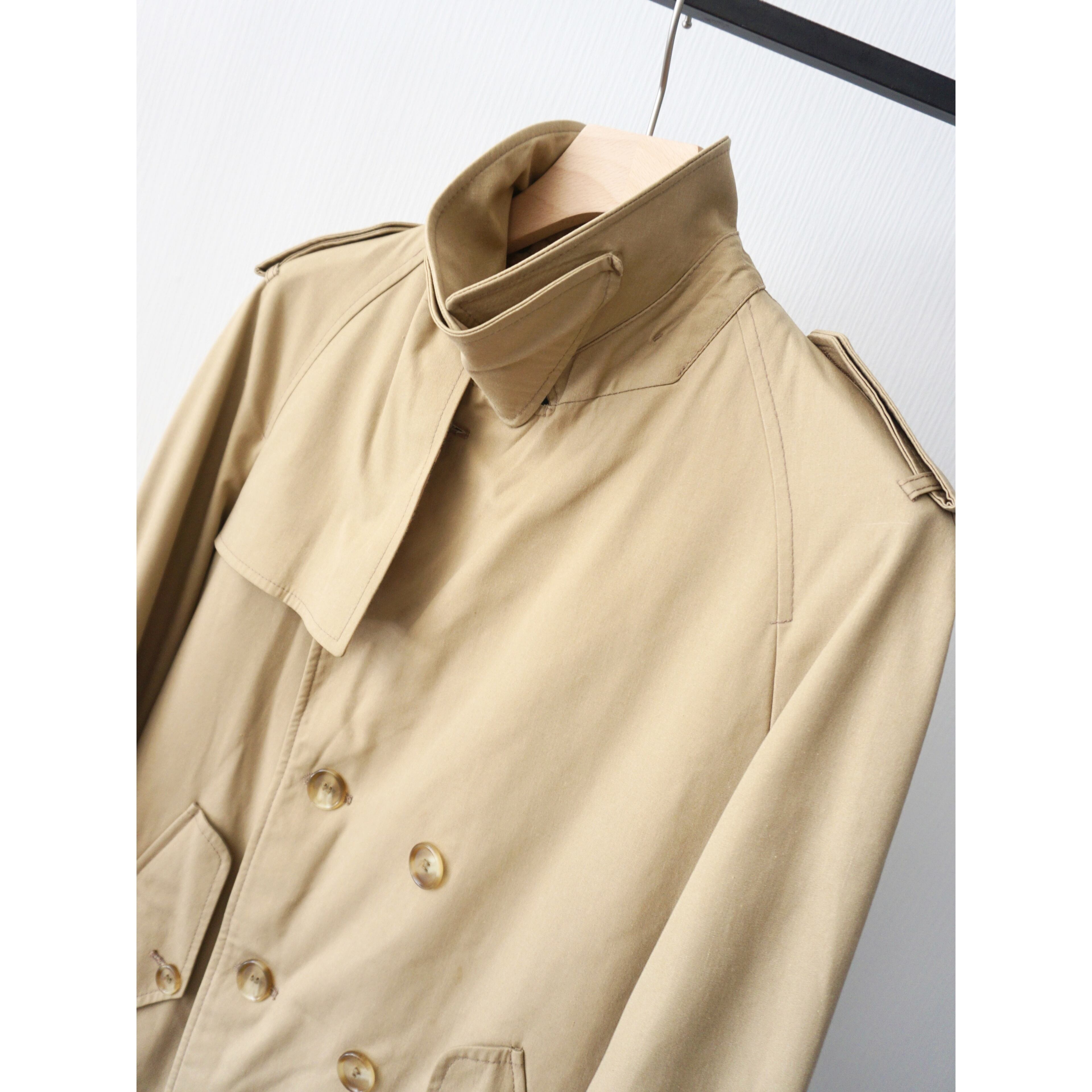 クラシカルなダブル仕様のトレンチコートで、ガンフラップ、エポレット、ヨーク、ベルト付きのチンストラップ、高めの位置に付くウエストベルト等、各所での込んだパーフェクトなディテールです。