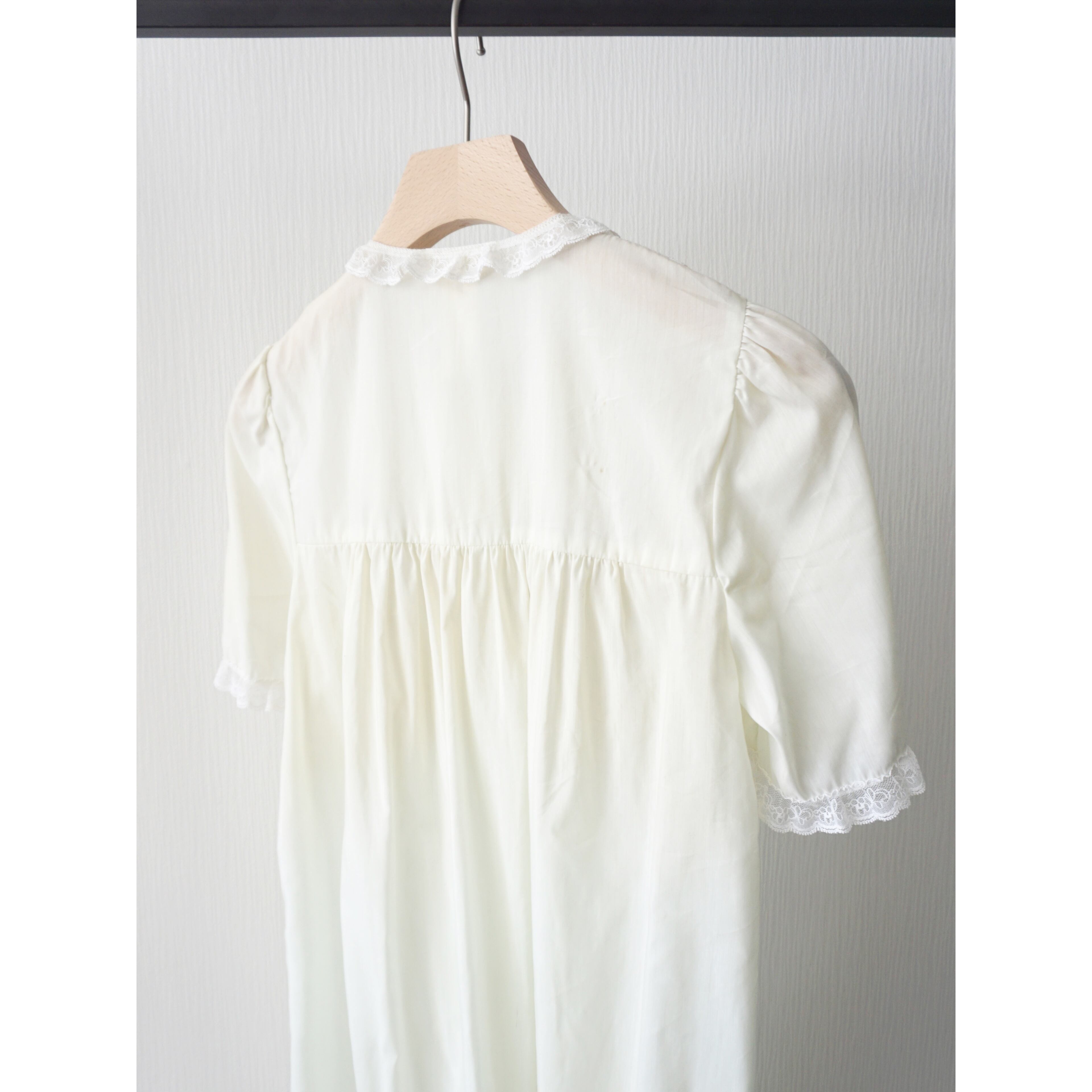 所謂ナイトドレスらしい、繊細で手の込んだ各所のレースデザインやリボン、背面に入るギャザー、素材による透け感がとても可愛らしい一着です☺︎