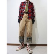 レッド×ネイビーベースにさり気なくホワイト、イエローのラインが混ざる秋冬らしいチェックパターンがgoodです。年代らしい特徴的な襟やほんのりラウンドした裾も◎