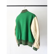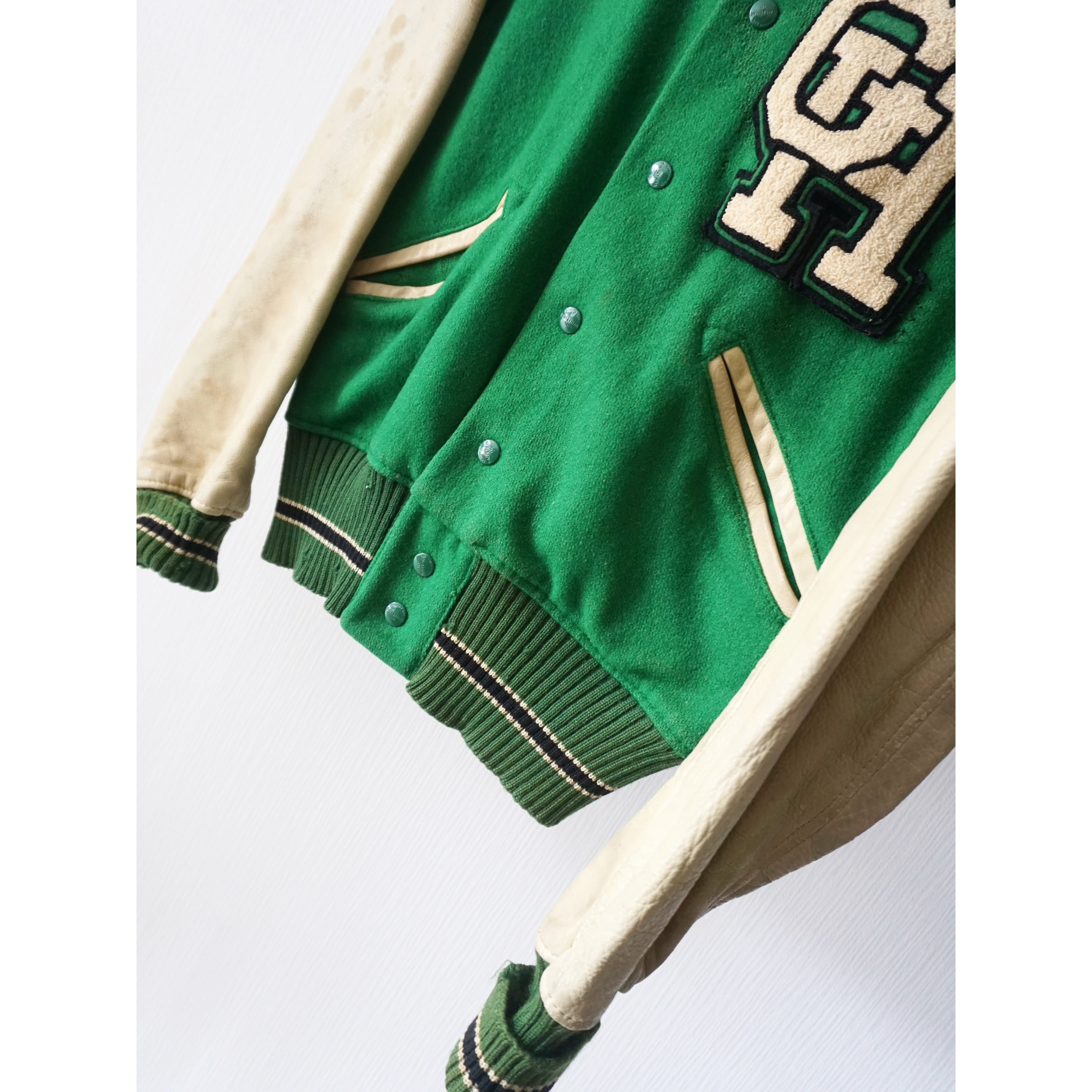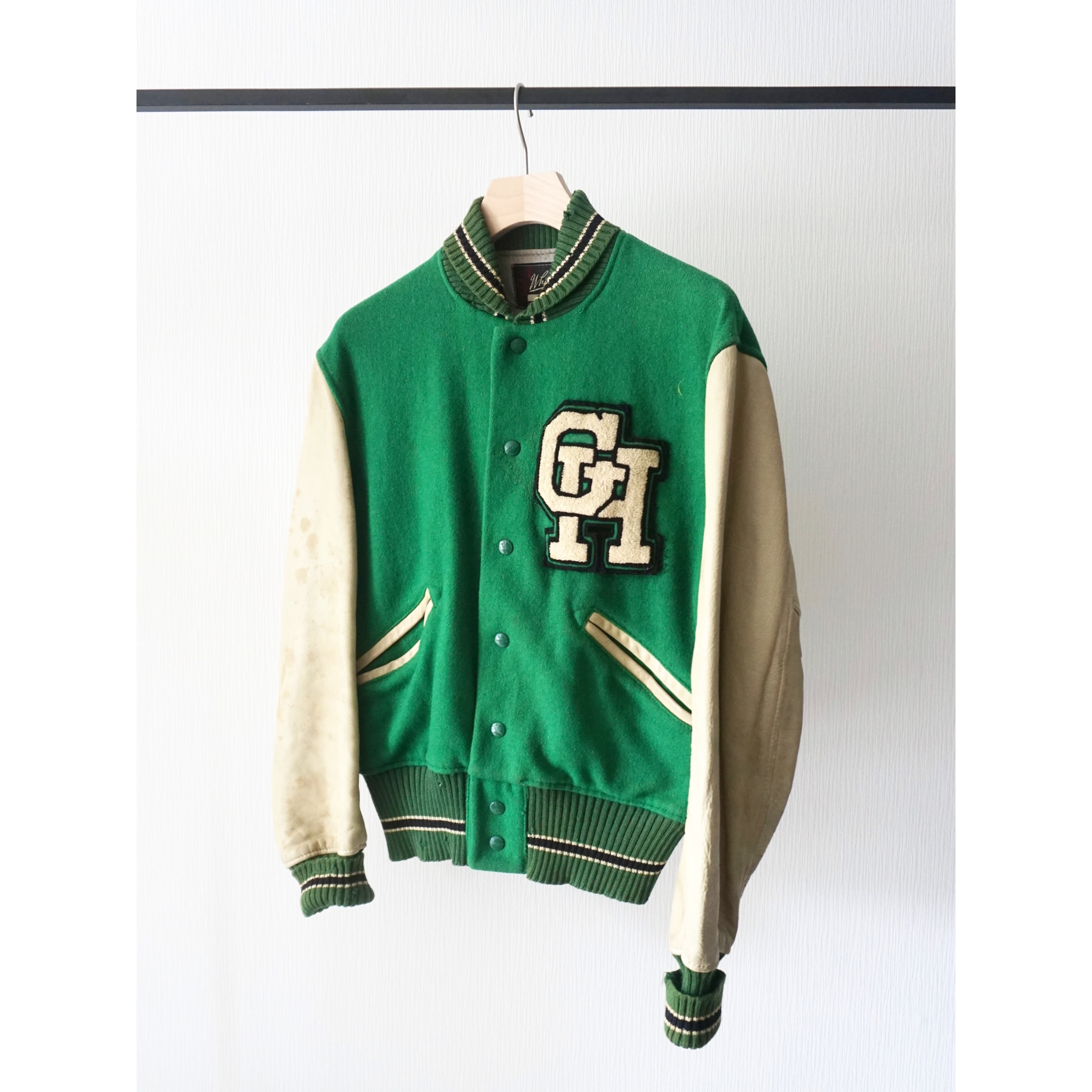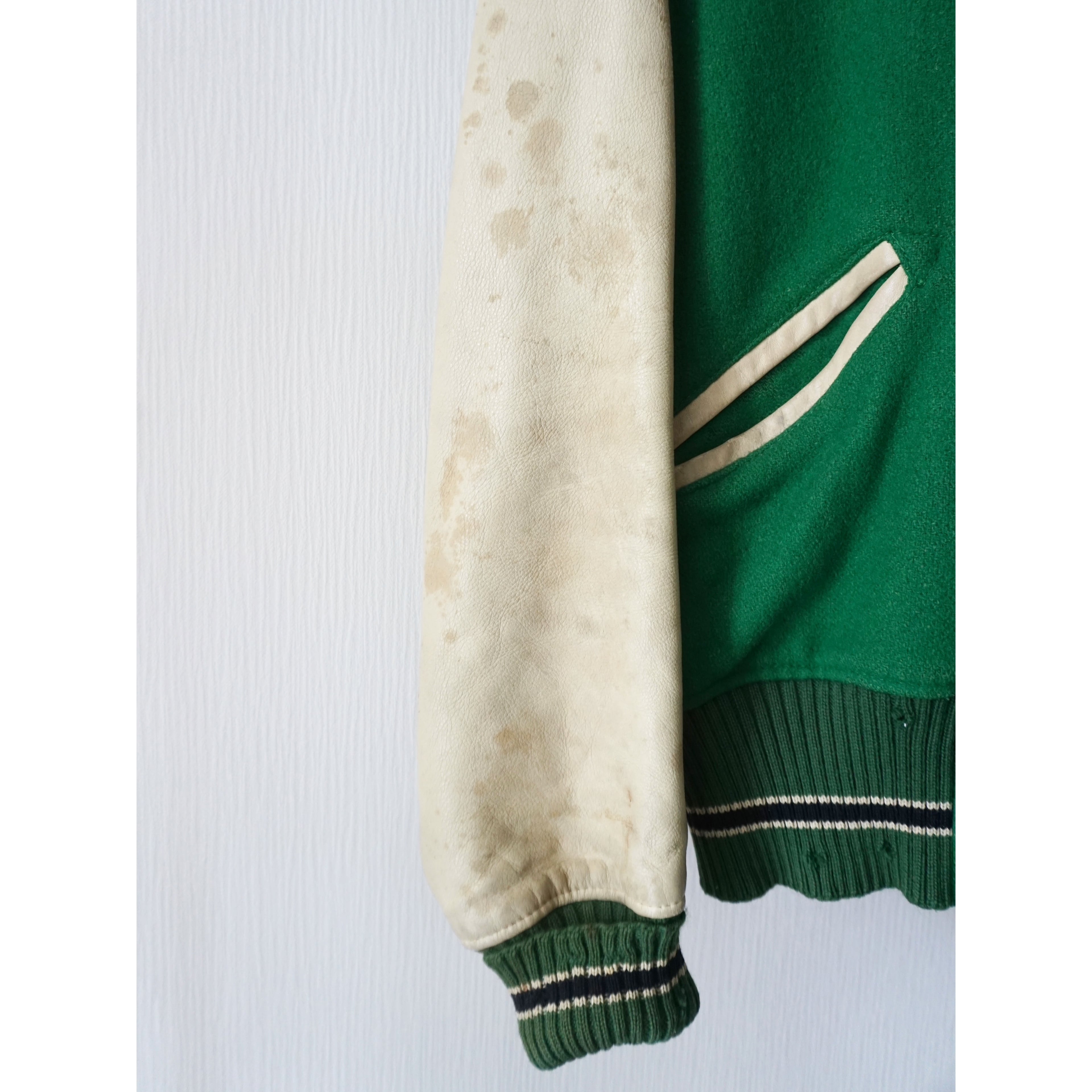 使い勝手の良いグリーンのメルトンウールに袖はベージュ系のレザーでのスタジャン。古い年代らしい特徴的なヘチマ襟、袖、裾共に長めなリブ等のディテールも◎