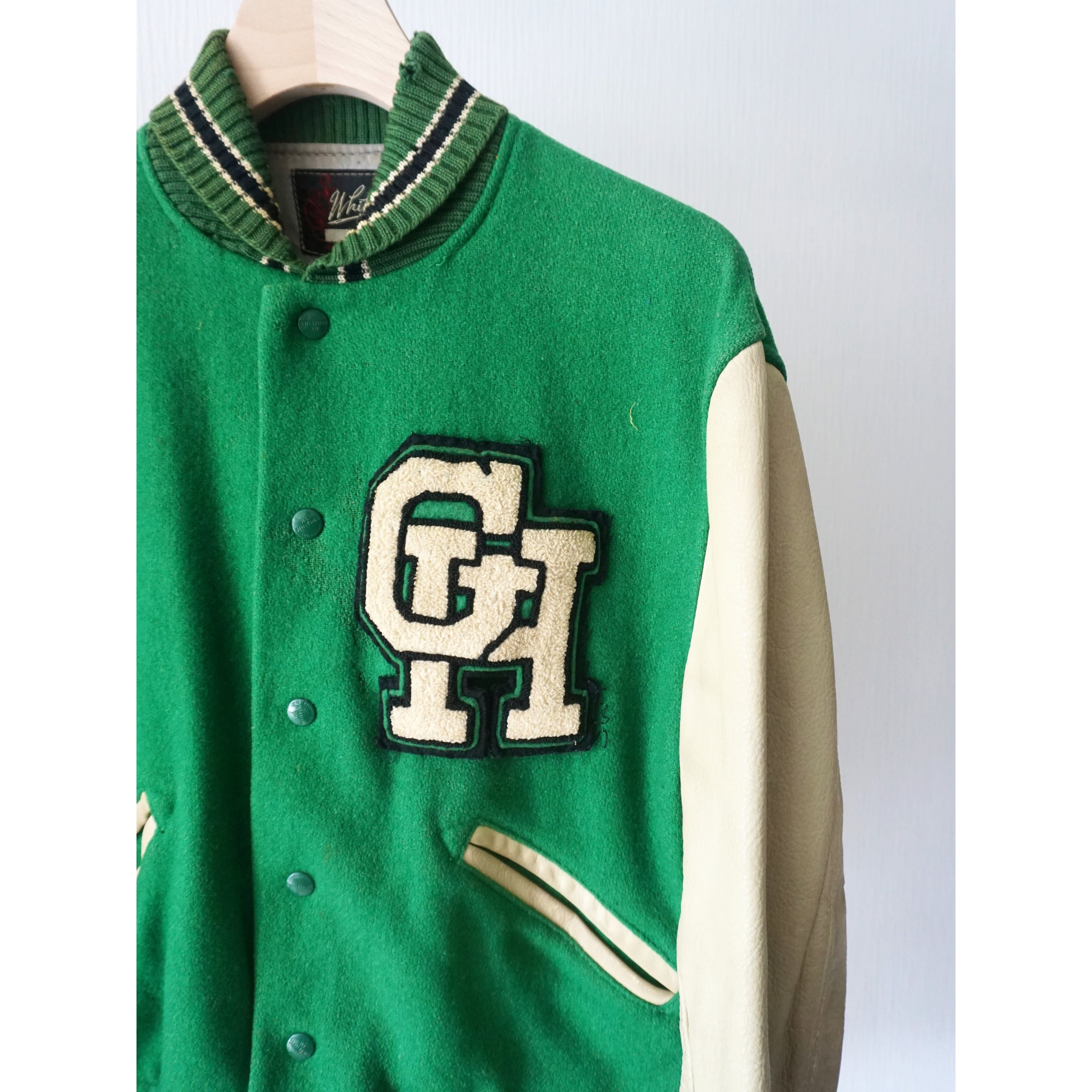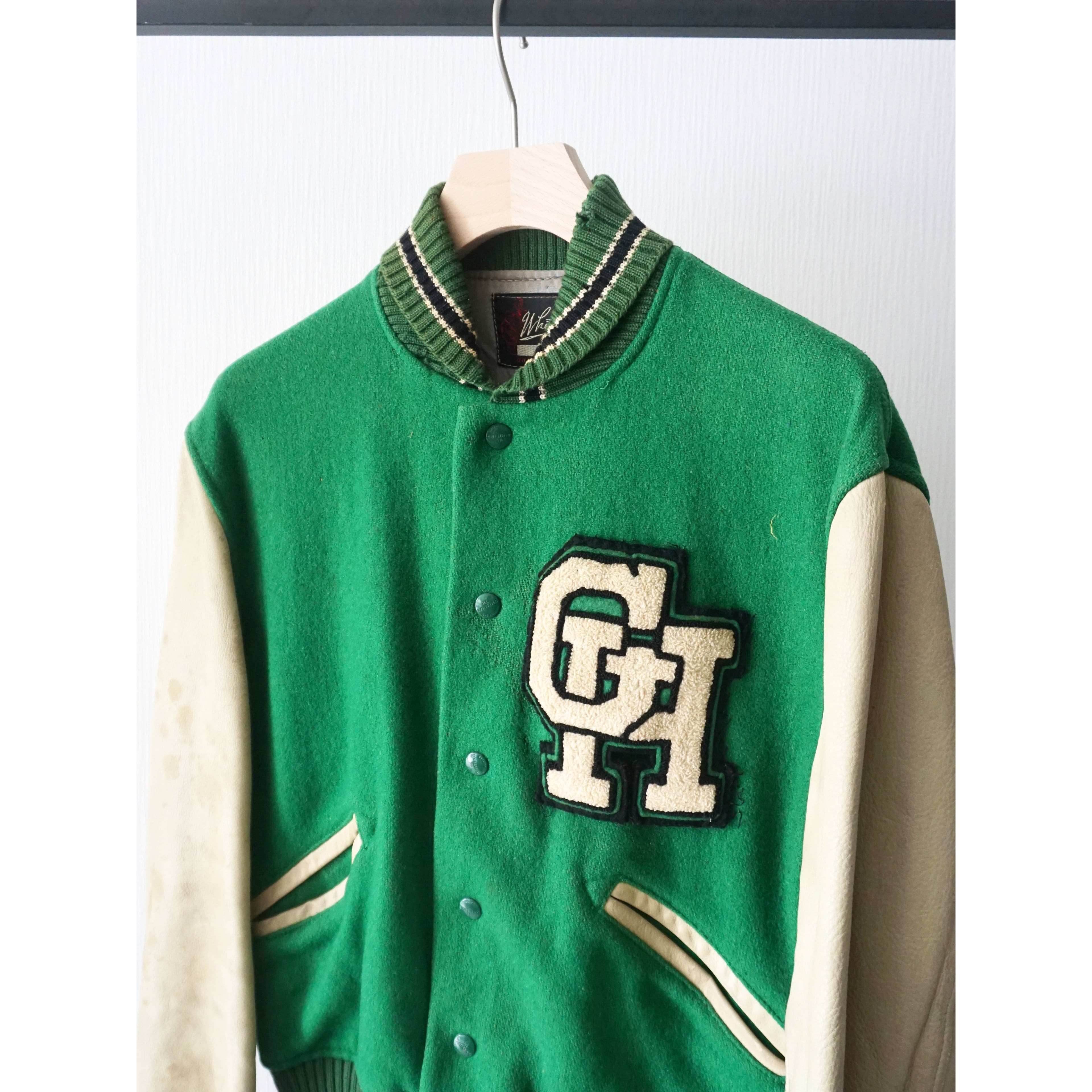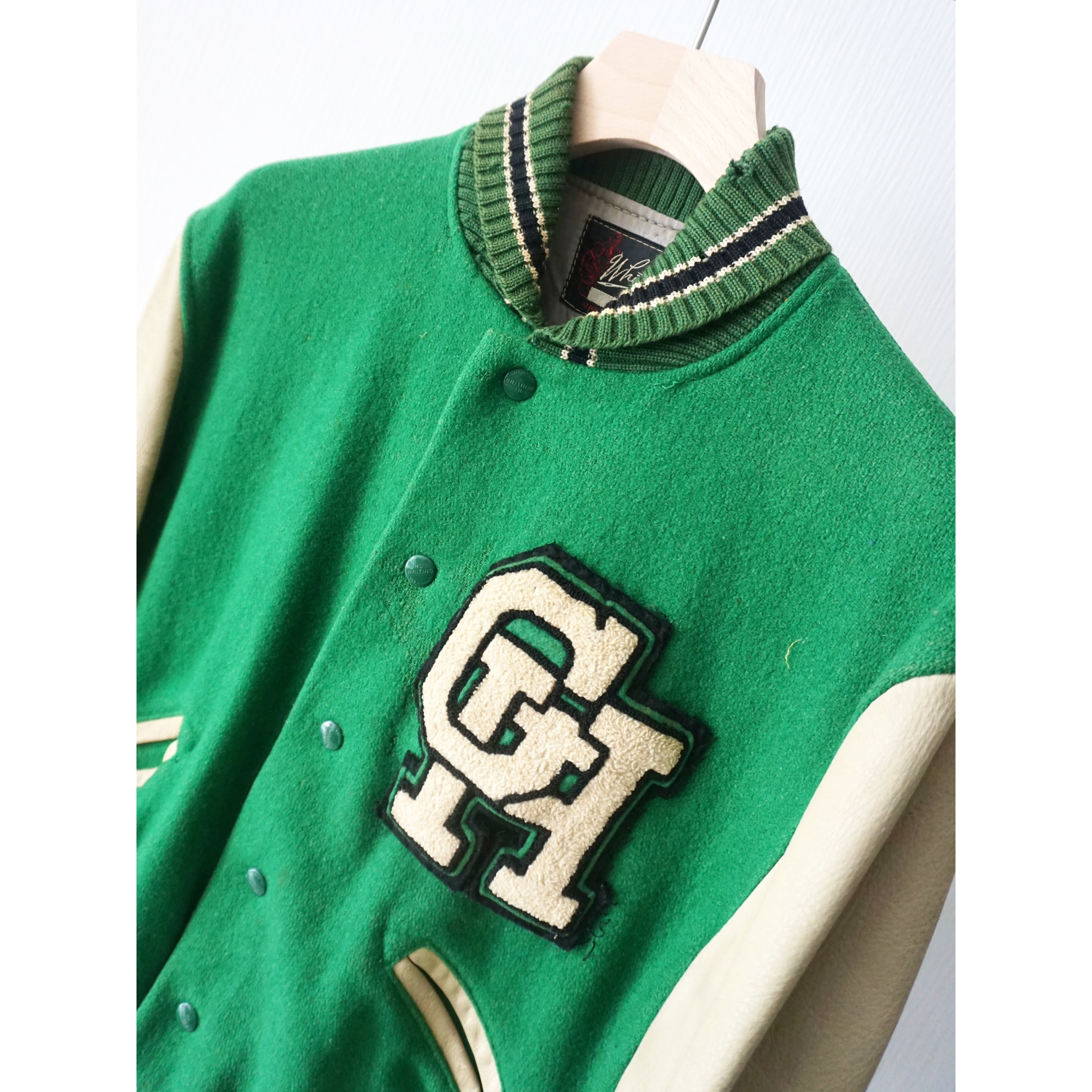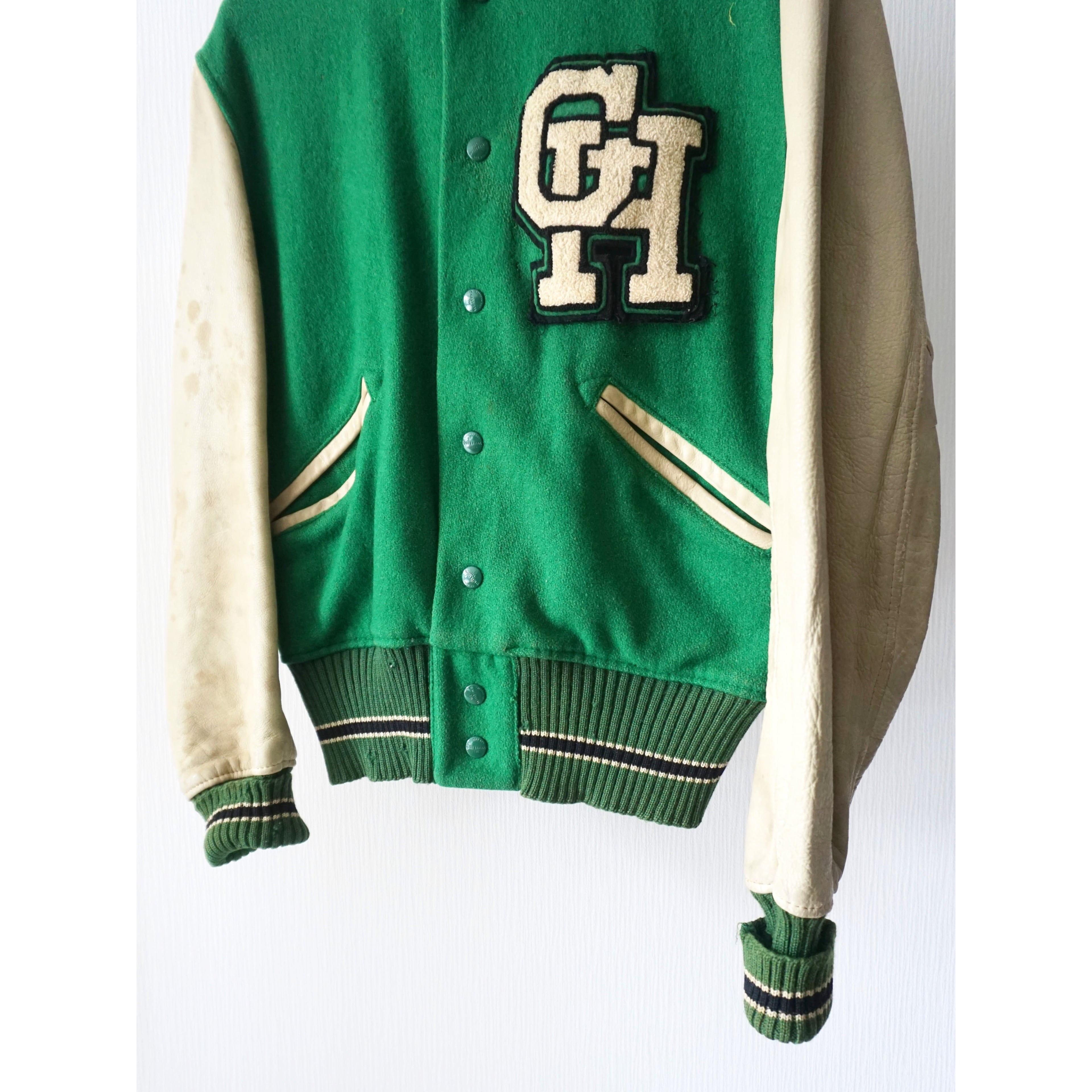 使い勝手の良いグリーンのメルトンウールに袖はベージュ系のレザーでのスタジャン。古い年代らしい特徴的なヘチマ襟、袖、裾共に長めなリブ等のディテールも◎