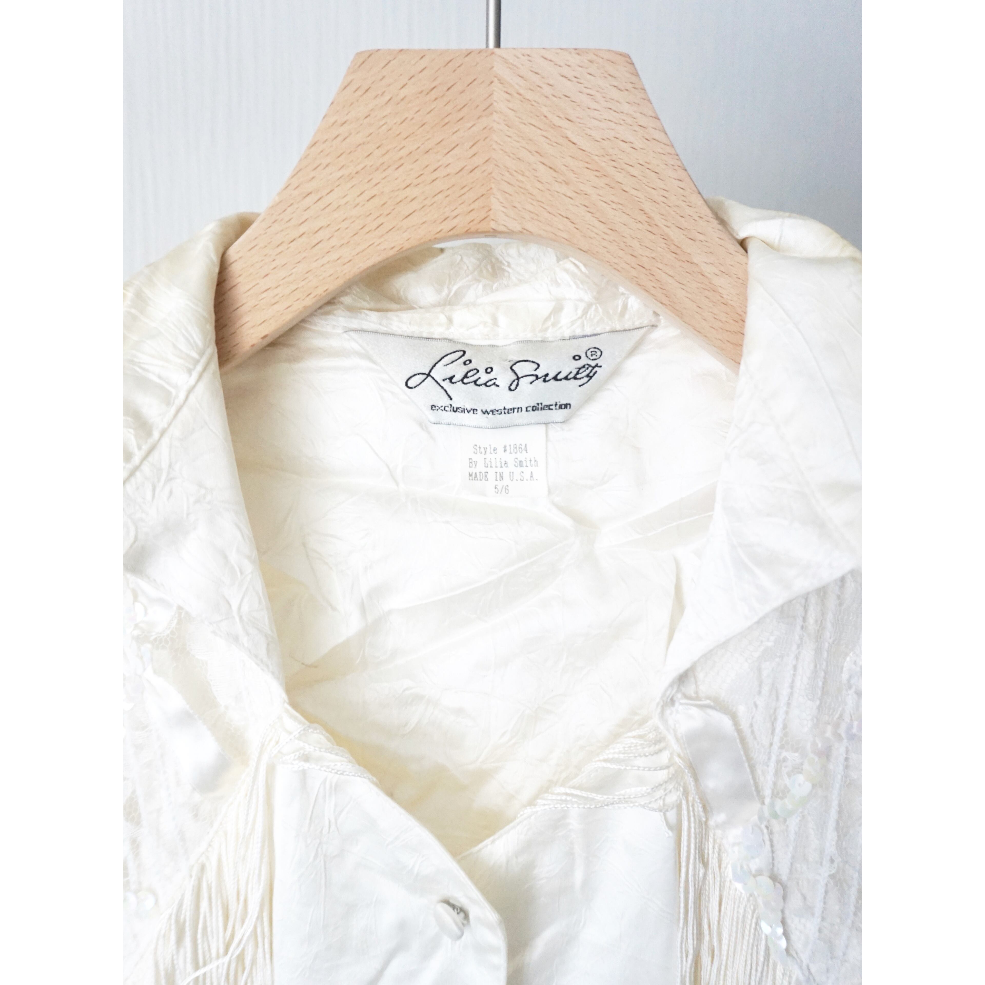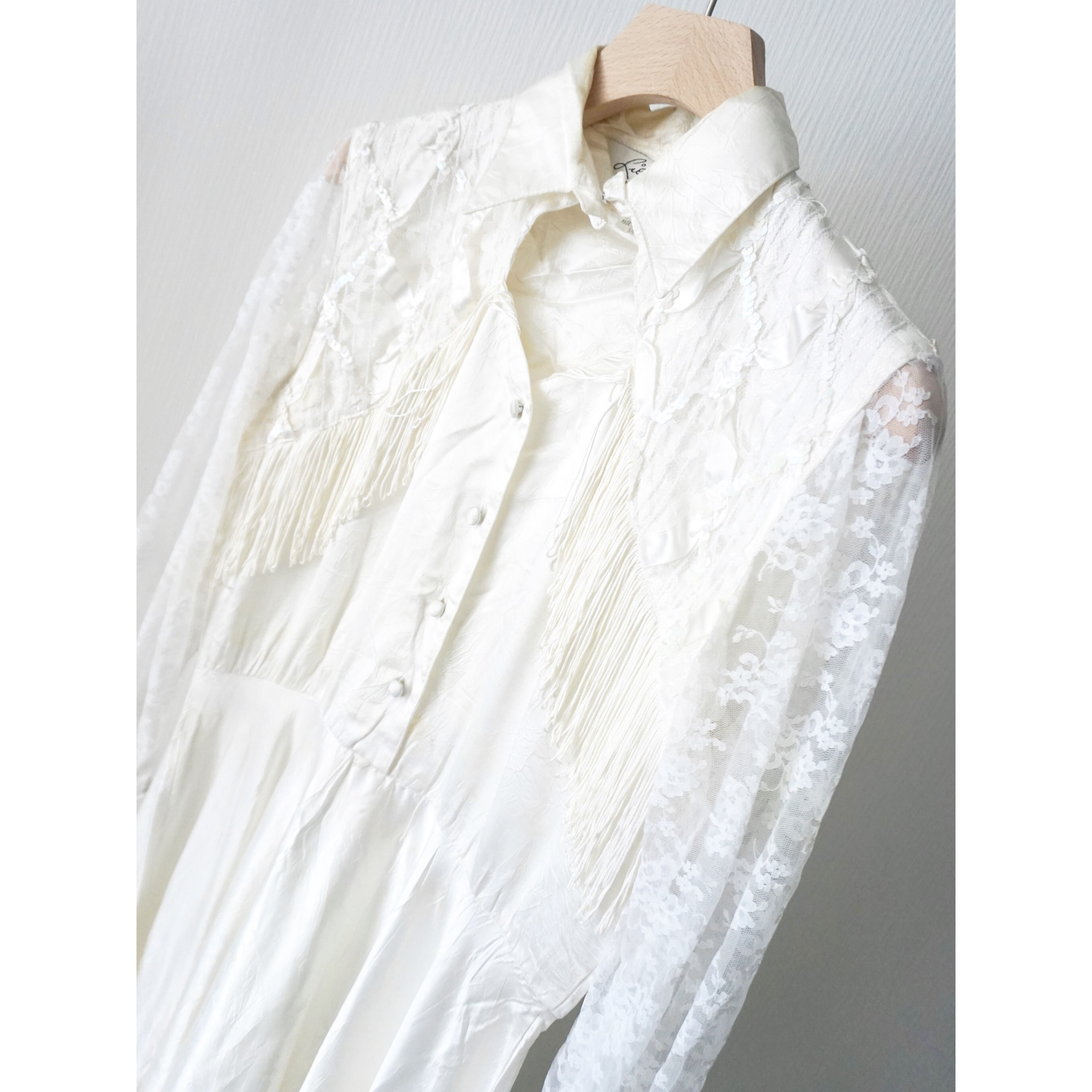 袖はレースがあしらわれたシースルー生地での切り替え、フロント、背中部分にもレース、リボン、スパンコール、フリンジ等、ヴィンテージならではな贅沢で繊細な装飾がめちゃくちゃ素敵です♪