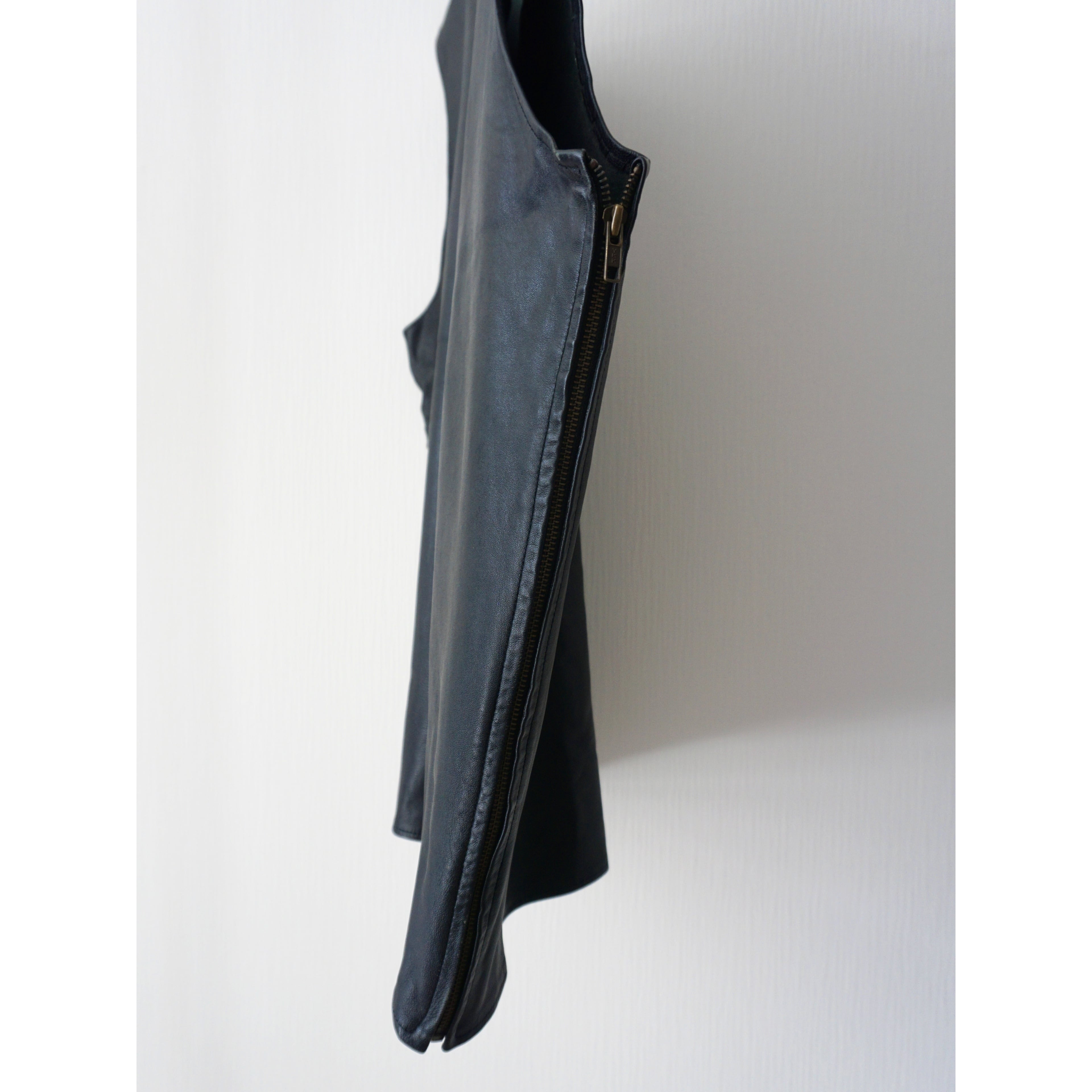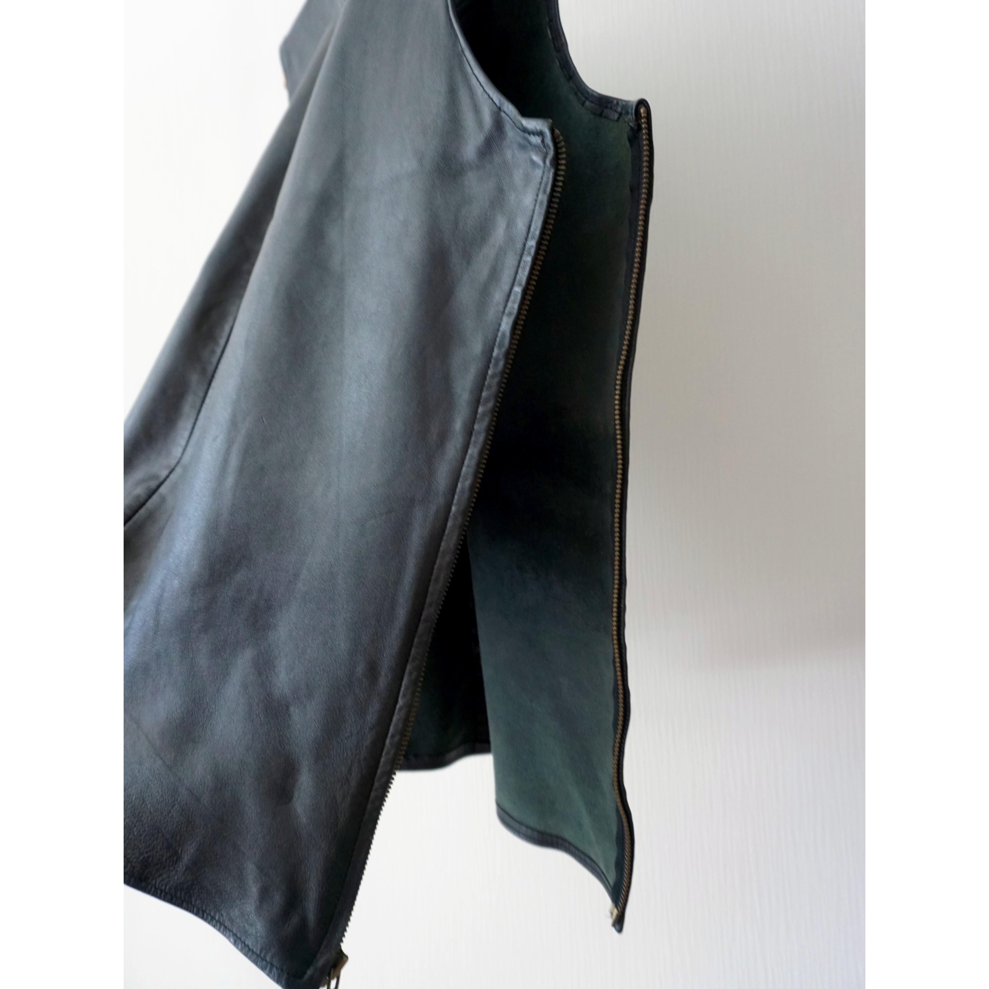 更には片側がジッパーで開閉できる、着脱、レイヤードの際にも全くストレスを感じさせない気の利いた仕様。加えてレザーベストでありがちな小さすぎる事なく、アームホール、身幅もしっかりとられたサイズ感も抜群に良い一着です。