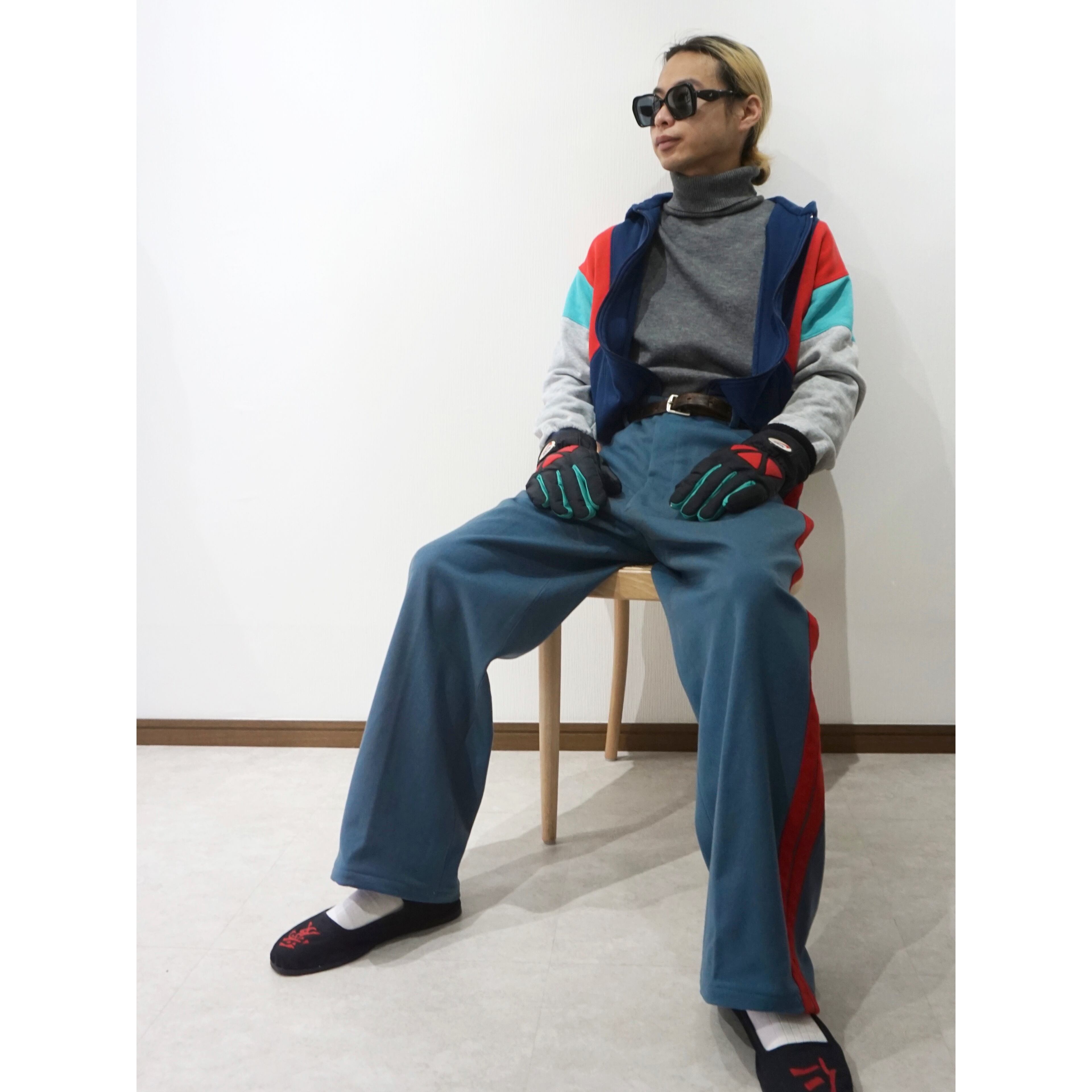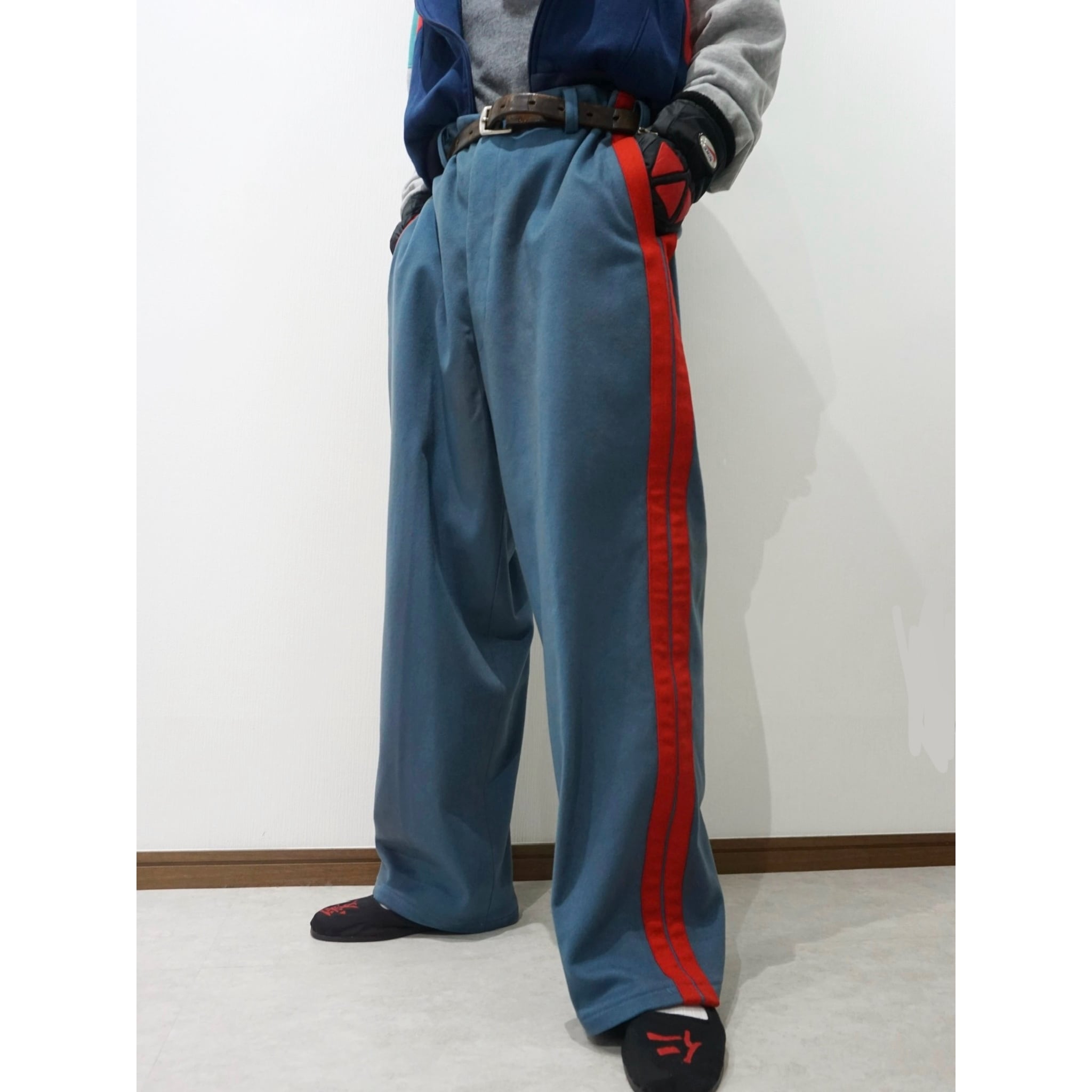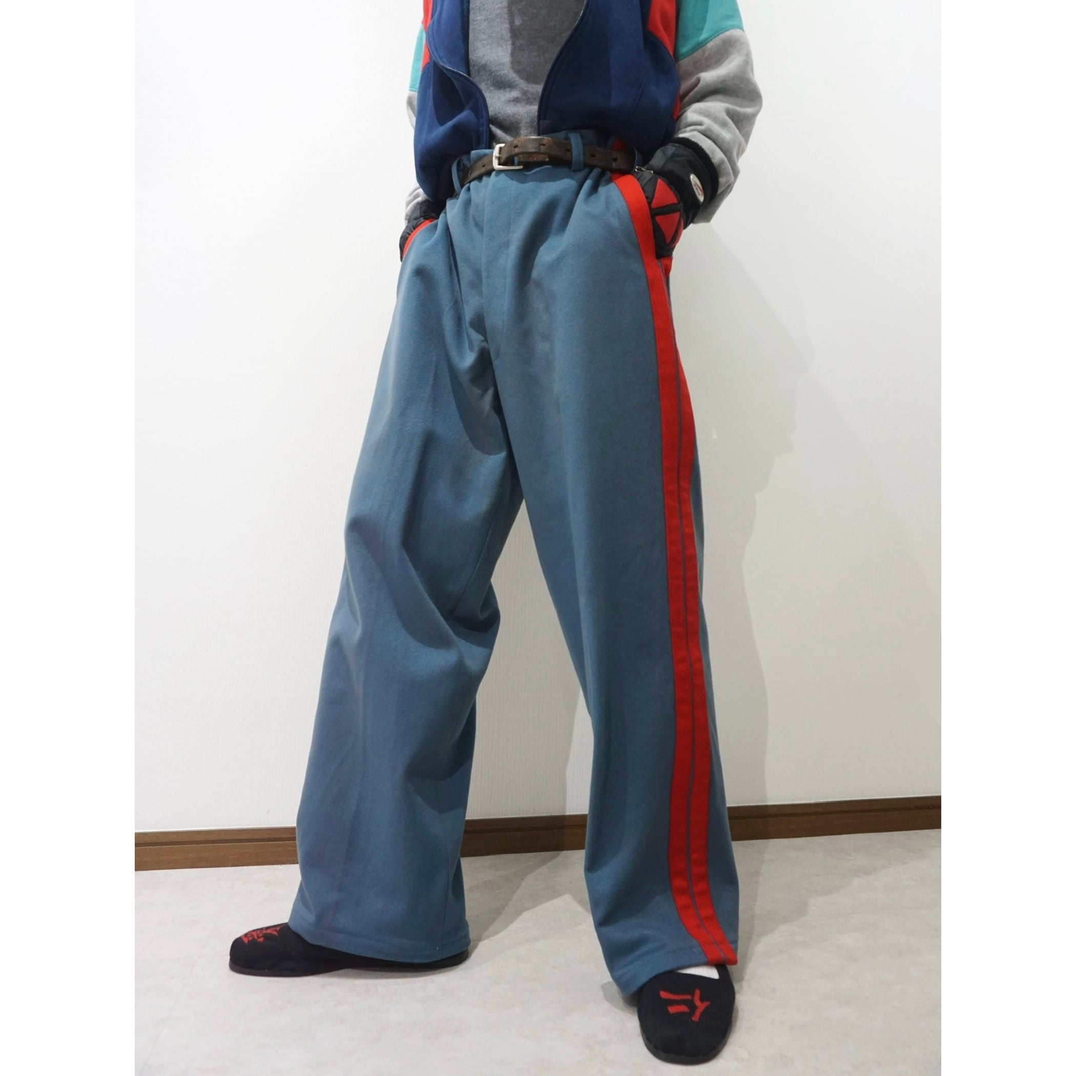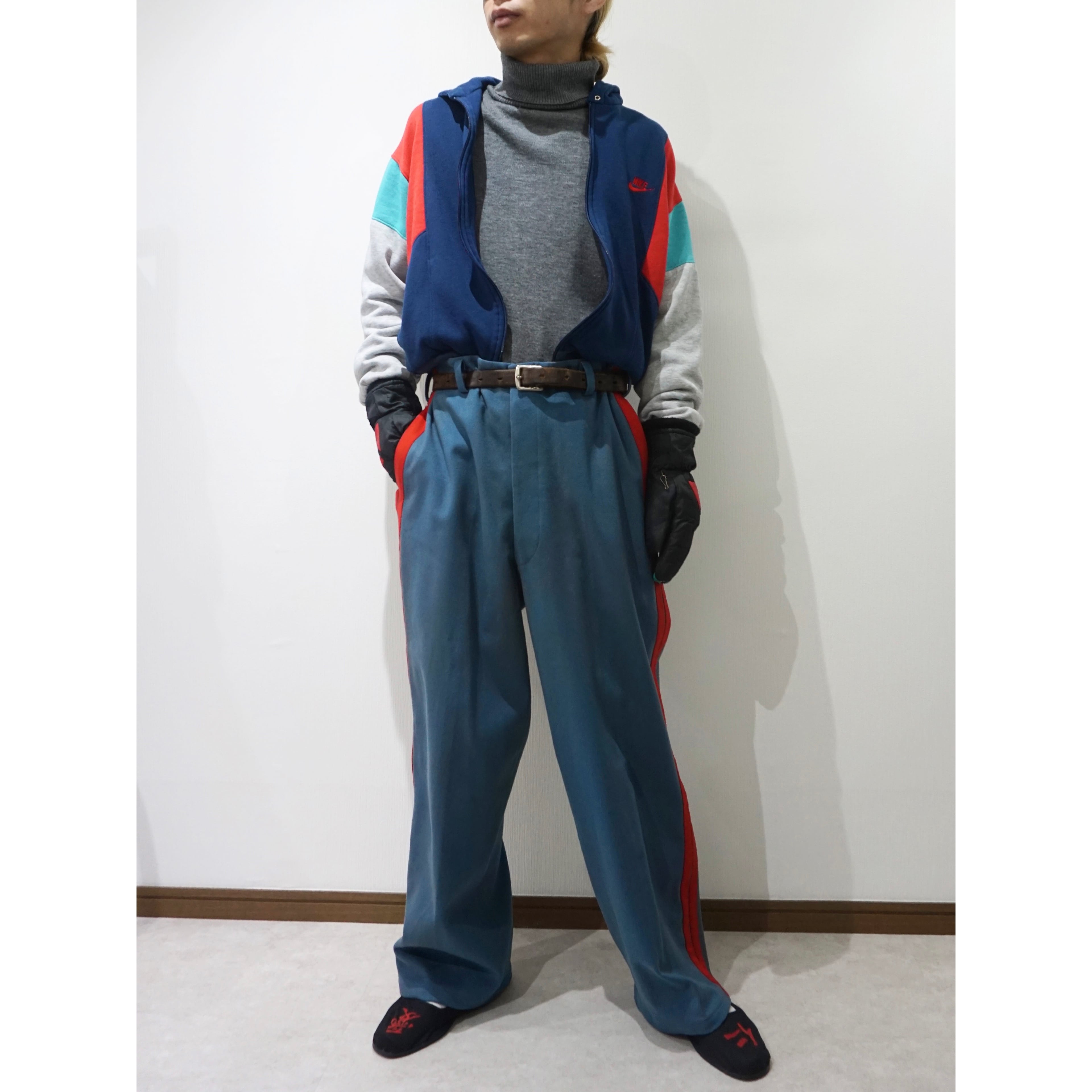 風合いのとても良いくすんだ水色のウール地に両サイドにレッドのラインが最高なパンツ。
