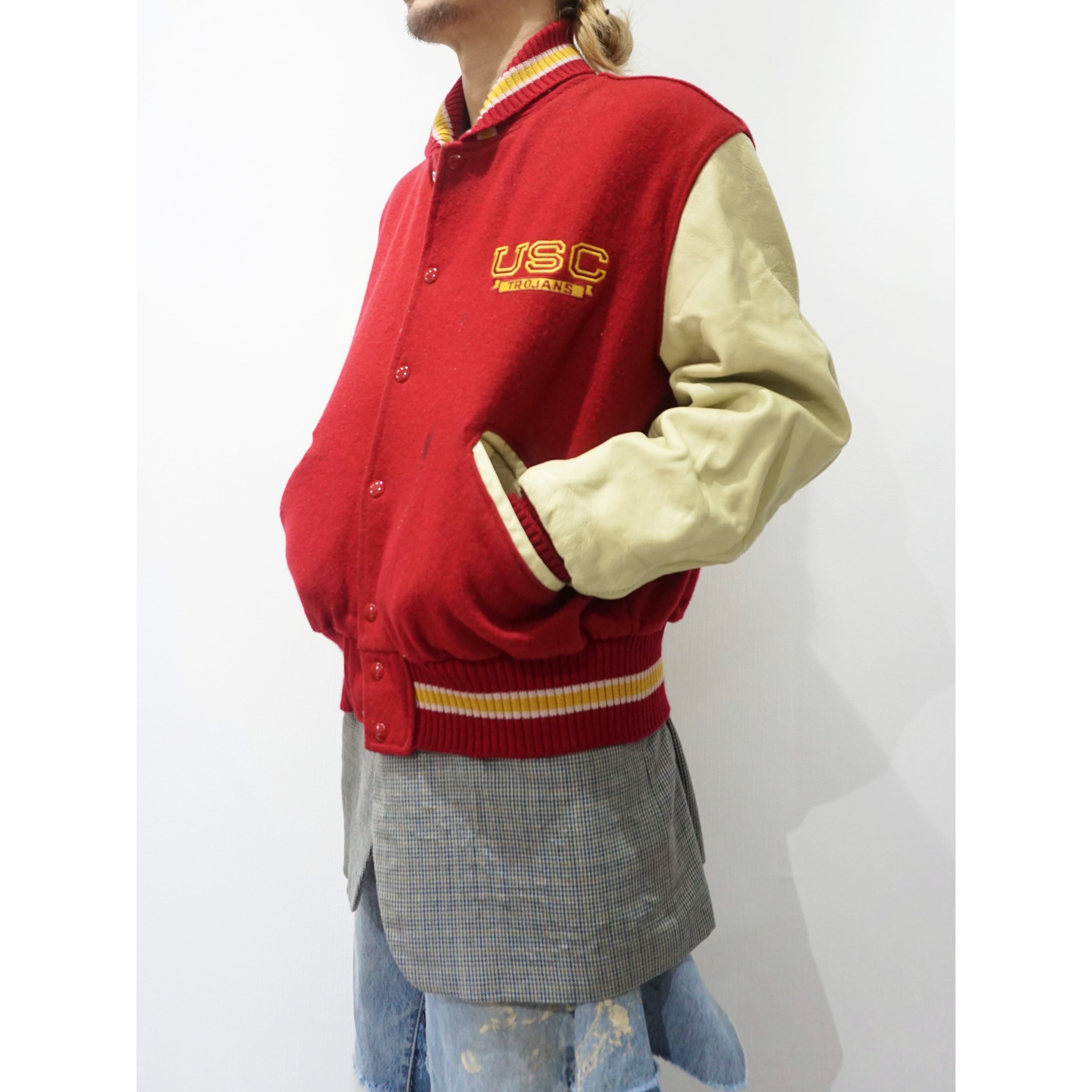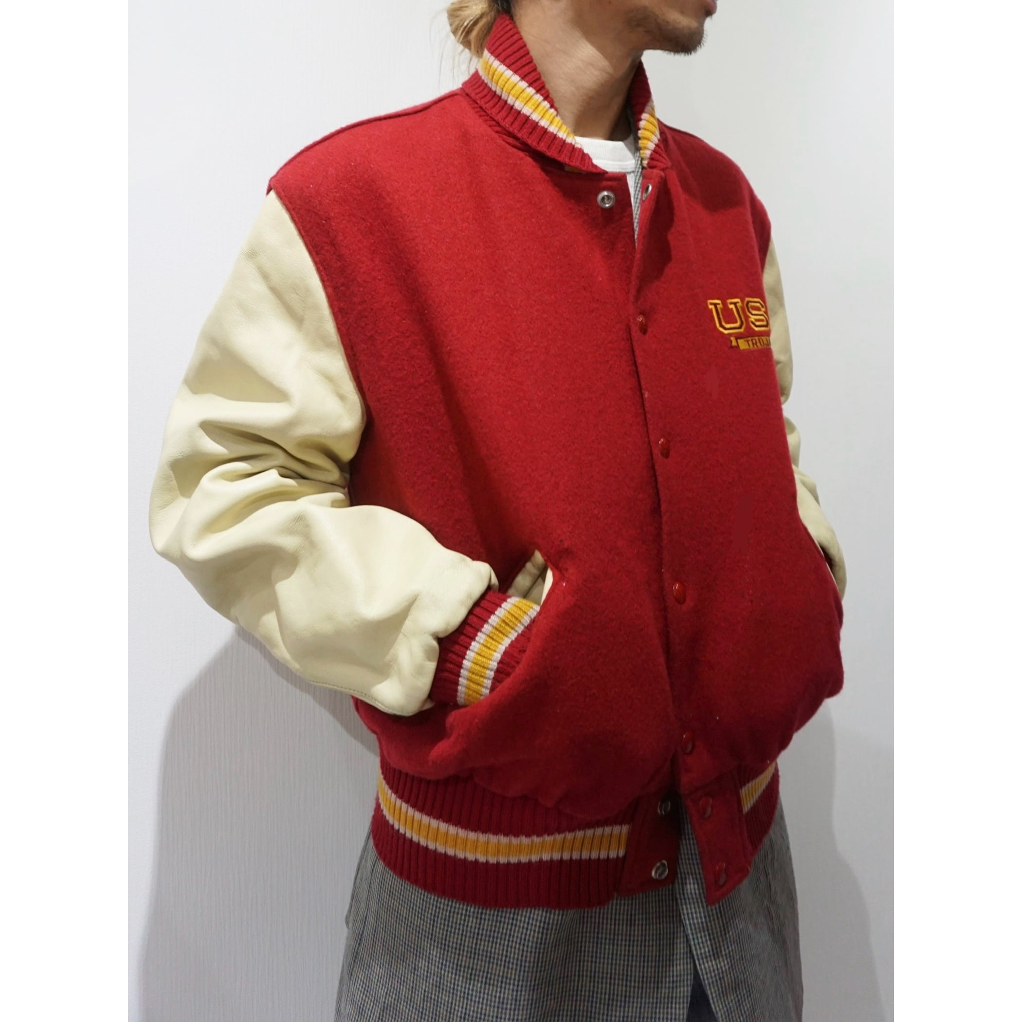 ややエンジがかる落ち着いたトーンのレッドカラーのメルトンウール×ナチュラルなベージュレザーのスタジャン。左胸にはありがちなワッペンでは無く、(University of Southern California) USC TROJANSのロゴが配色良いイエローでの刺繍で入ります。