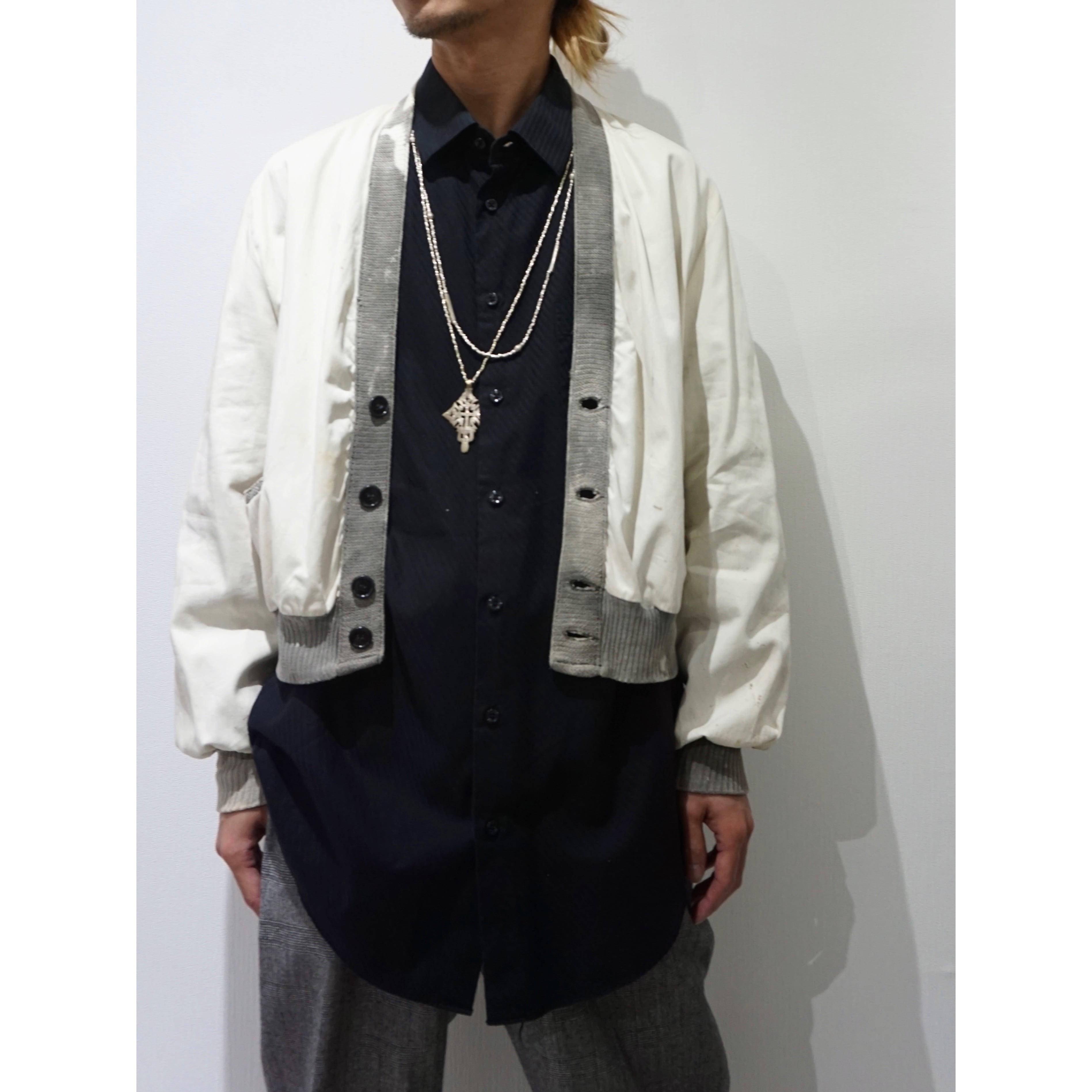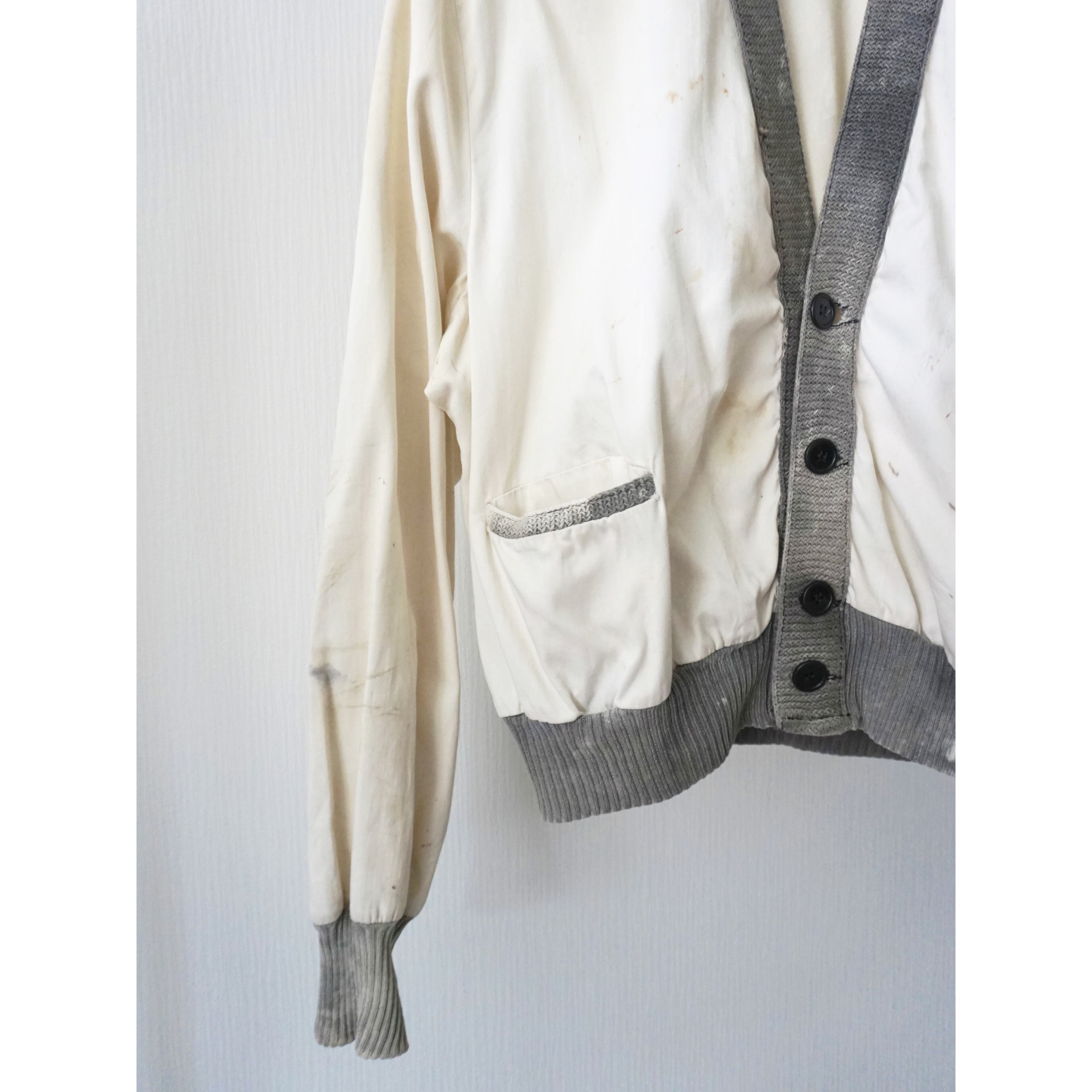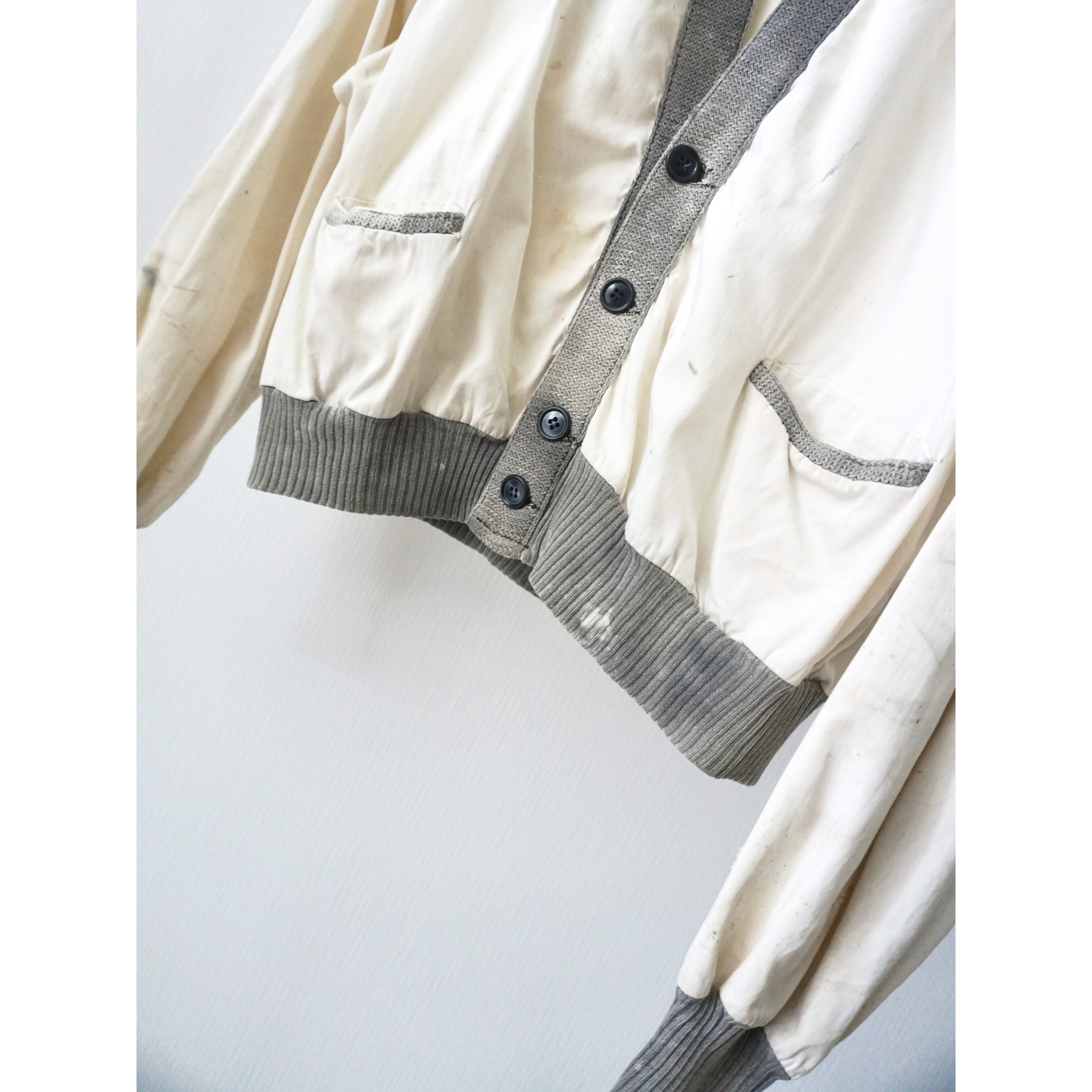 ナチュラルなホワイトカラーの目の細かなサラサラとしたコットン生地をベースに、裾や袖、襟からボタン部分までをざっくり編んだライトグレーでのコットンで切り替えられた、中々に見かけない仕様のカーディガンとなります。