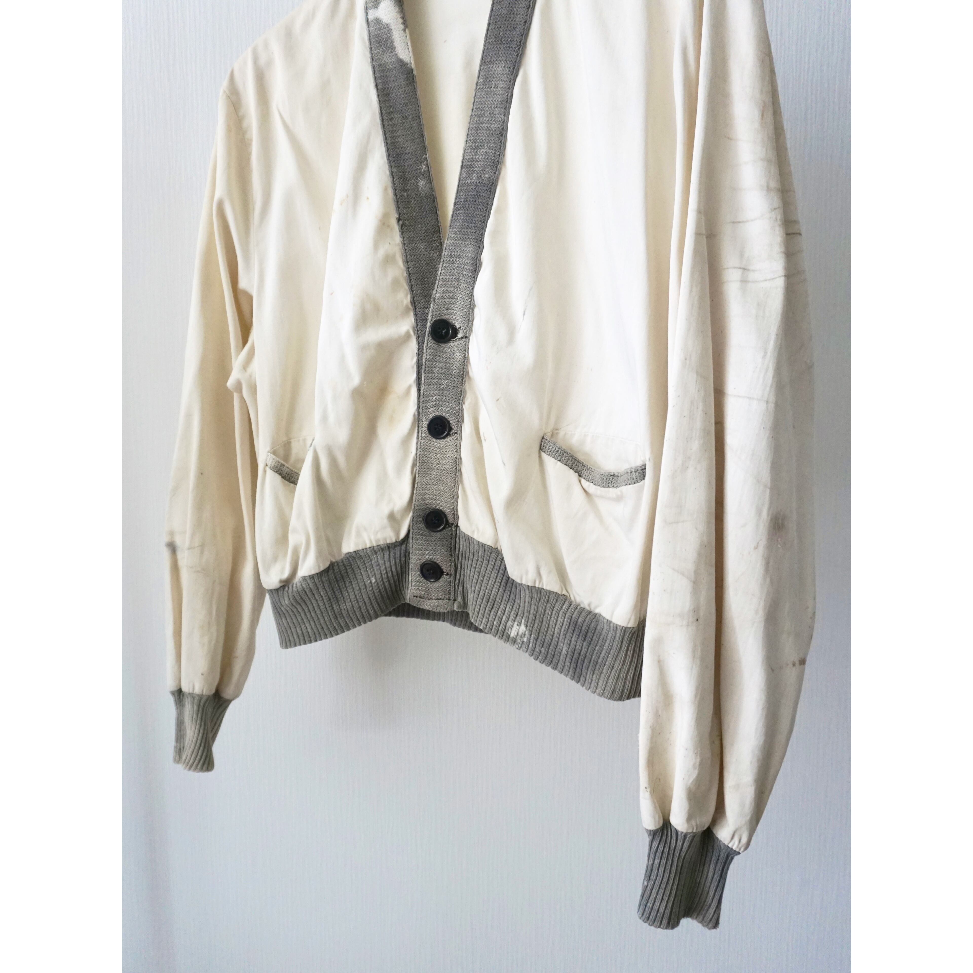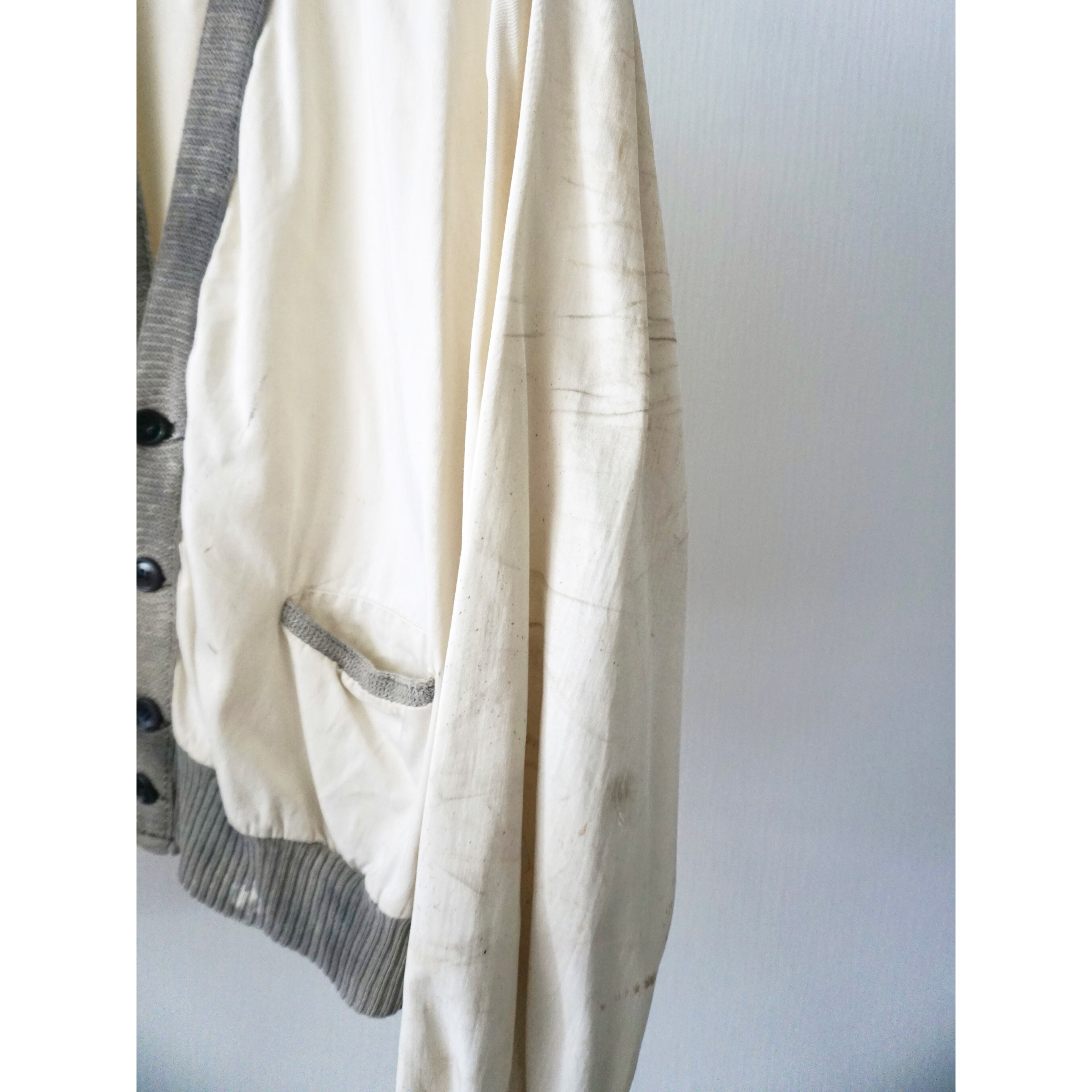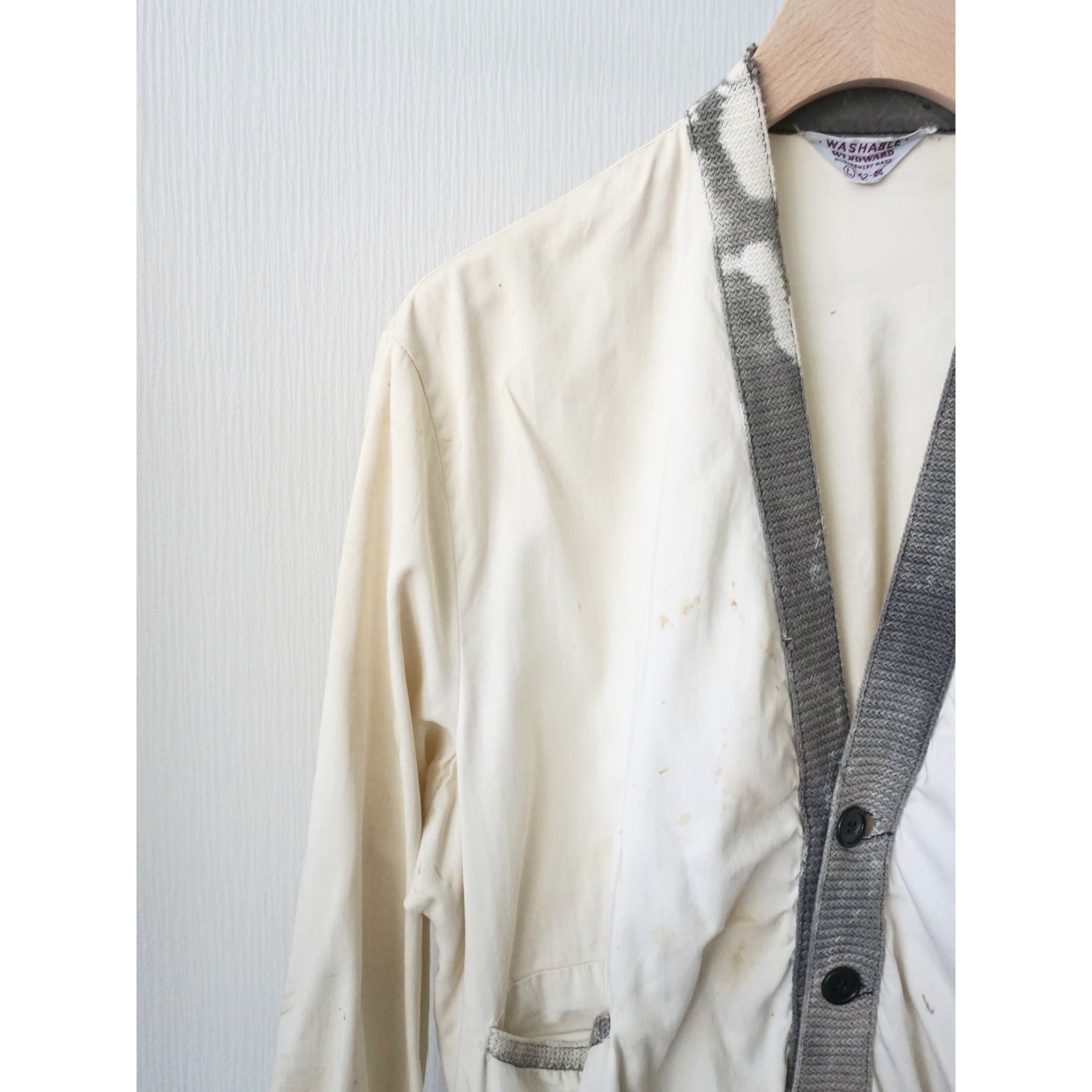 ナチュラルなホワイトカラーの目の細かなサラサラとしたコットン生地をベースに、裾や袖、襟からボタン部分までをざっくり編んだライトグレーでのコットンで切り替えられた、中々に見かけない仕様のカーディガンとなります。