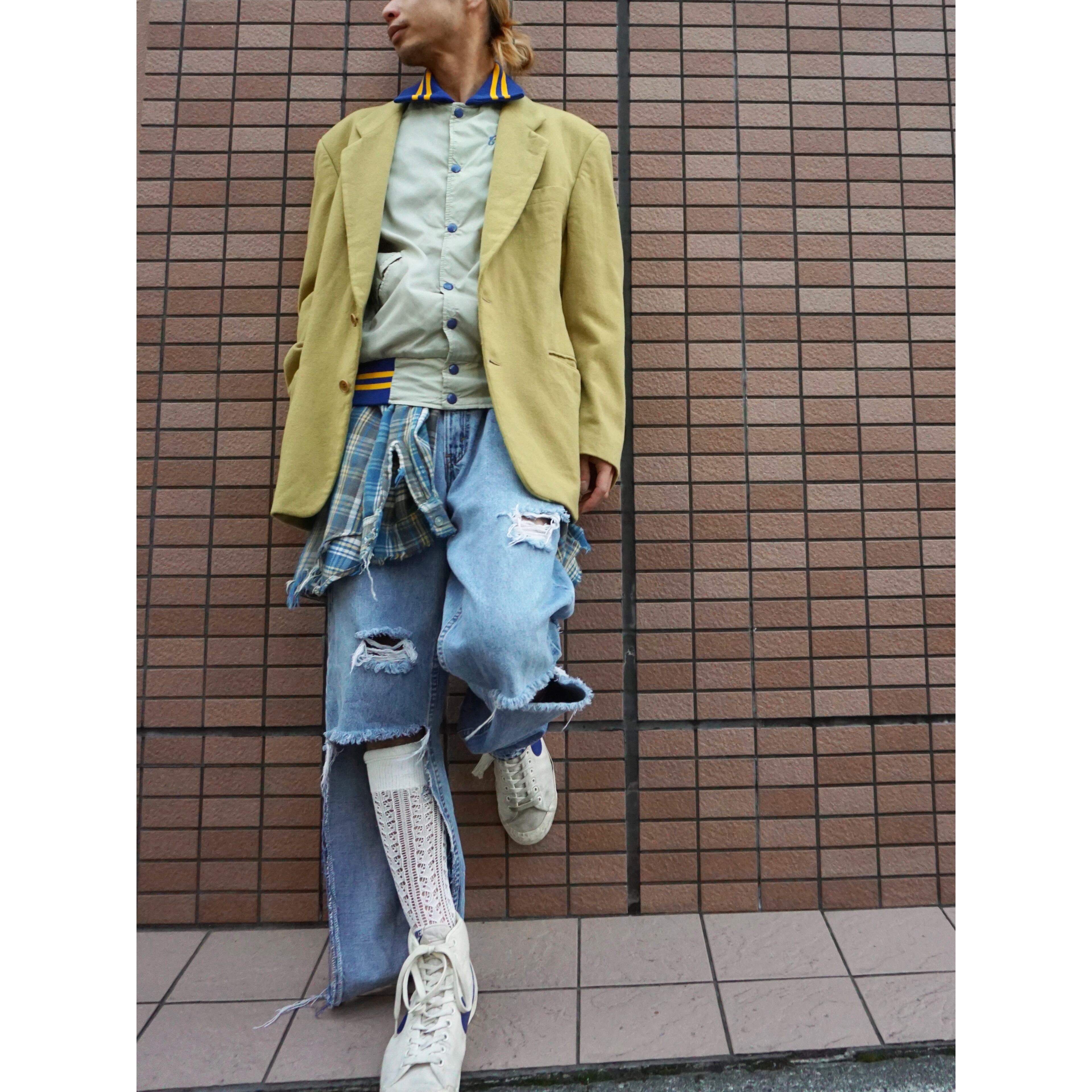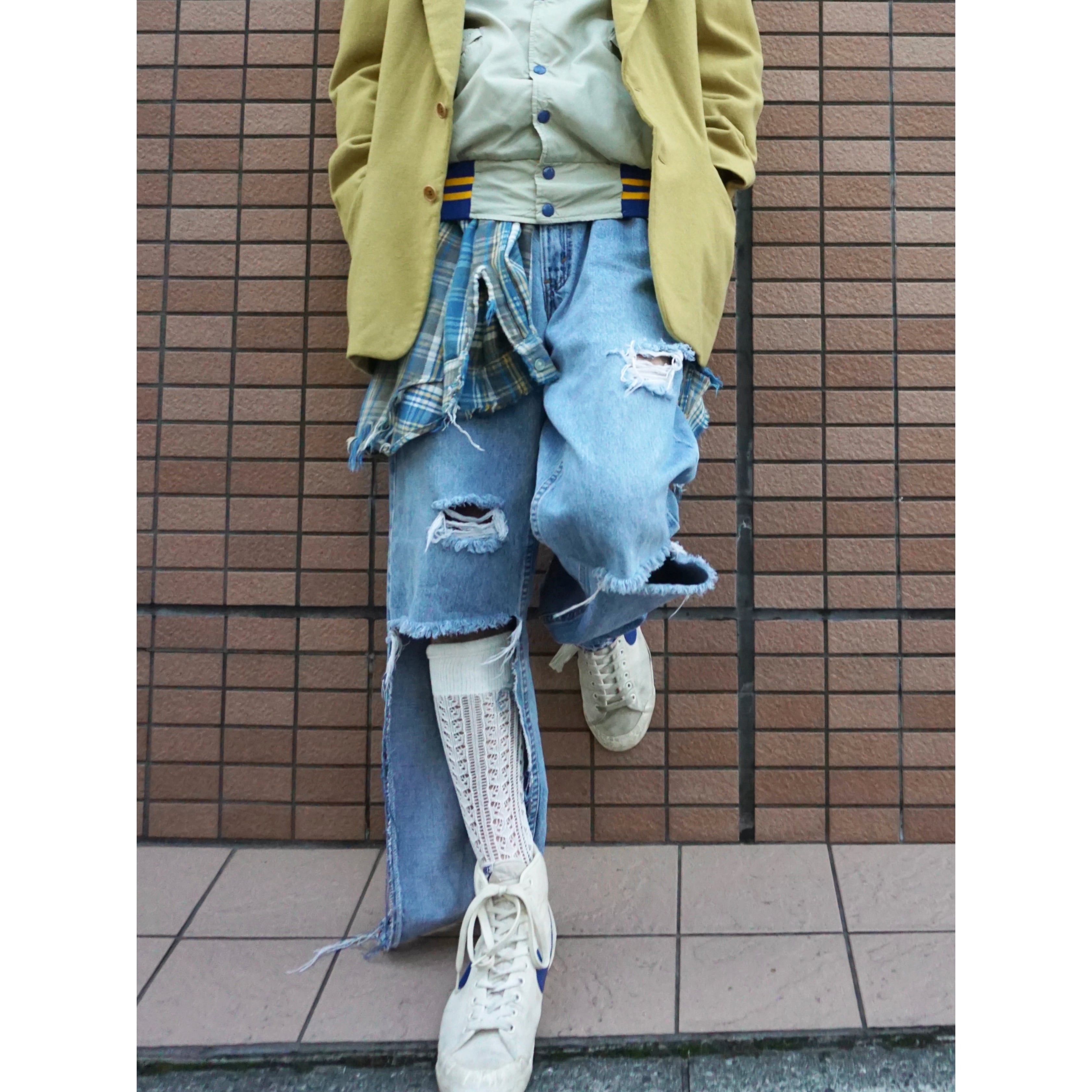 褪色した雰囲気の良いアイスブルーデニムに、此方はハードなクラッシュ、右足フロント膝下の生地が飛んだヤバめなボロ。。