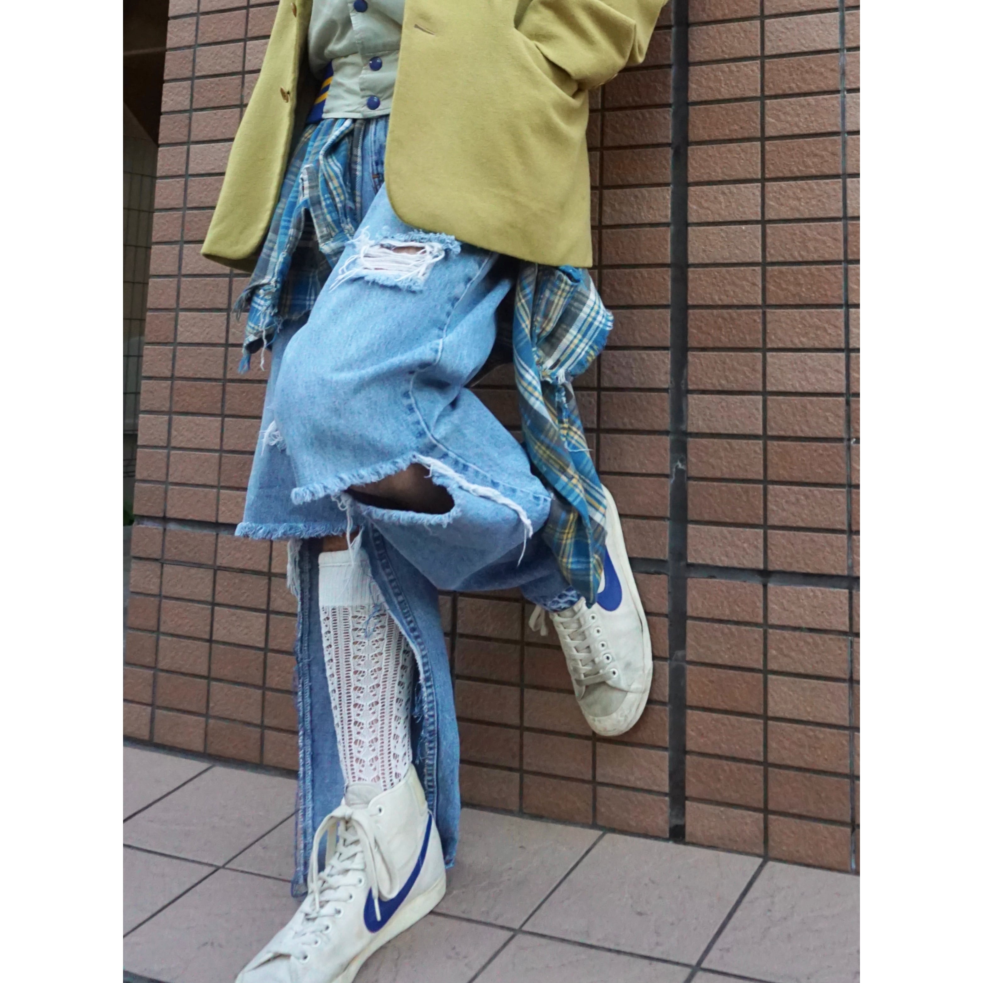 ヴィンテージ デニム製品特有の全体的にクラッシュ跡、カットオフ跡、色落ち等ございます。どれもヴィンテージ デニム製品特有の風合いとしてご理解ある方のみご注文お願いいたします。
