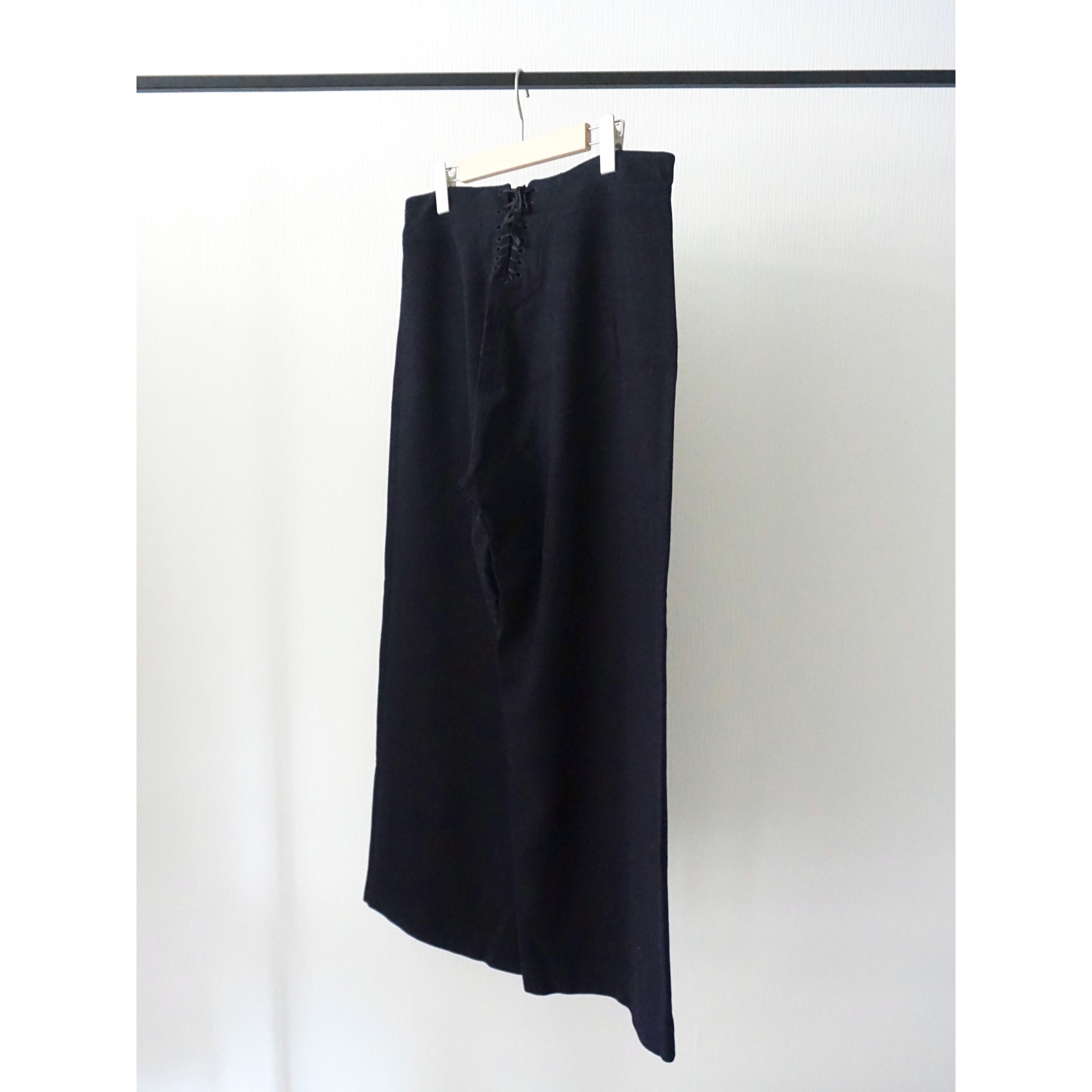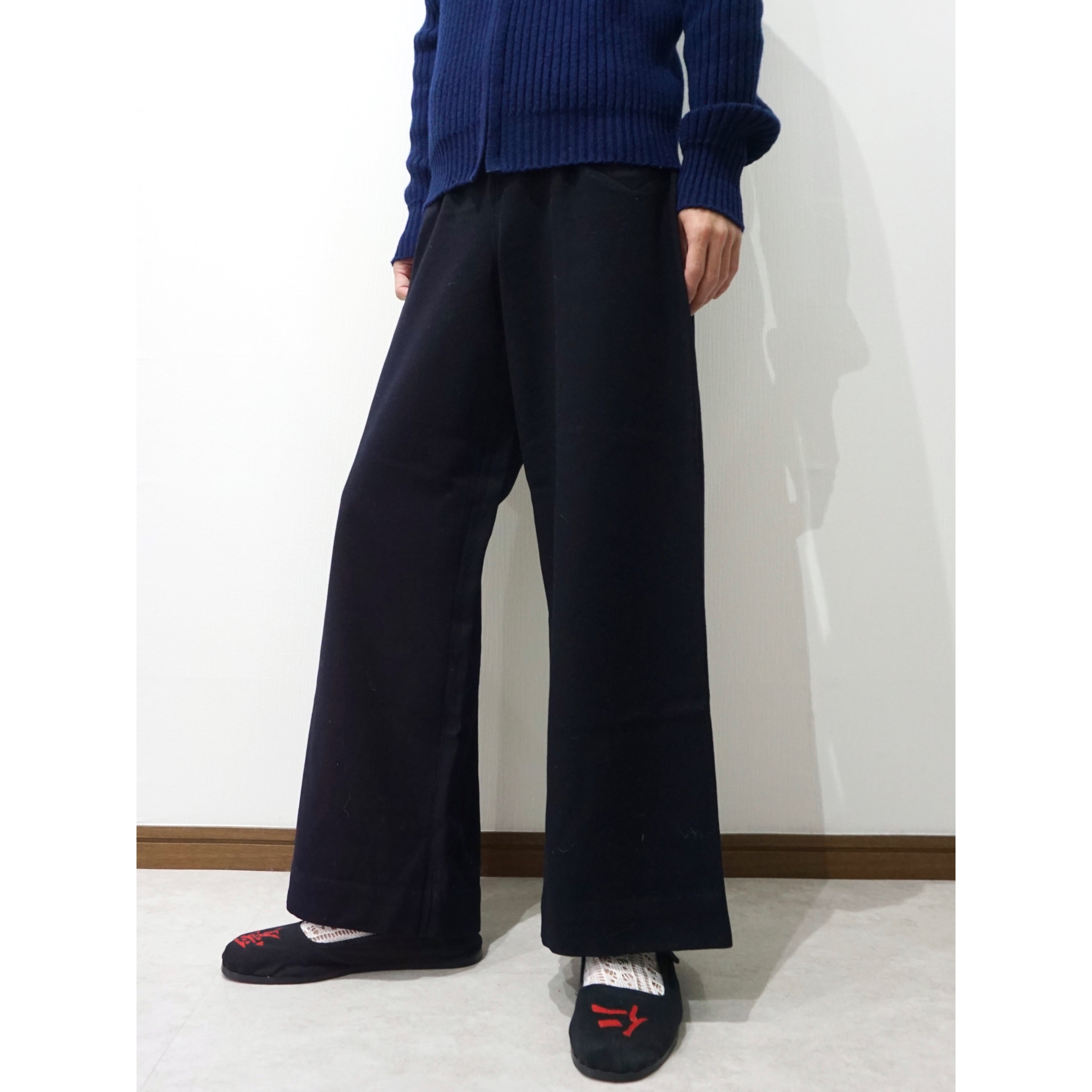 股上が深めにとられ、裾に向かってズドンとフレアする存在感のあるワイドシルエットとなります。