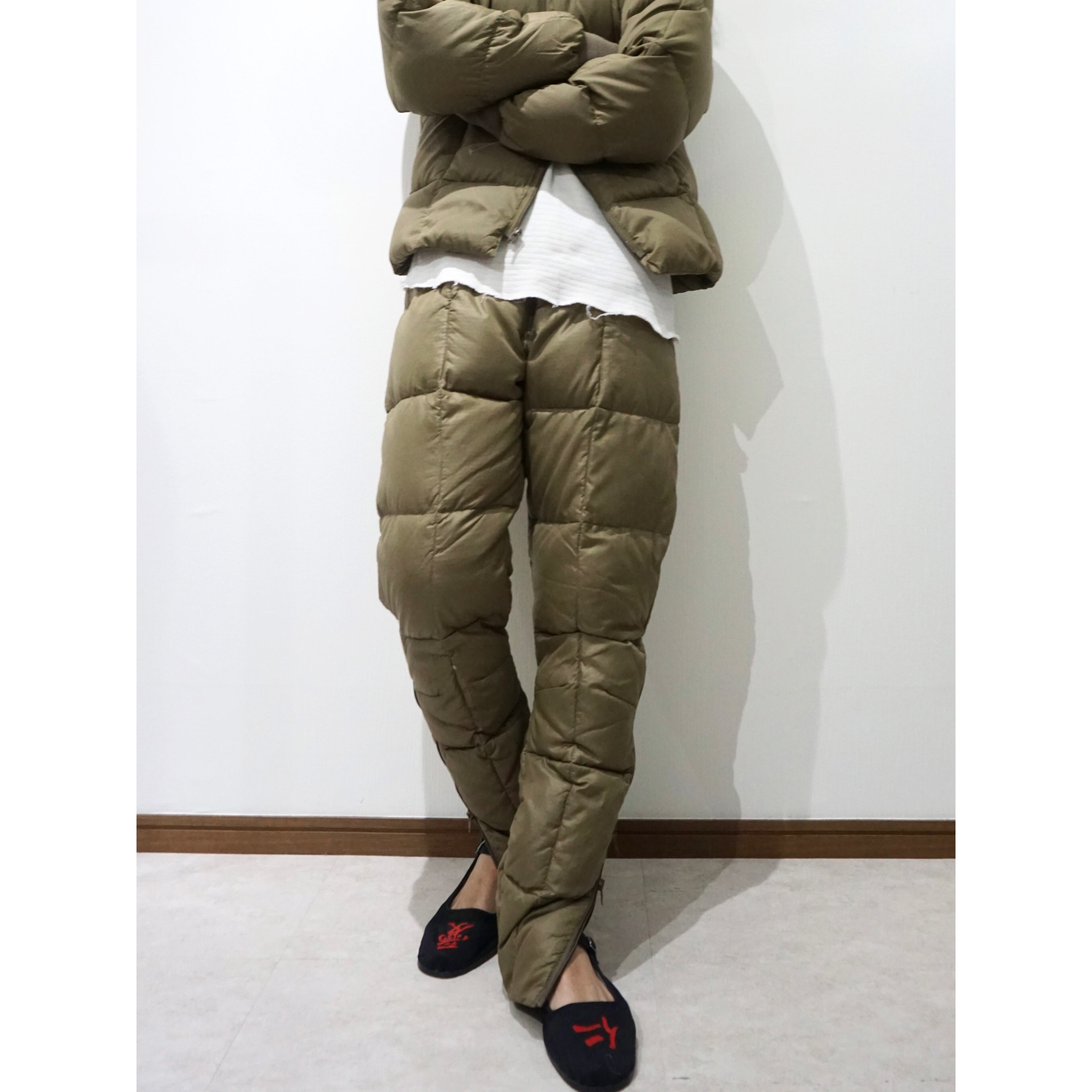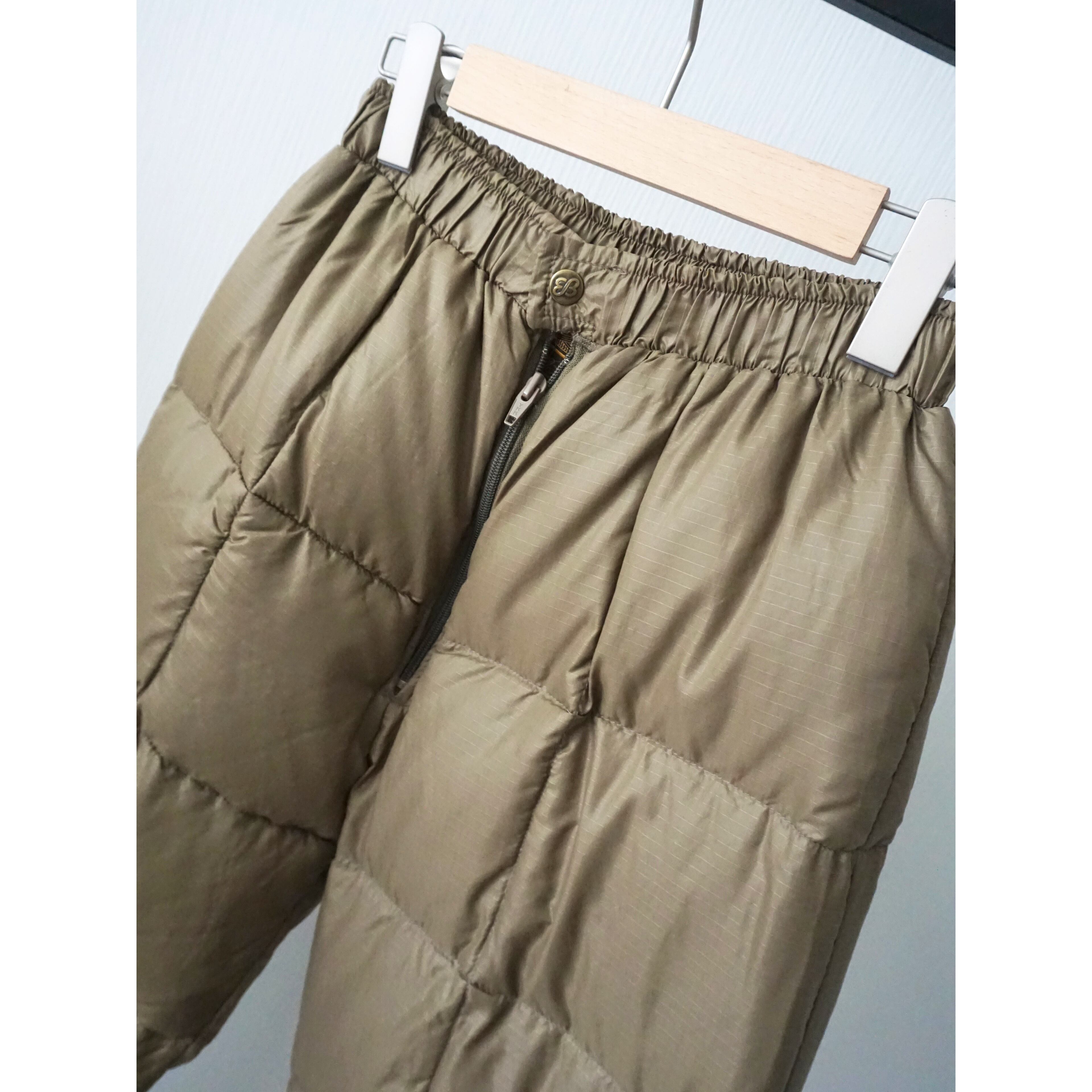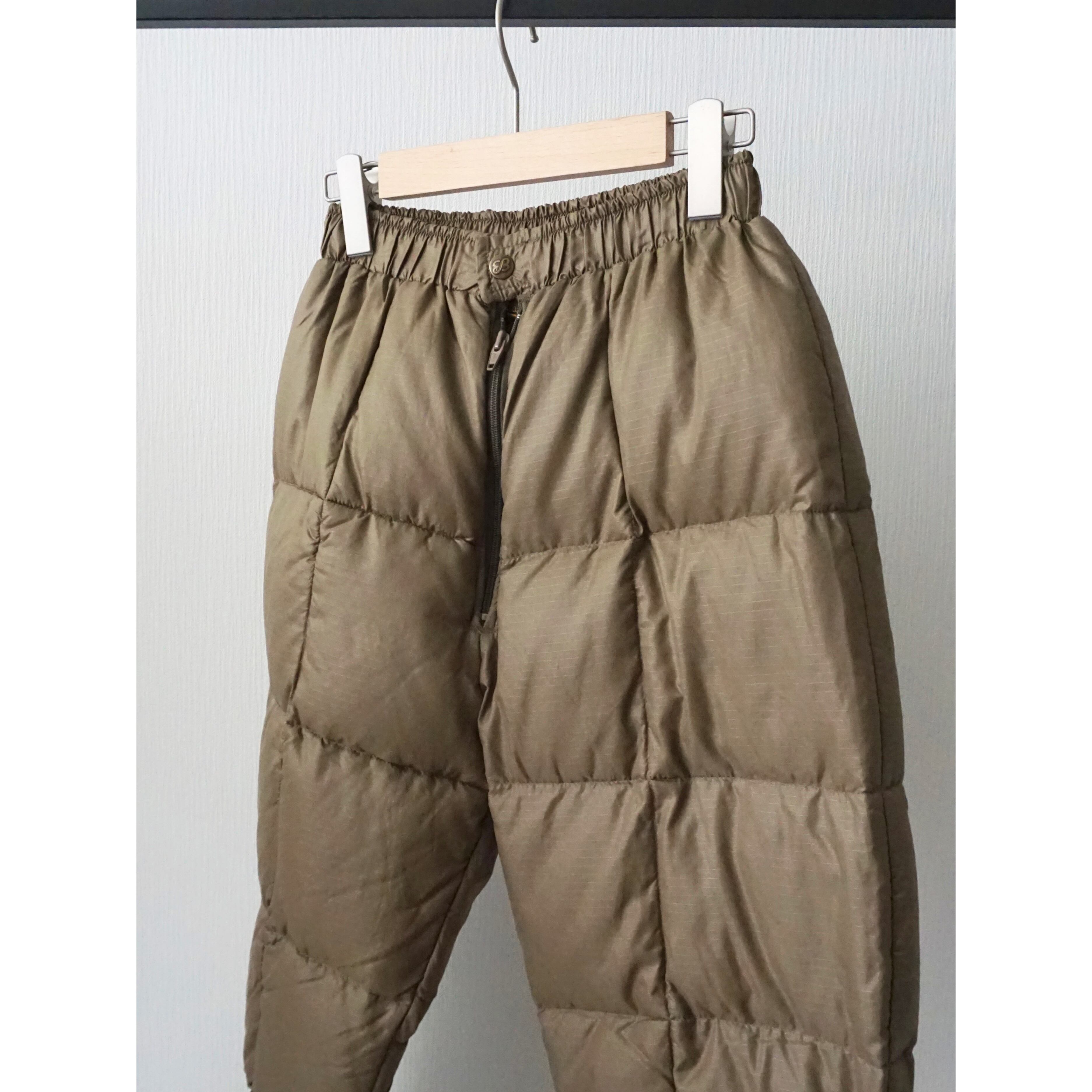 ダウンパンツはゴムがしっかり効いたイージーパンツ仕様。フロントトップにスナップボタン、ジッパーが付きます。