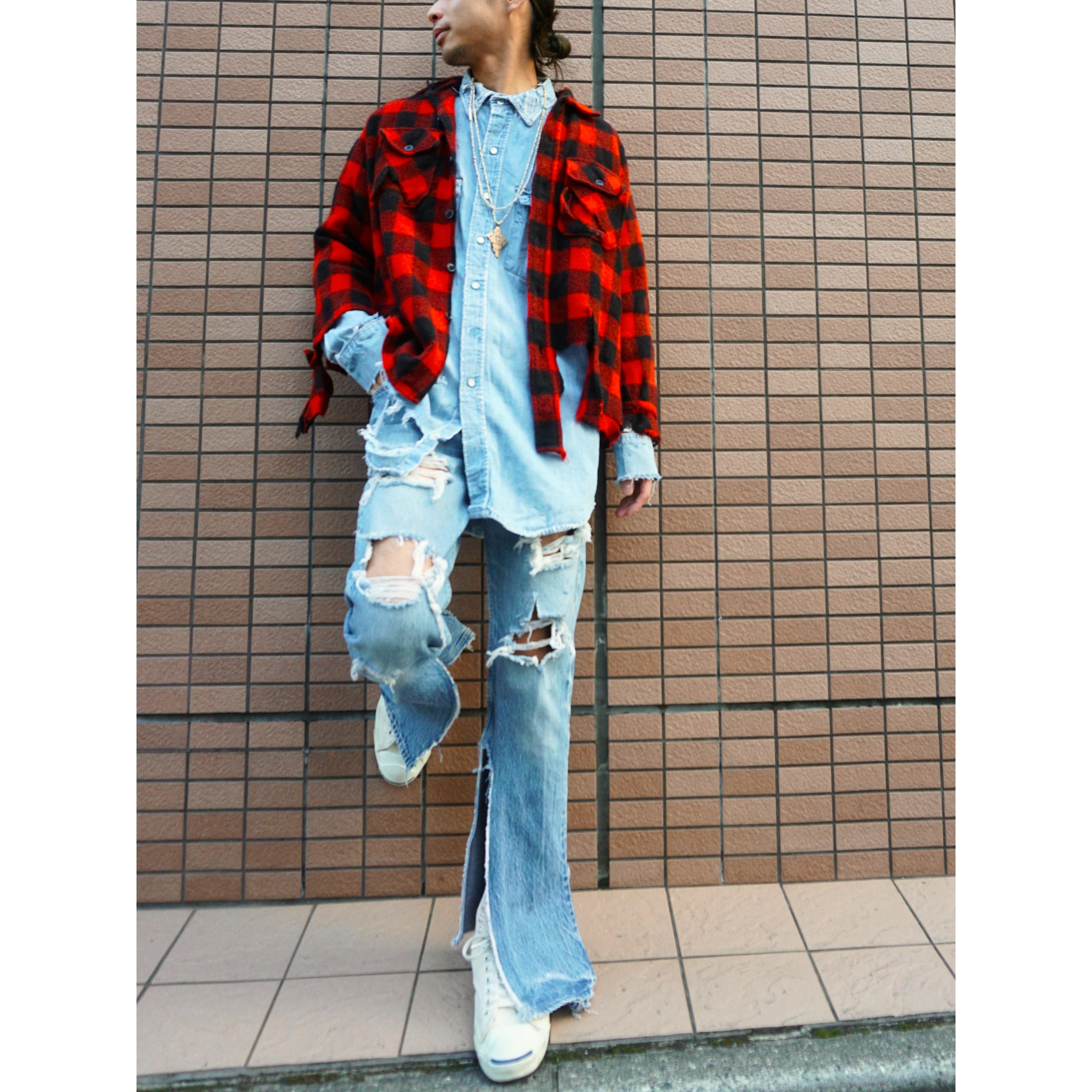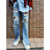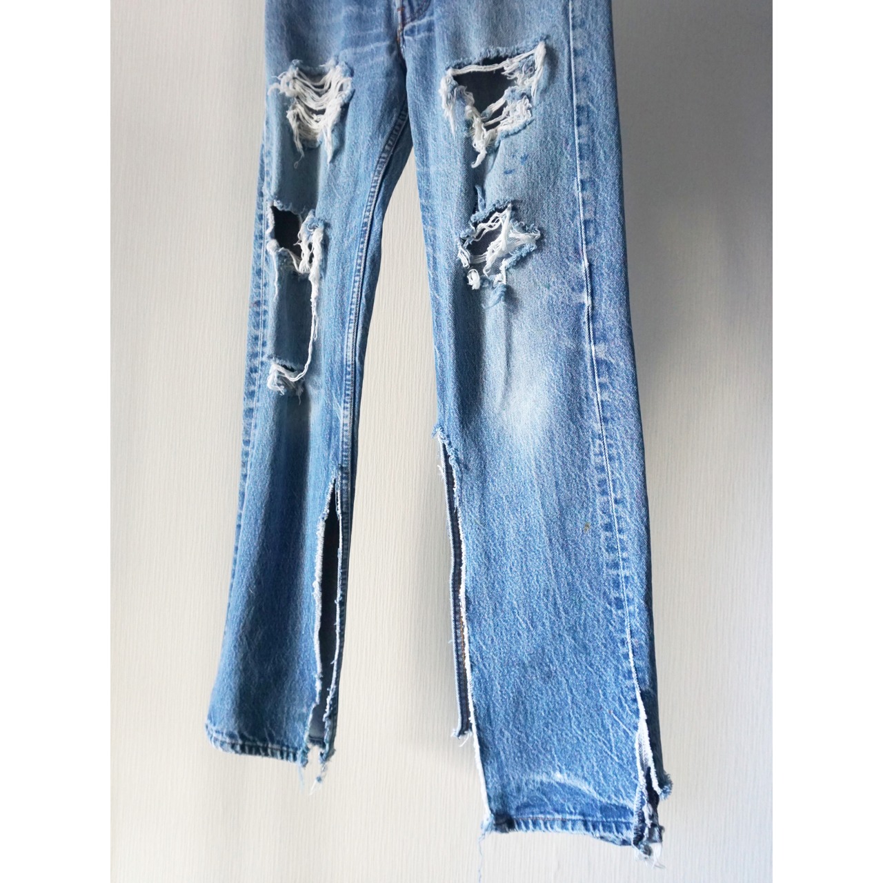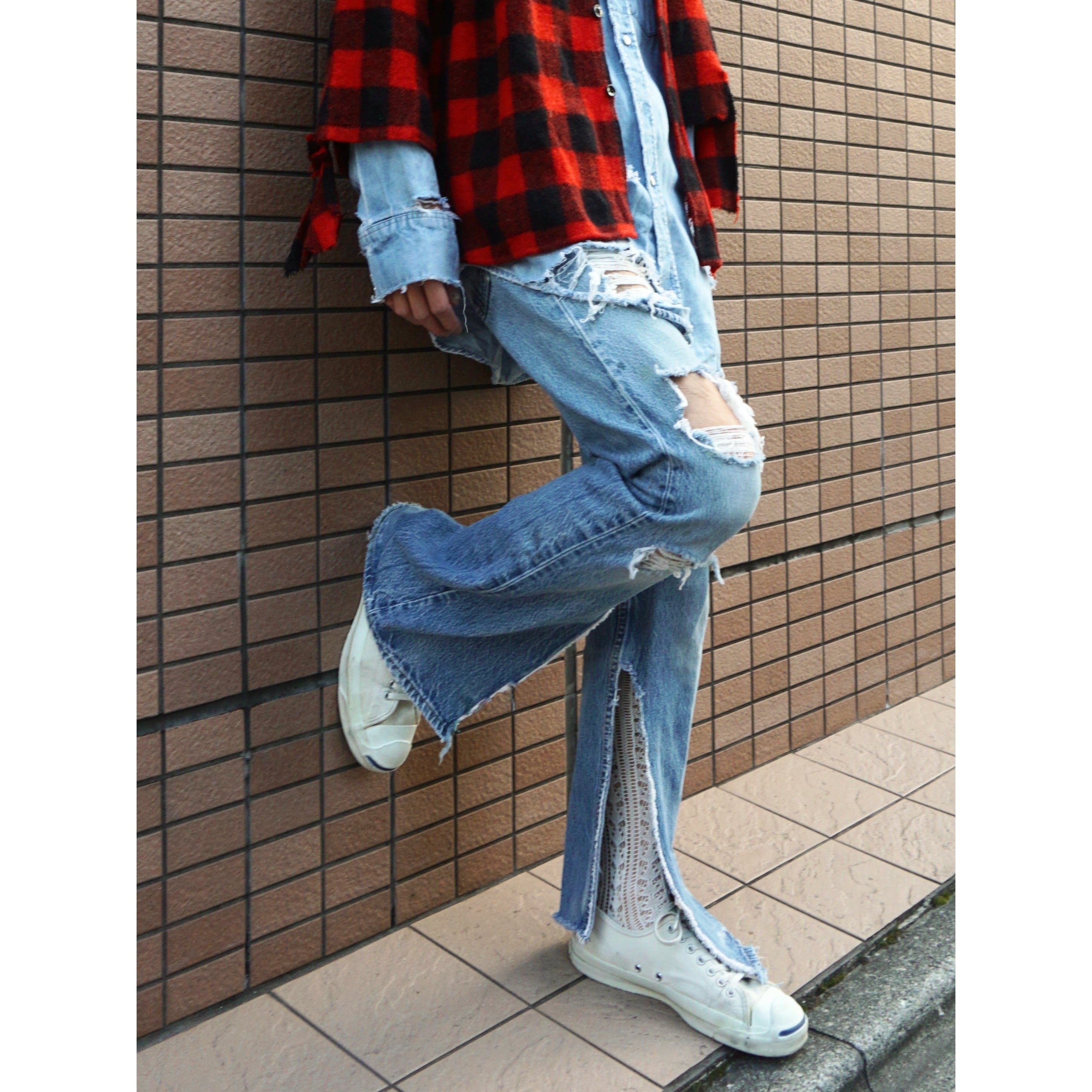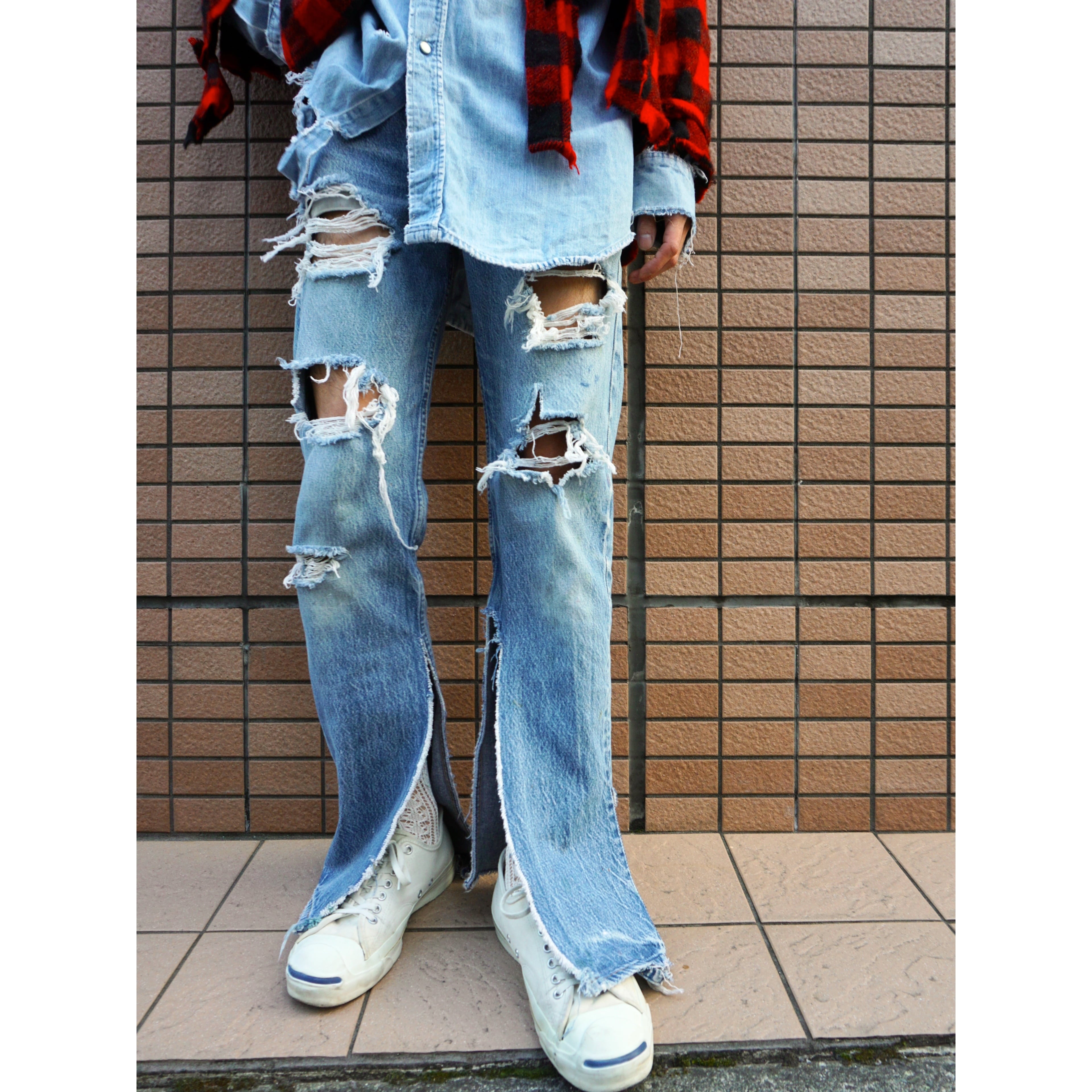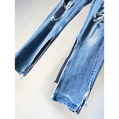 雰囲気良く褪色したブルーデニムに、此方は両膝にハードなクラッシュやおそらく前所有者がカットしたのか両裾にスリットっぽく裂けの入るとてもクールなBoro。
