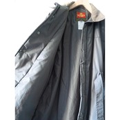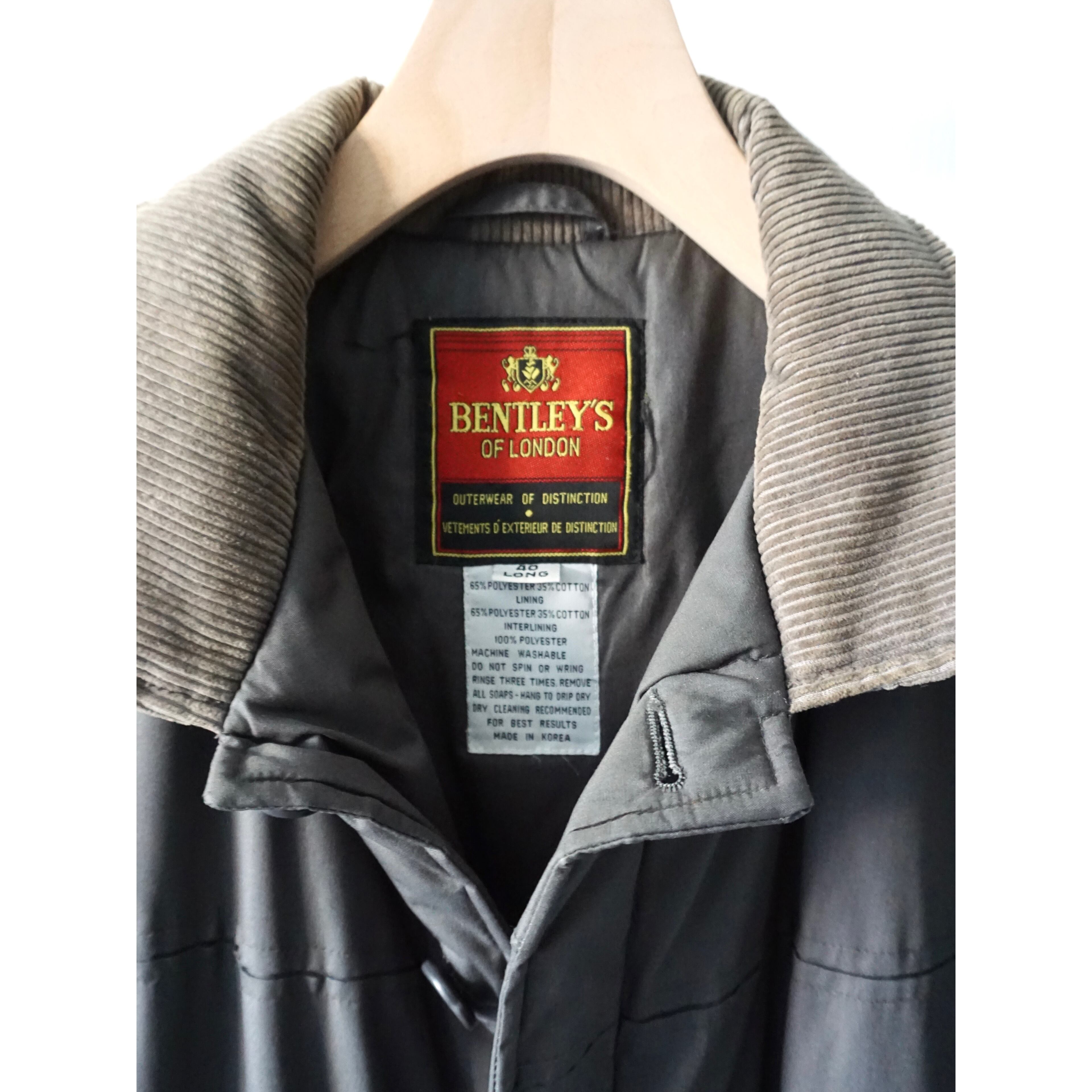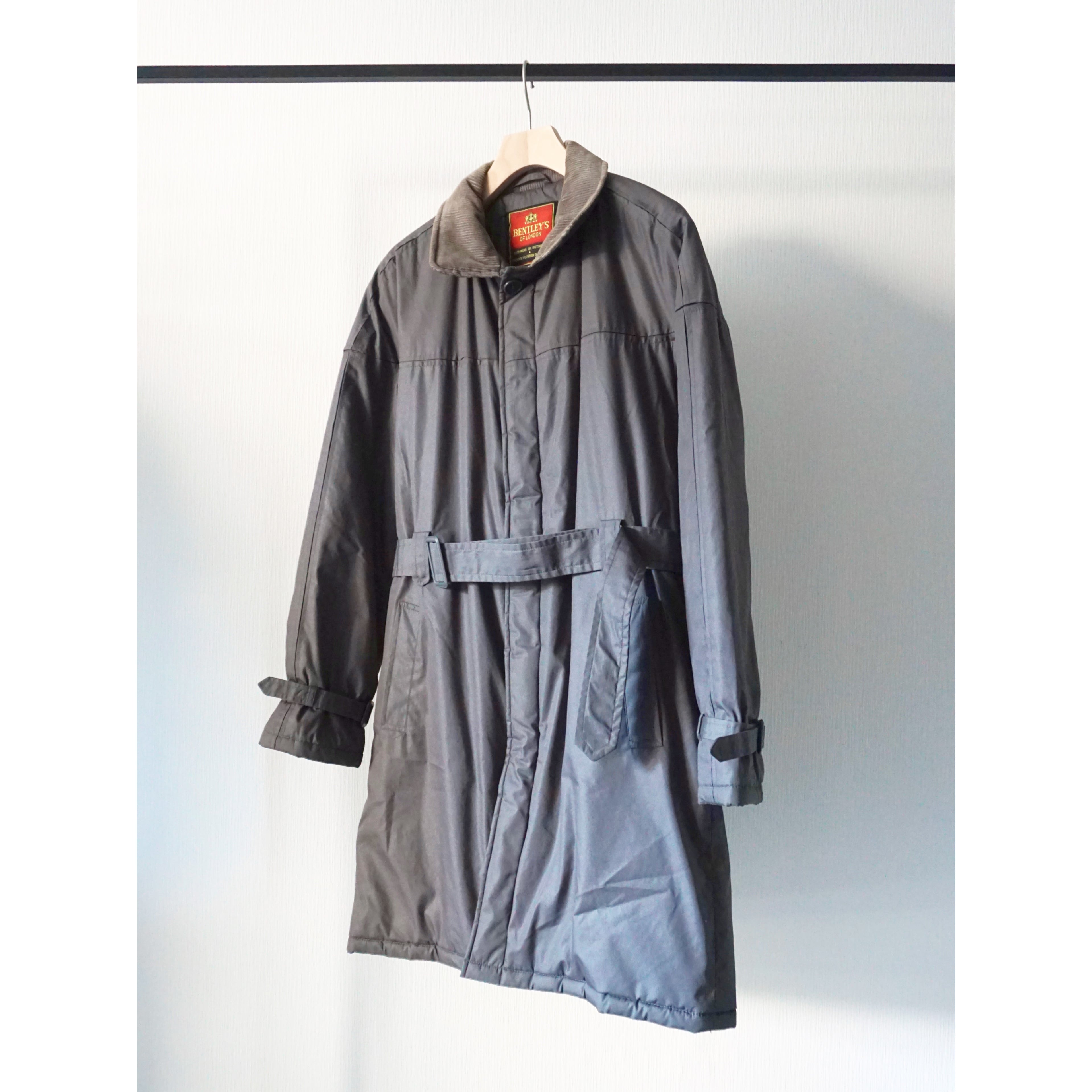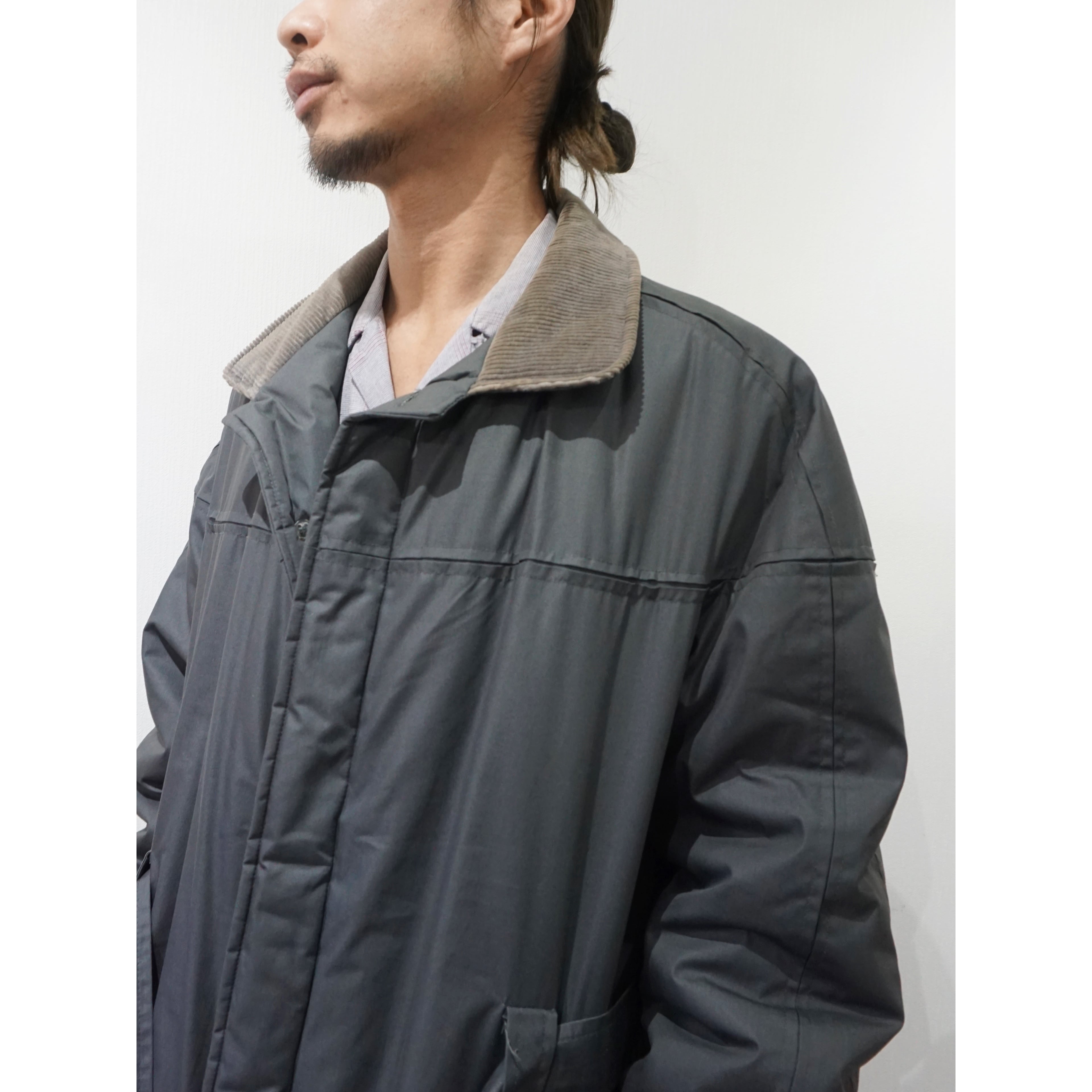 ハリのあるポリ×コットンシェルに男らしい無機質なグレーカラー。襟はコーデュロイ切替。フロントはボタンで開閉できる比翼仕立てのベルテッドコートとなります。