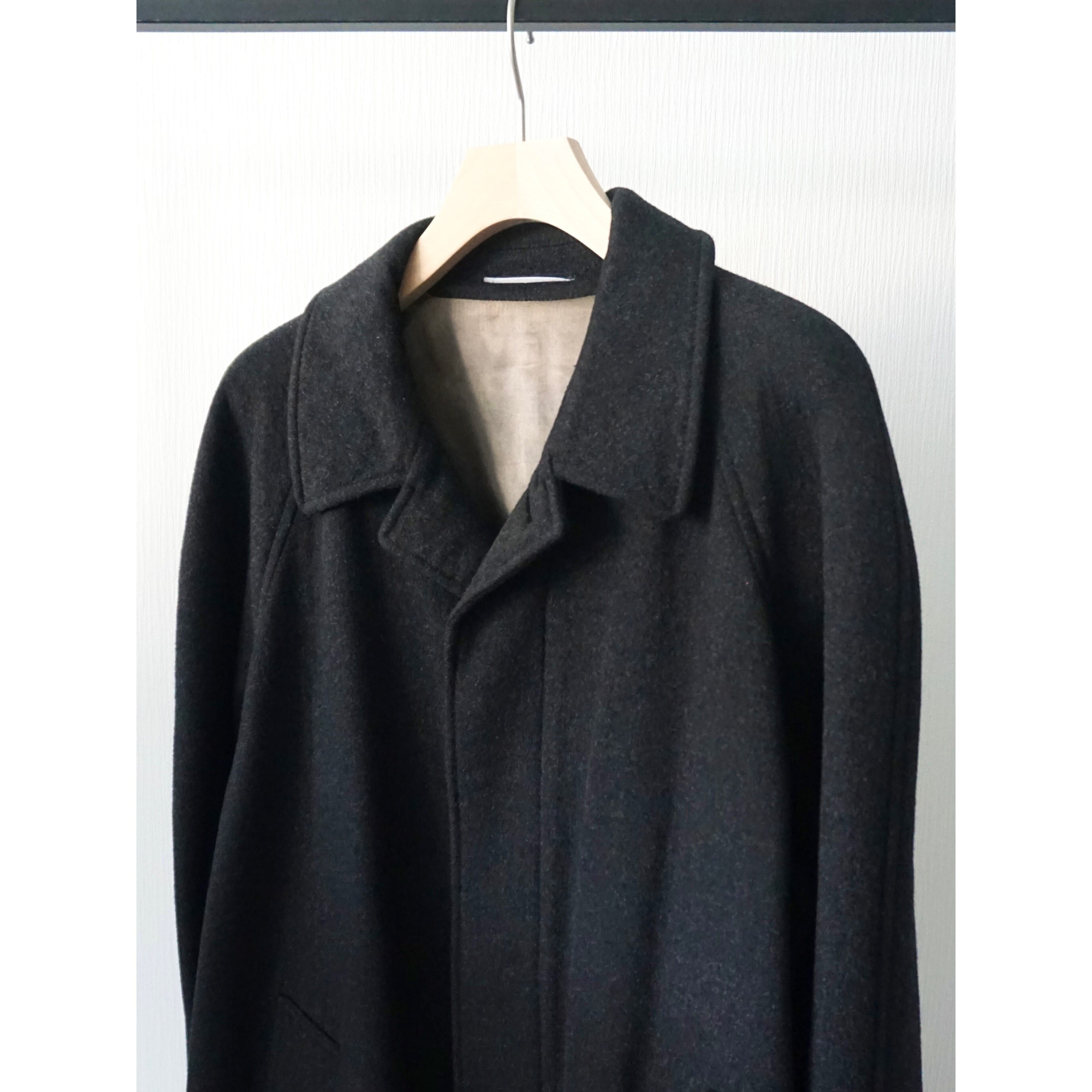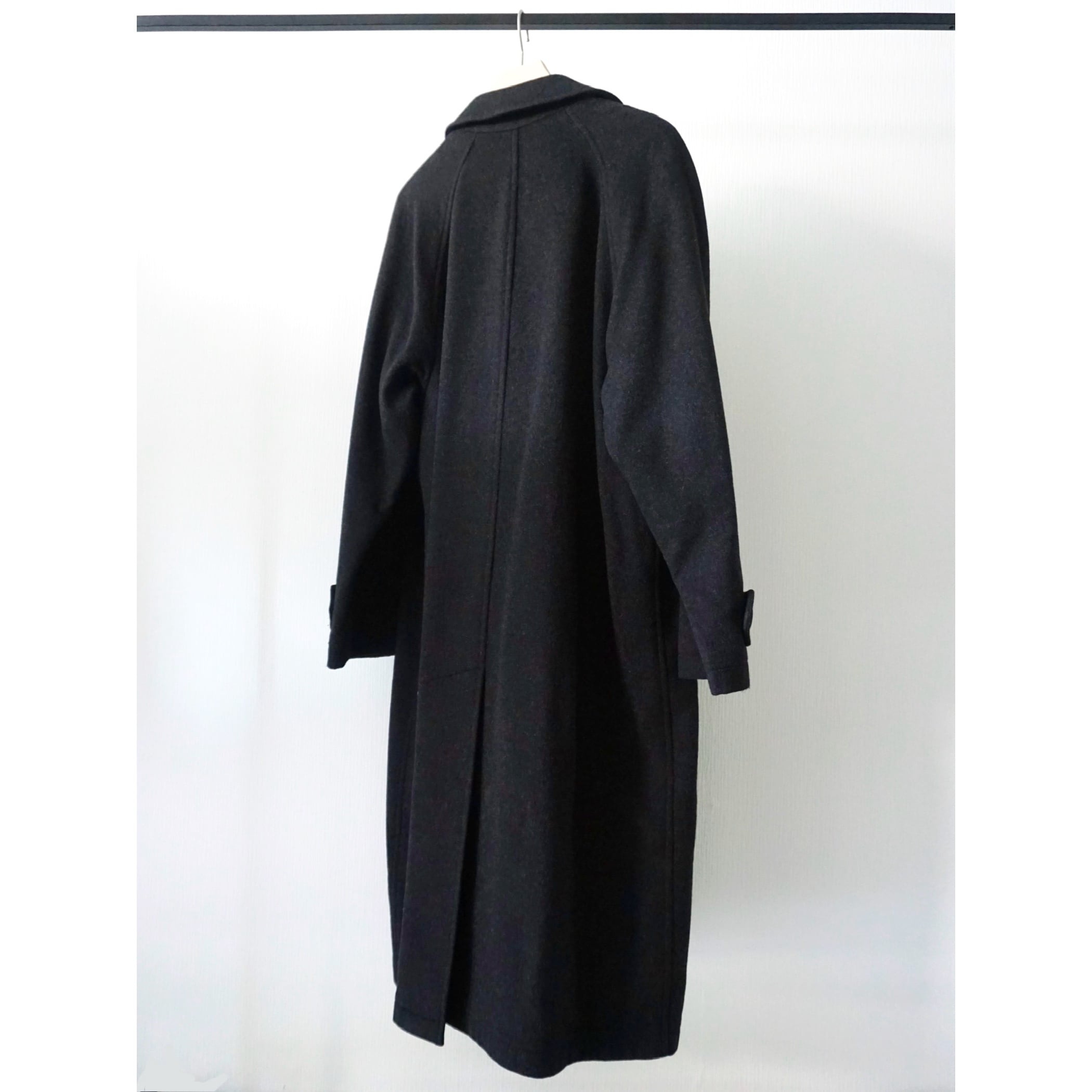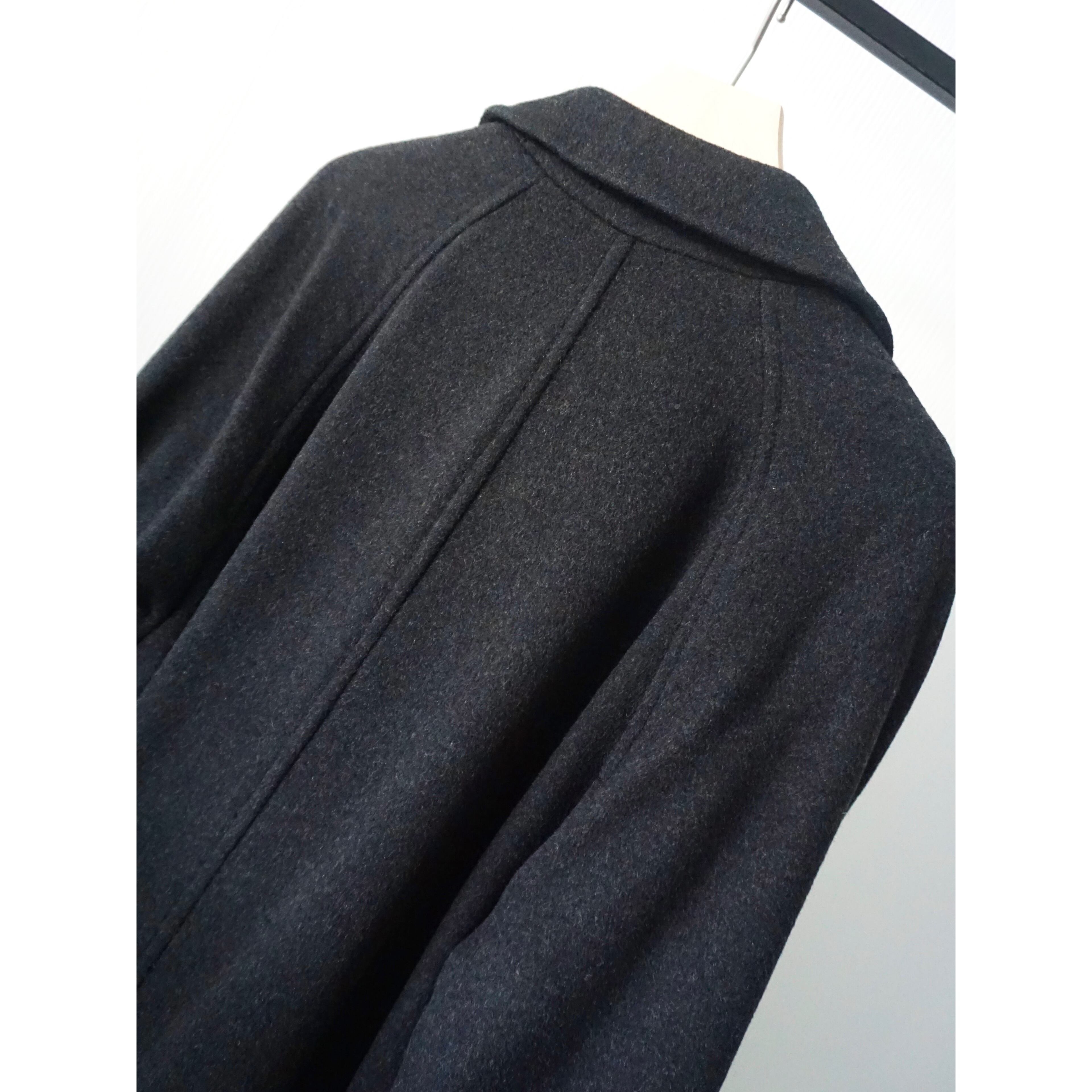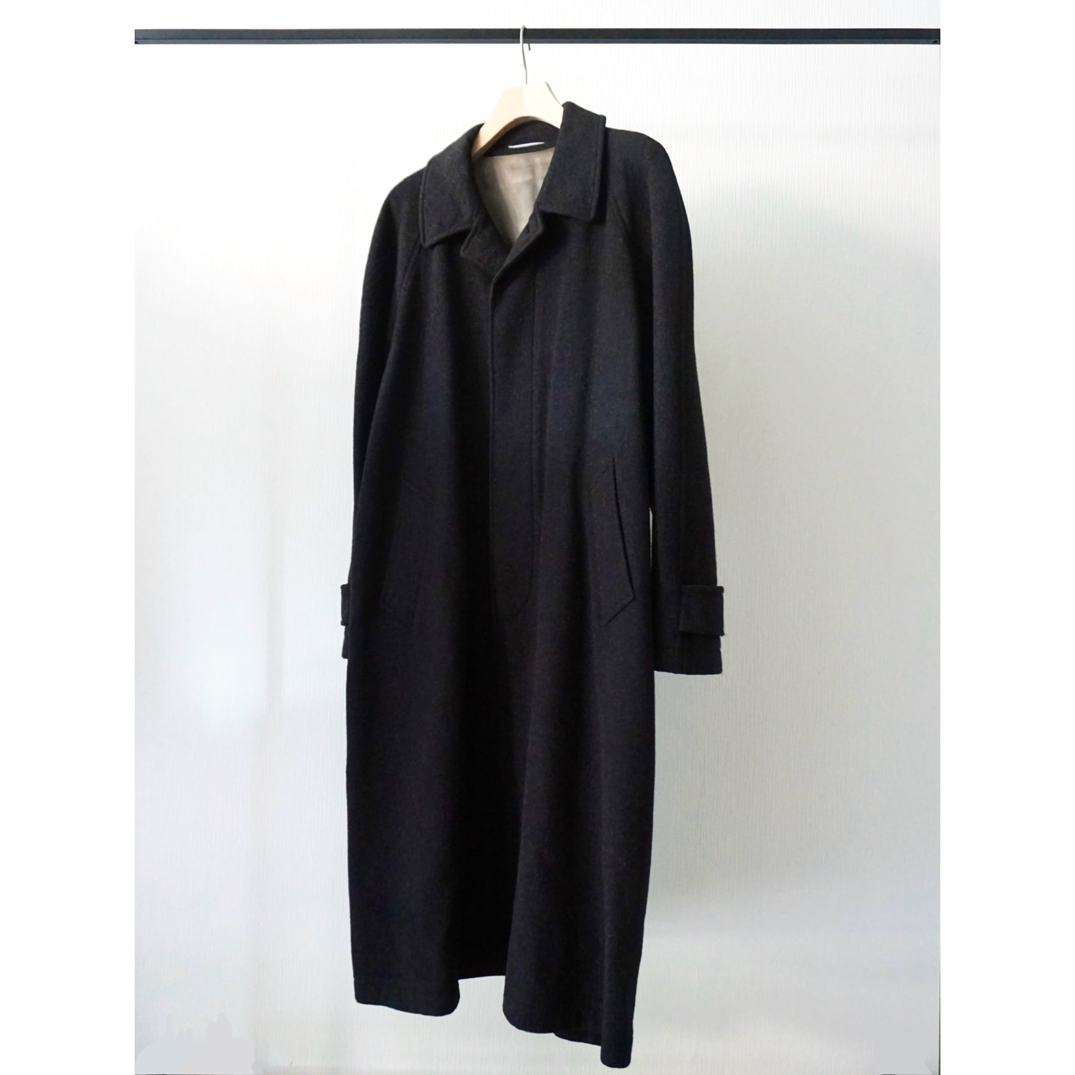 あえてブラックでは無いチャコールグレーカラー。素材感、シルエットの良さが際立つ、ラグランスリーブ、比翼仕立ての無駄の無いシンプルなバルマカーンコートスタイルの一着。