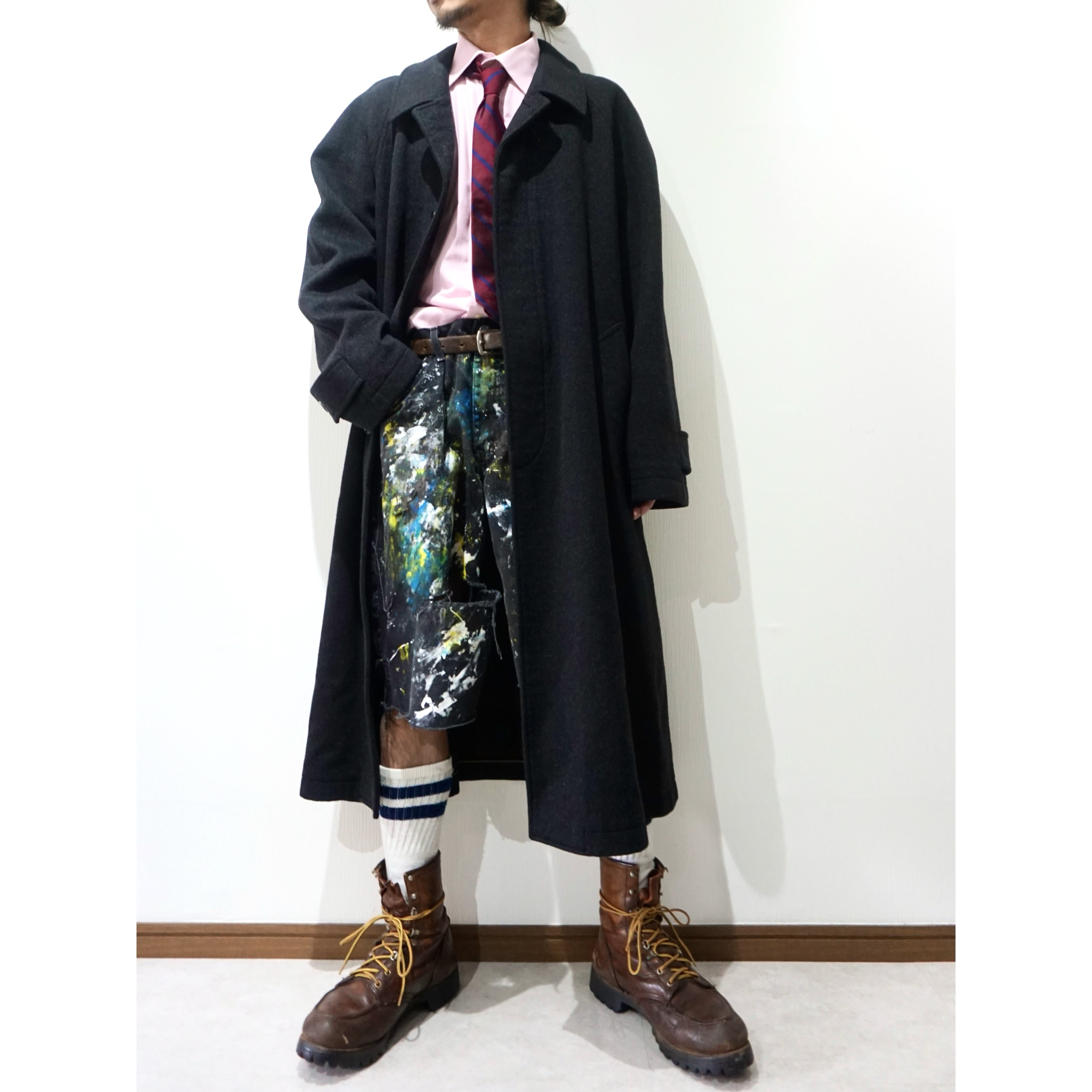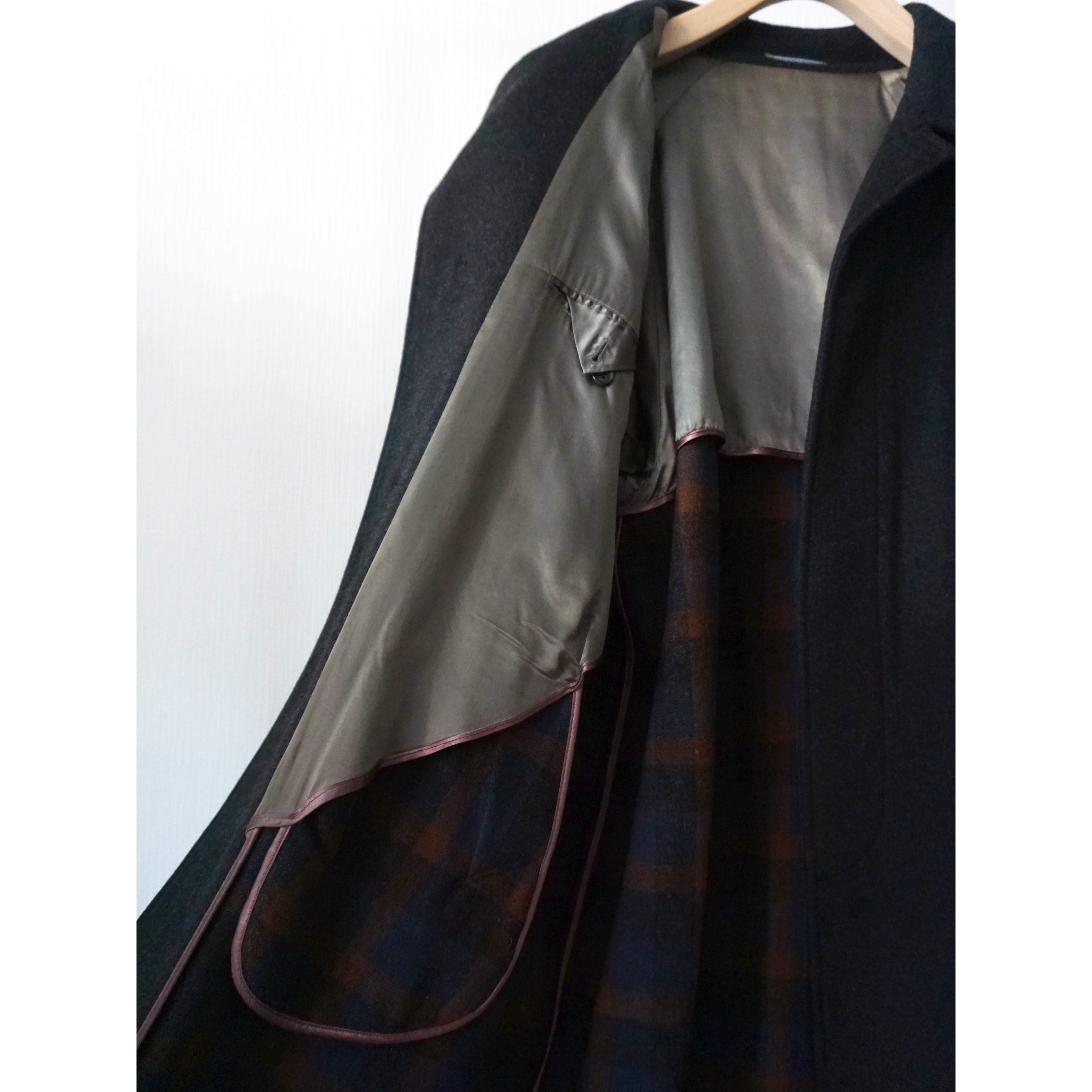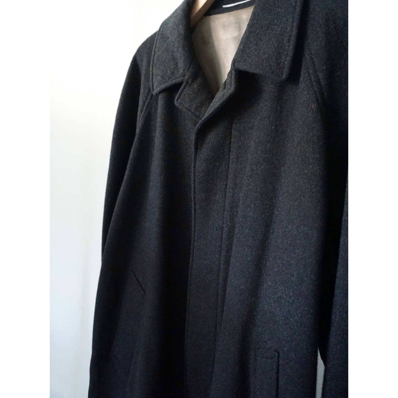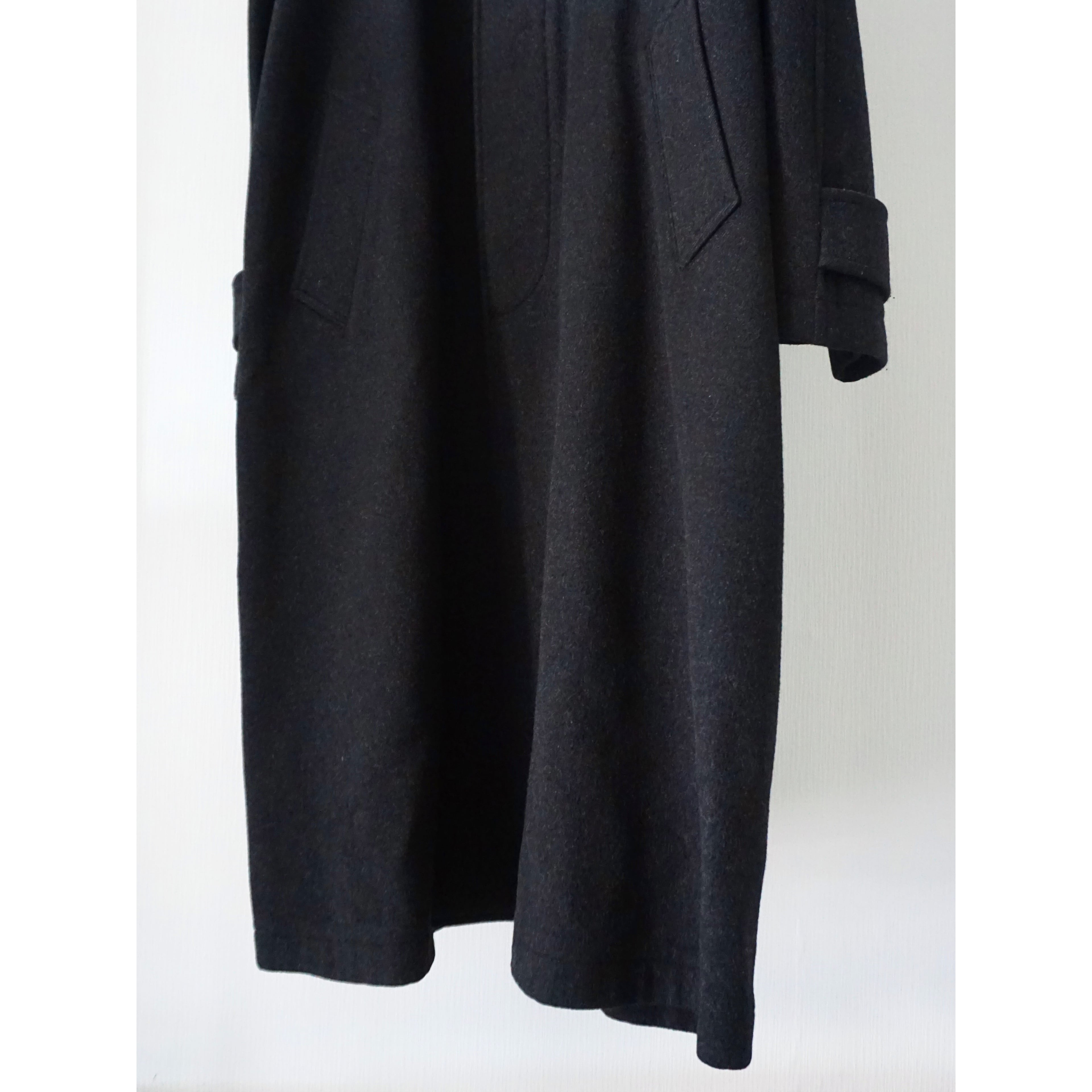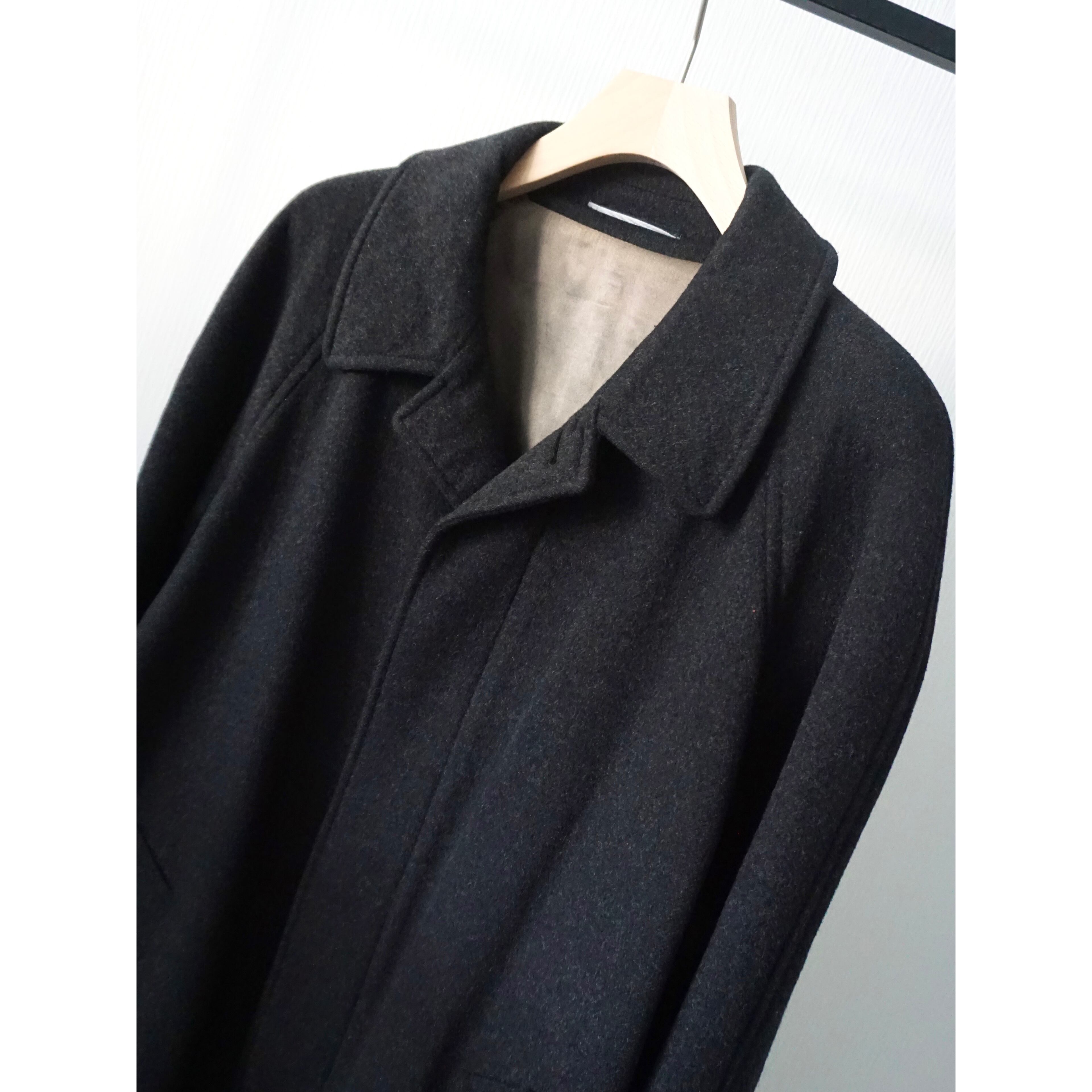 あえてブラックでは無いチャコールグレーカラー。素材感、シルエットの良さが際立つ、ラグランスリーブ、比翼仕立ての無駄の無いシンプルなバルマカーンコートスタイルの一着。