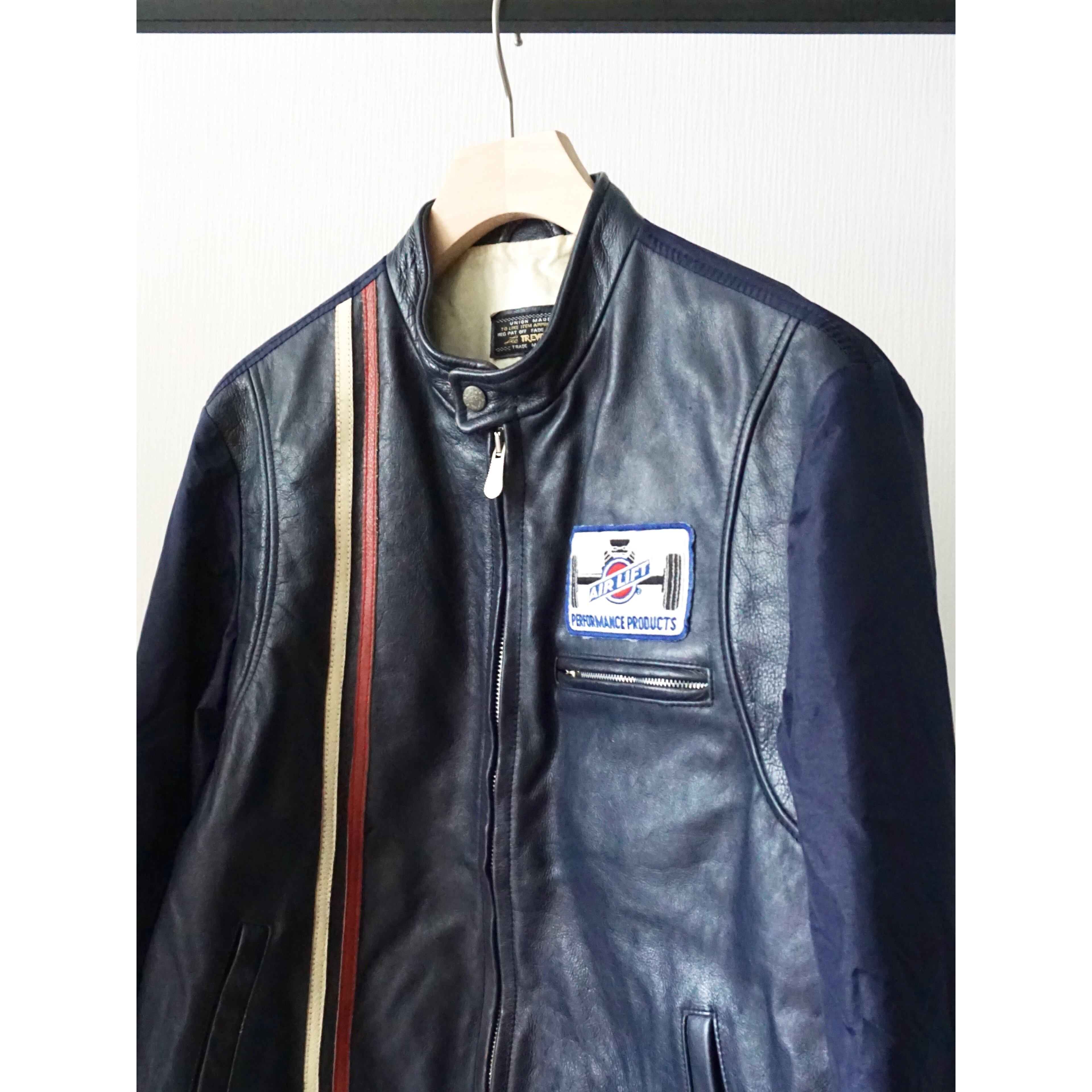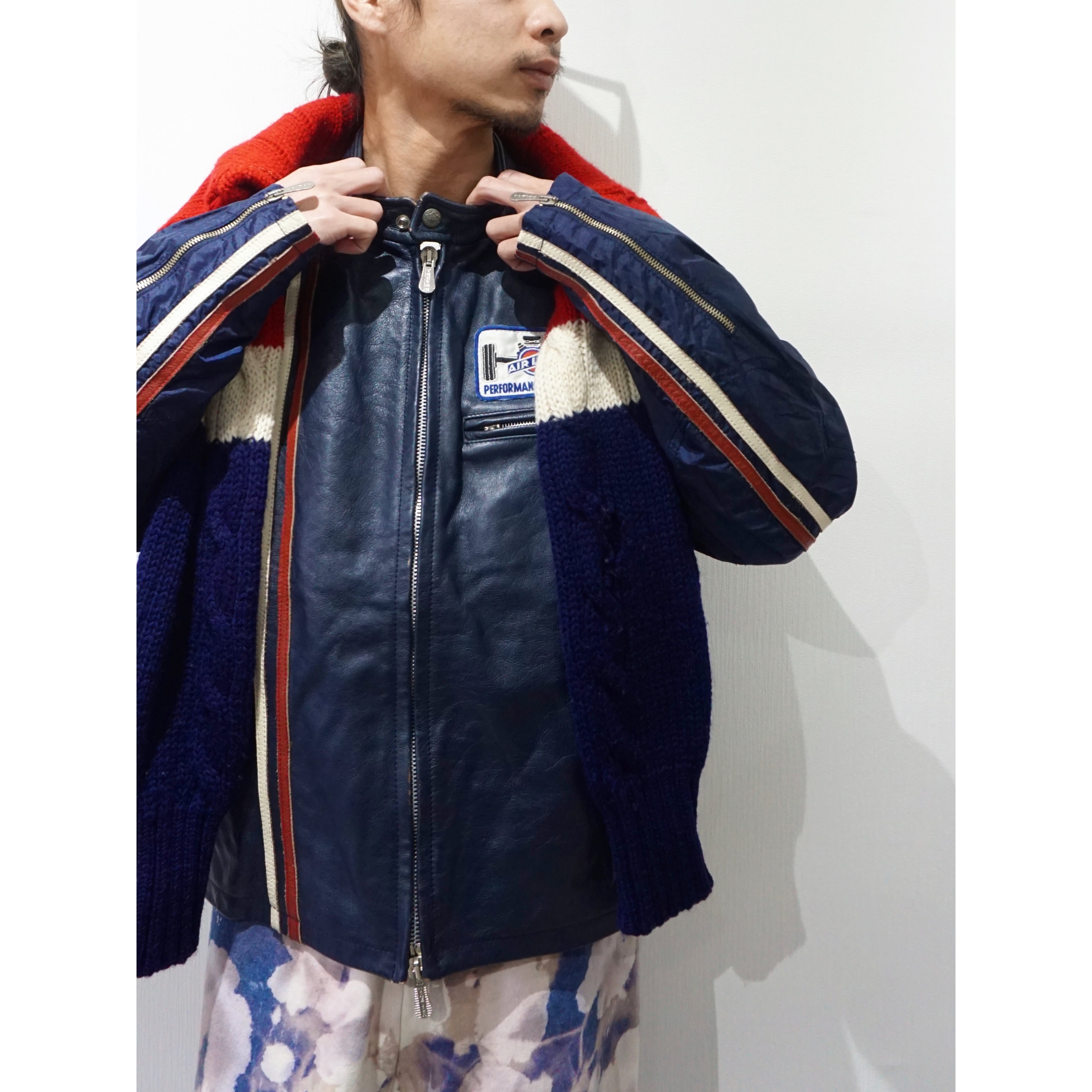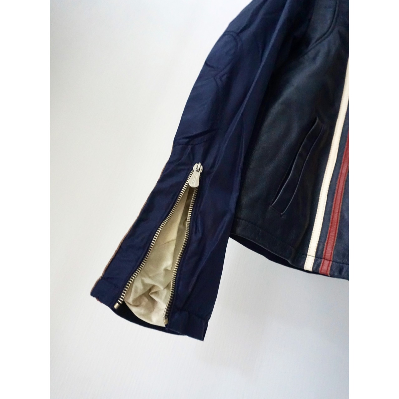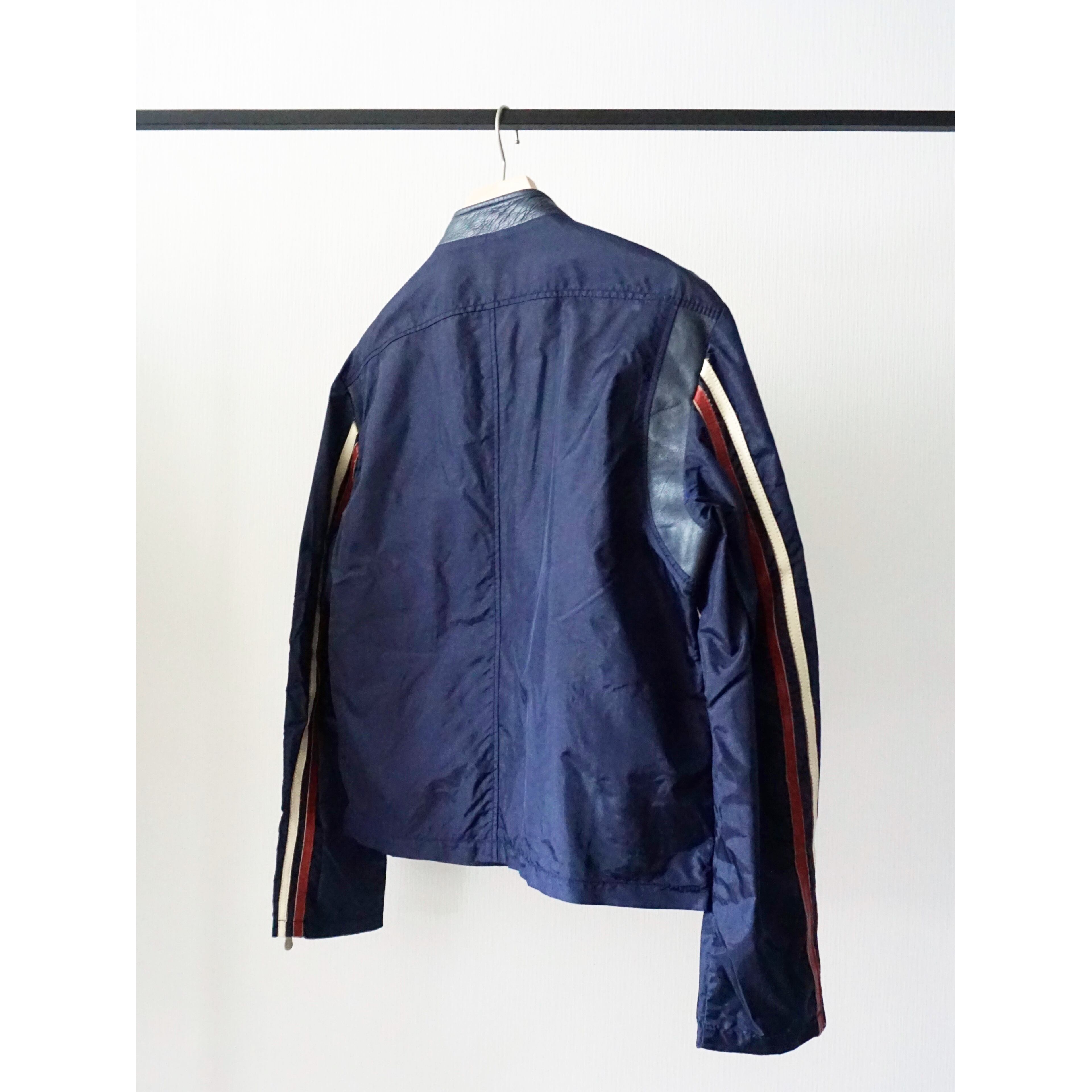 シングルライダース型でフロントはネイビーレザー、アーム、バック面はネイビーナイロンでスイッチングした、個人的にも大好きな同色異素材切替デザイン◎