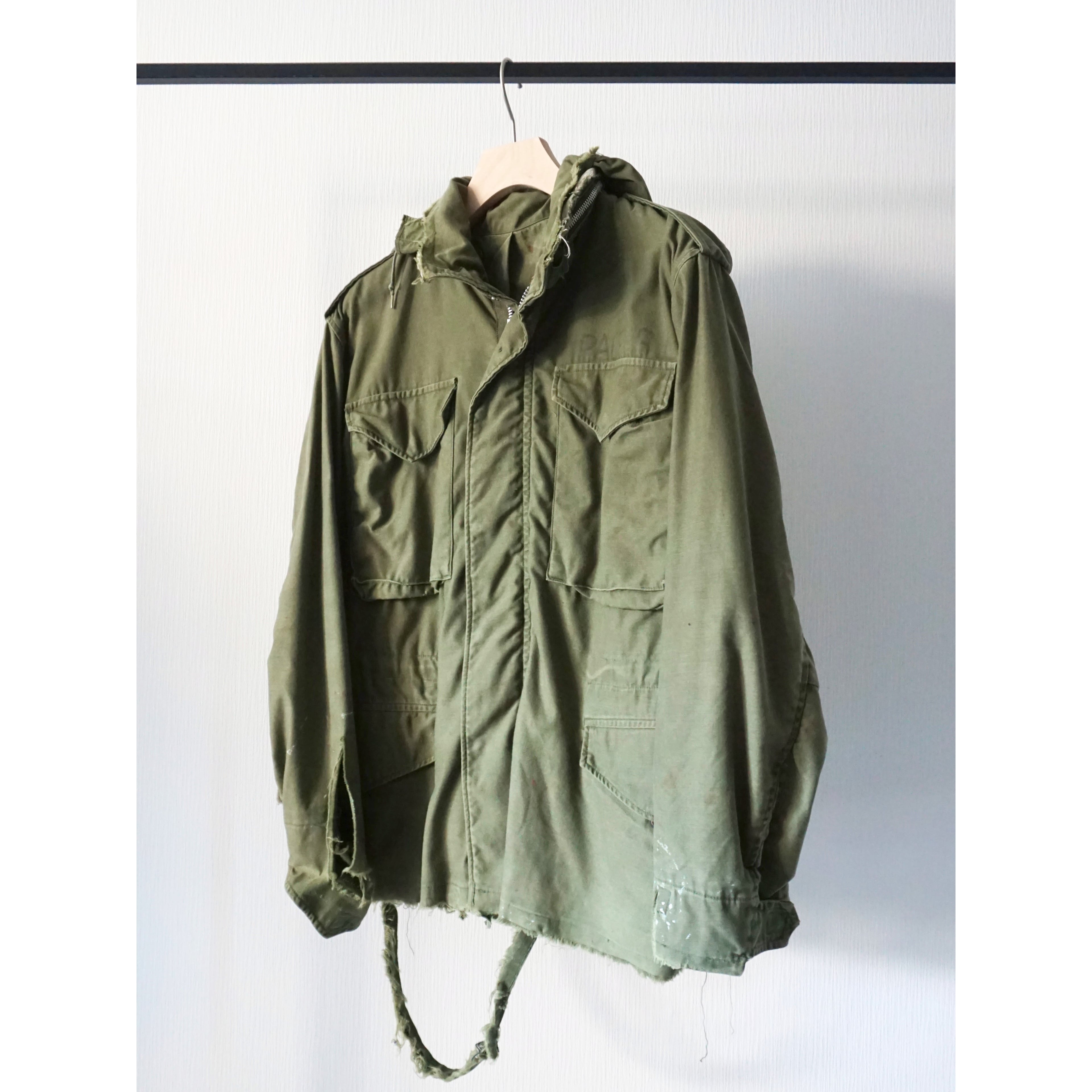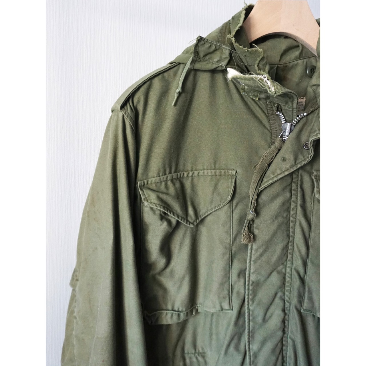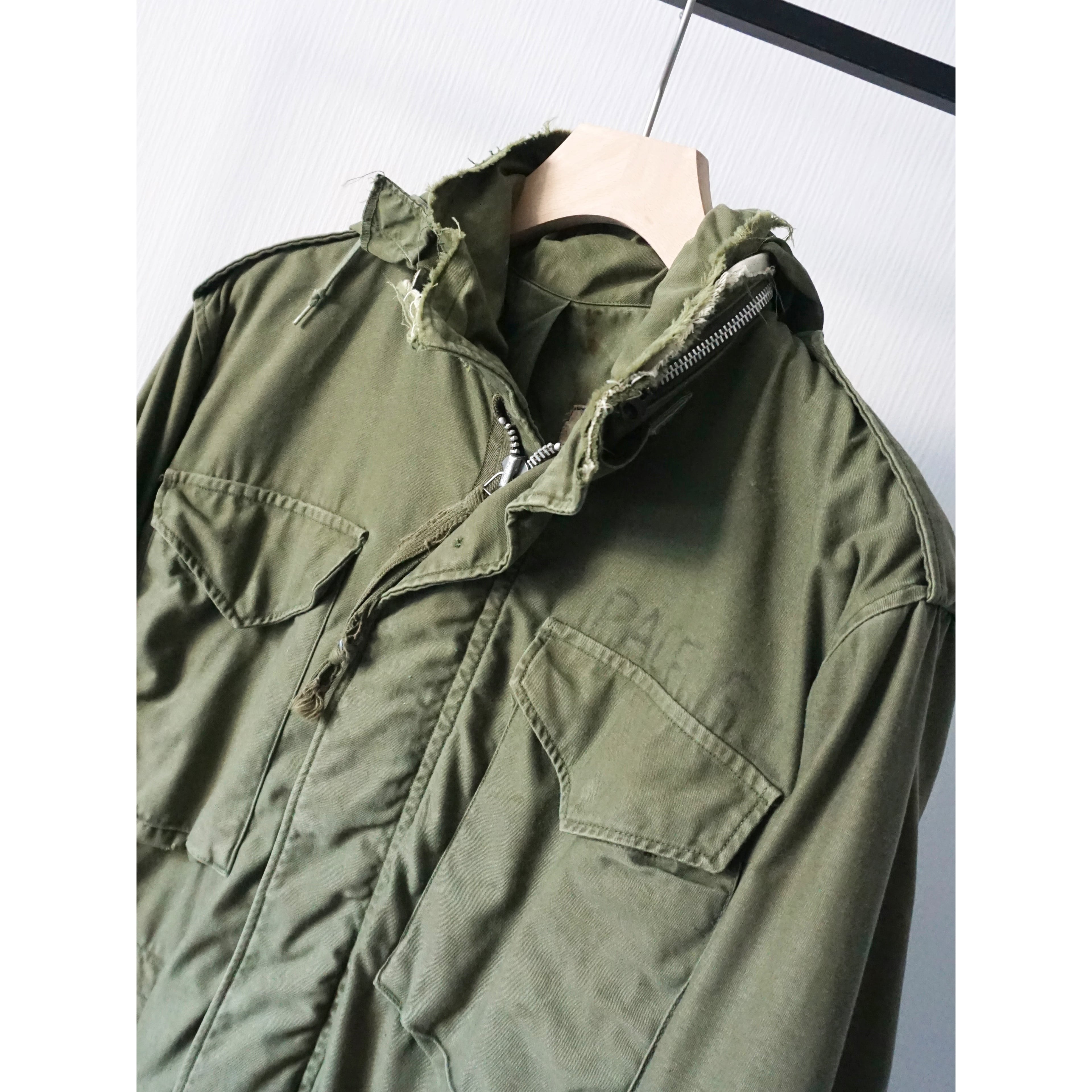 フードは収納不可能となります。ヴィンテージミリタリー製品特有の激しいダメージ、破れ、所々にペンキ汚れ、全体的に使用感がございます。どれも製品特有の風合いとしてご理解ある方のみご注文お願いいたします。
