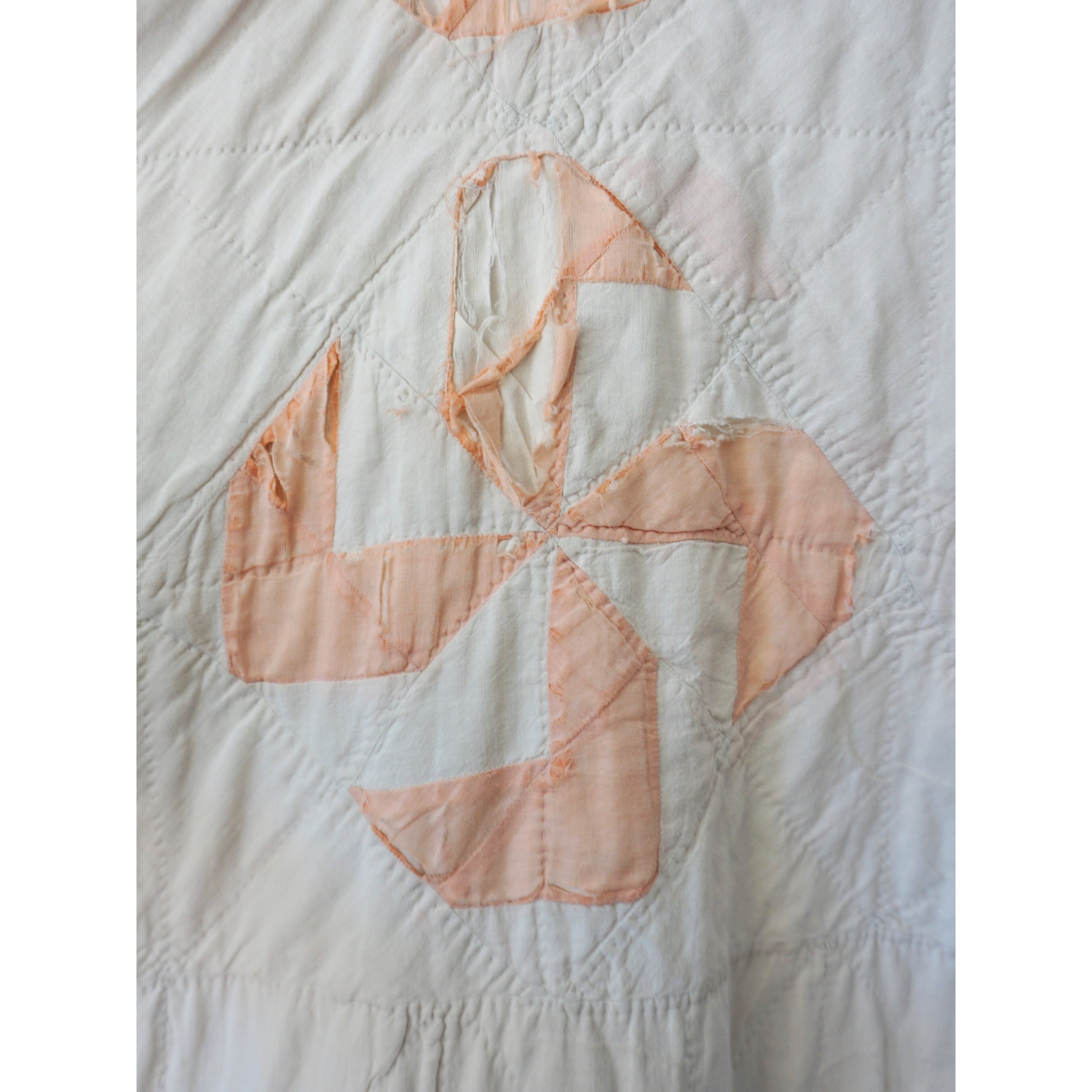 大変雰囲気のある古いコットンキルト、多色使いな物が多いですが、此方はホワイト×薄ピンクの二色使い。更には卍?か手裏剣?か柄も最高なキルトが使われております☺︎