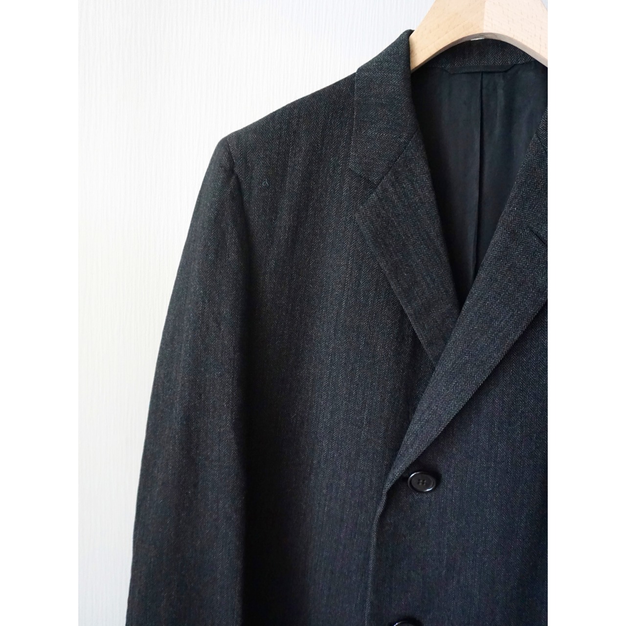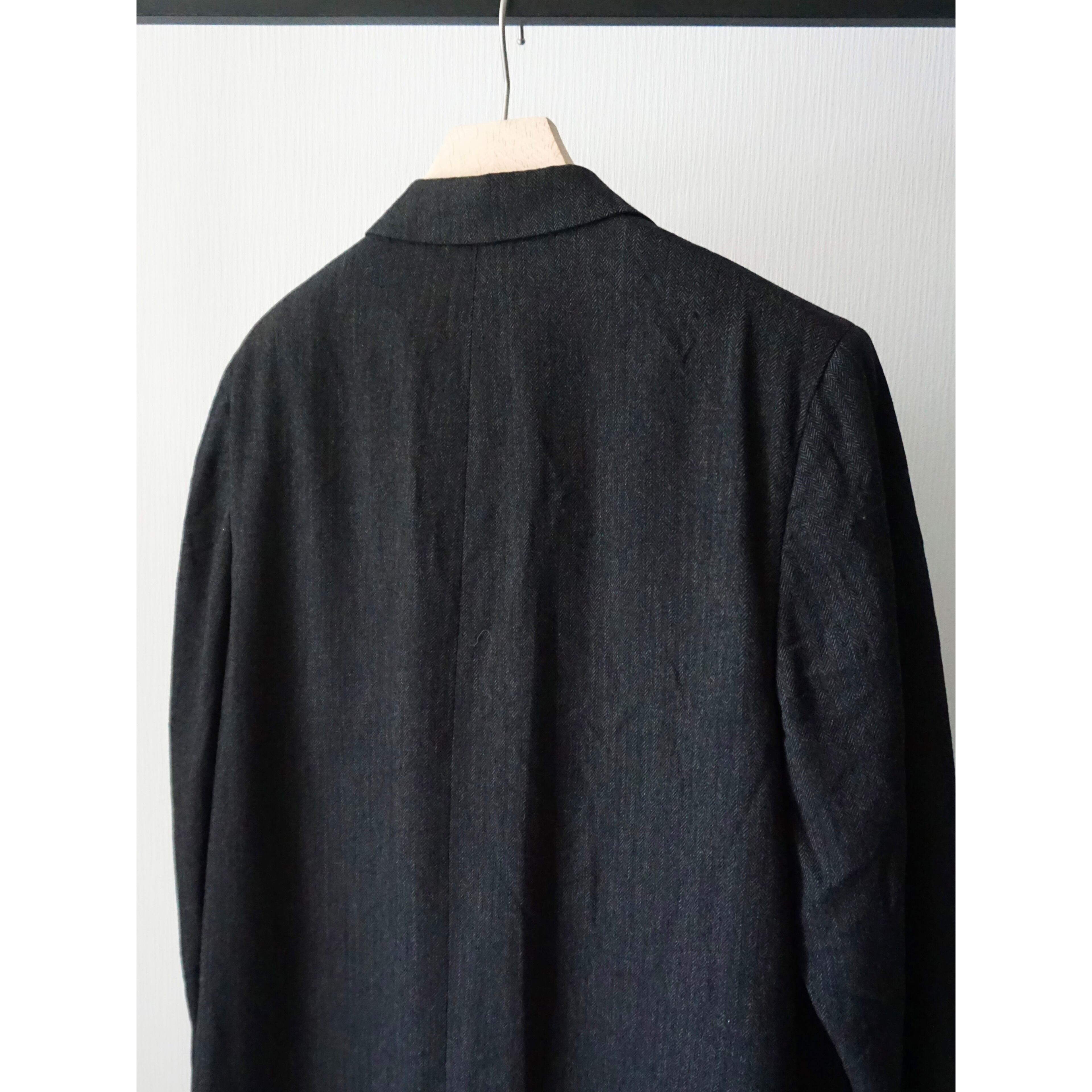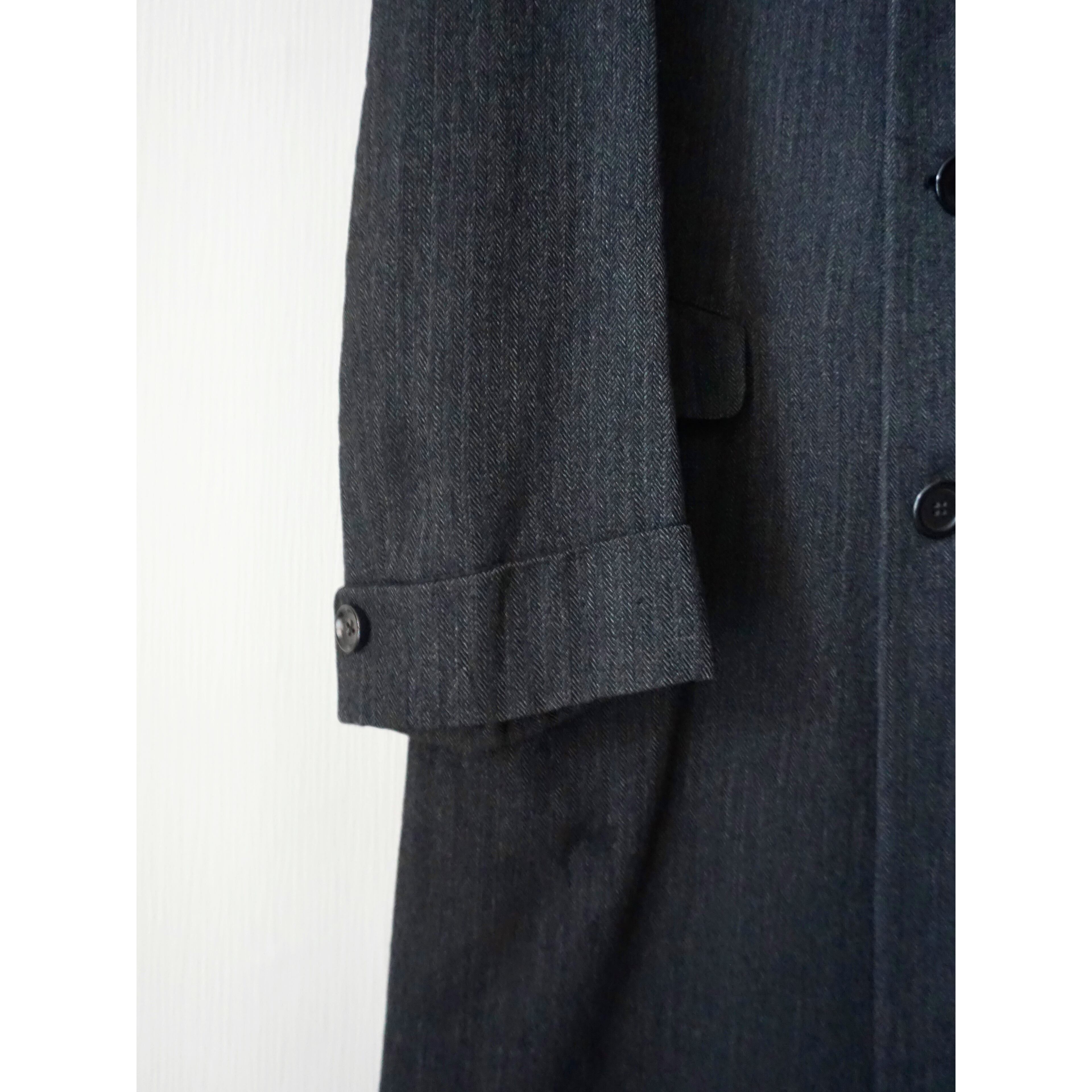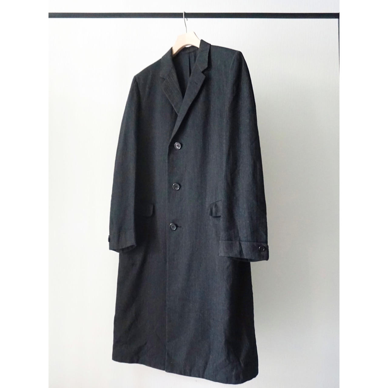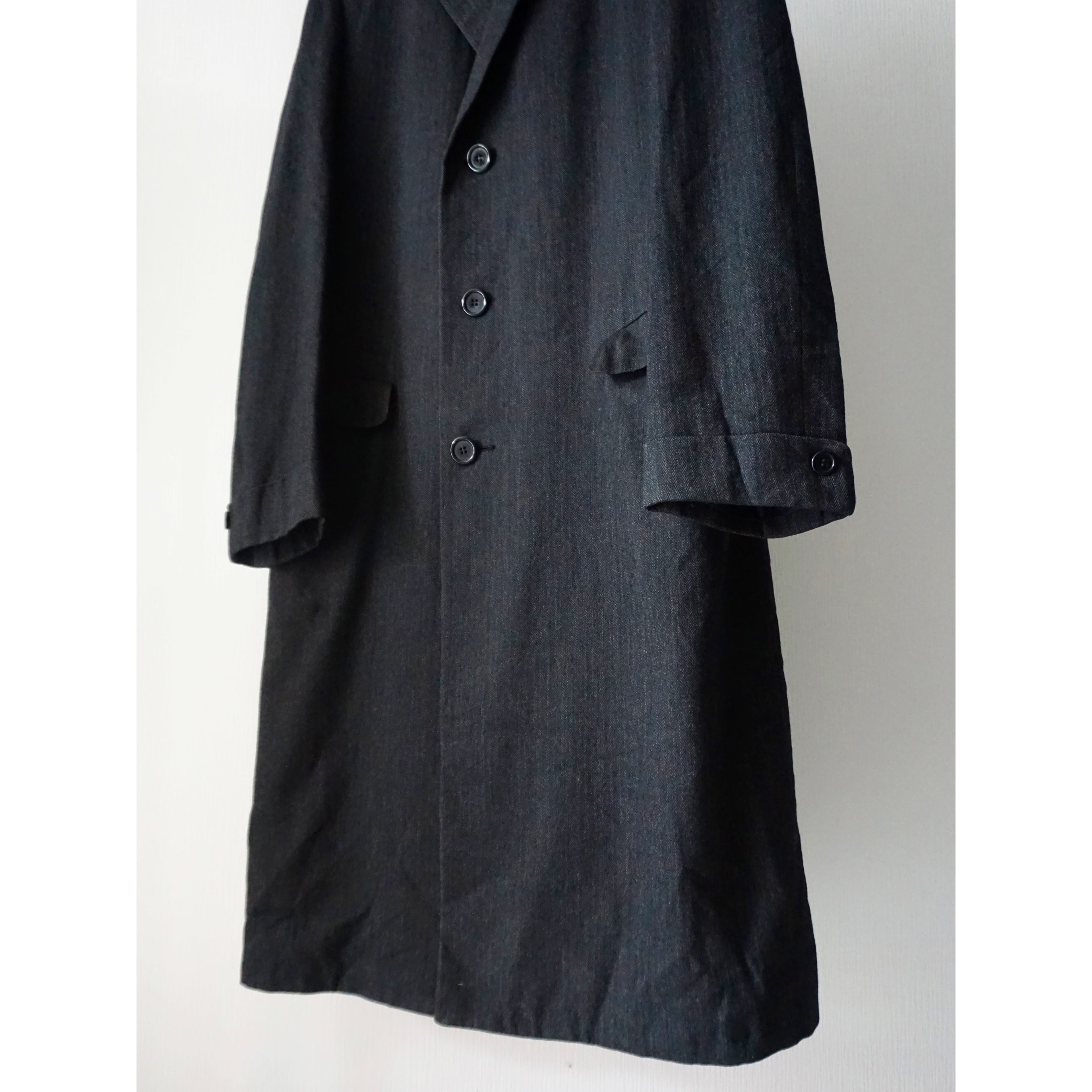 ヴィンテージ感漂うクラシカルなブラックヘリンボーン生地で、流行り廃り無いシングル仕様のチェスターコートスタイルな一着。