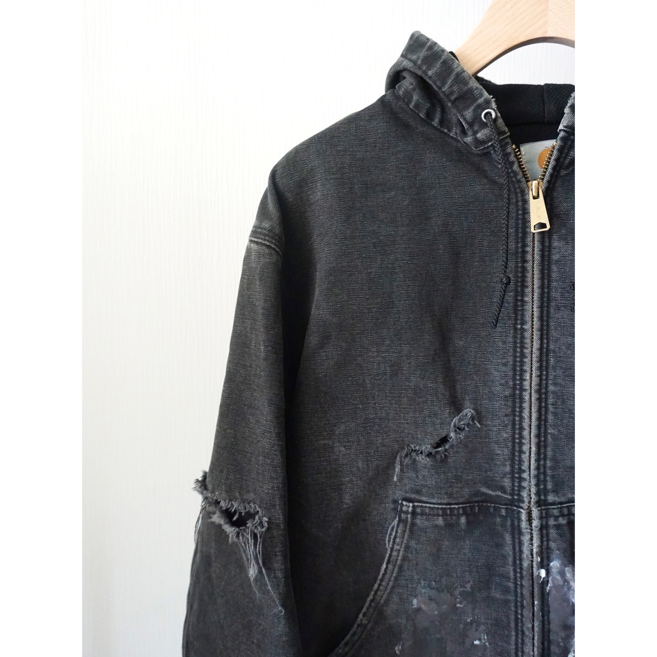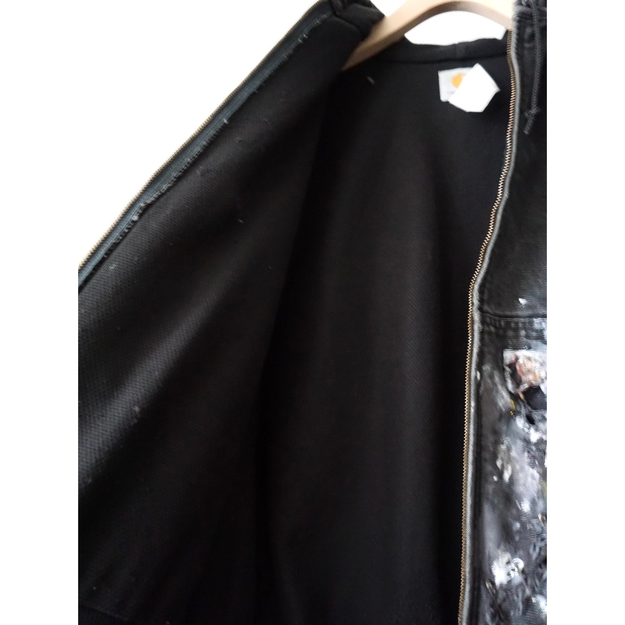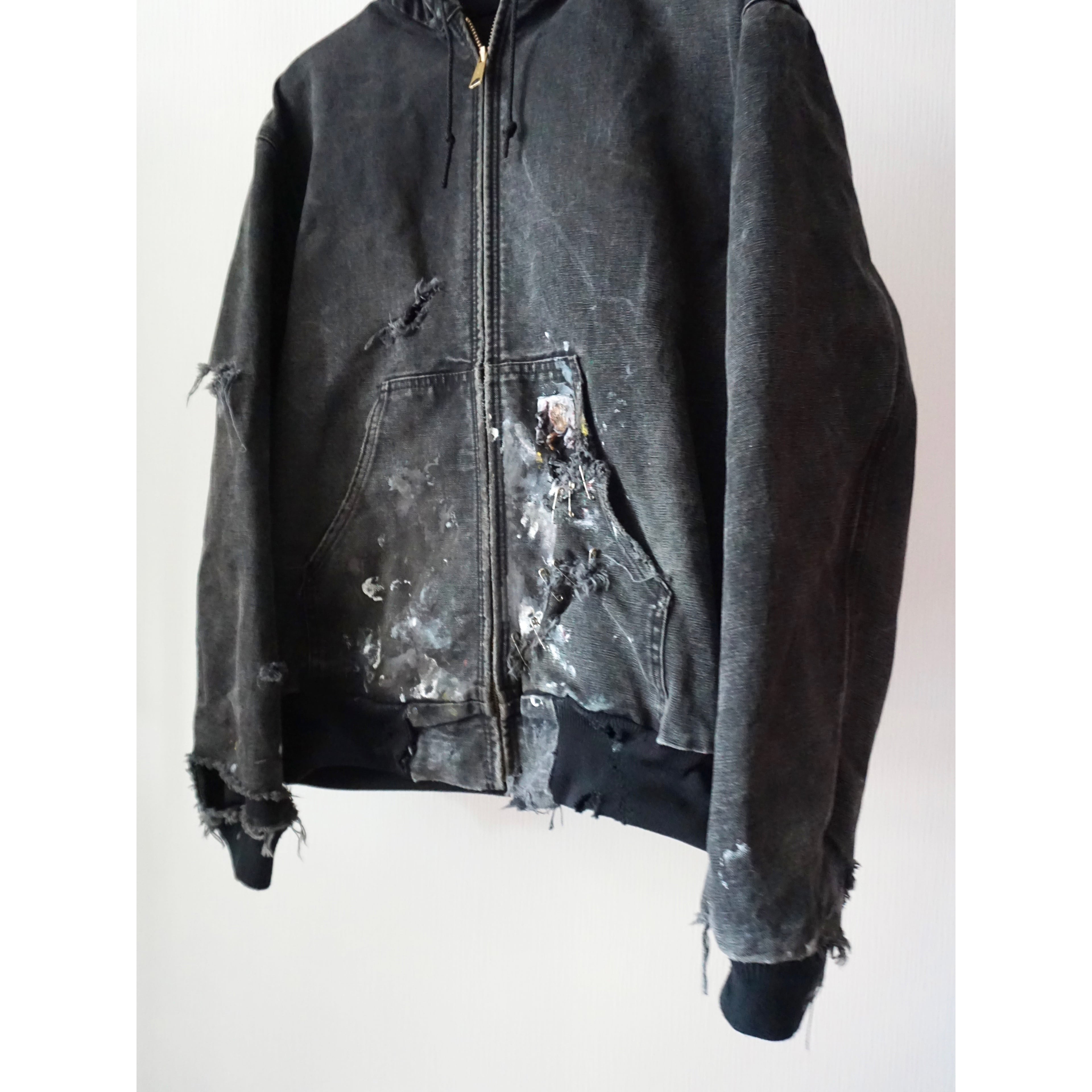 お探しの方の多いカーハートブラックアクティブジャケット、中でもアメリカンリアルワークによる一点物ピース。