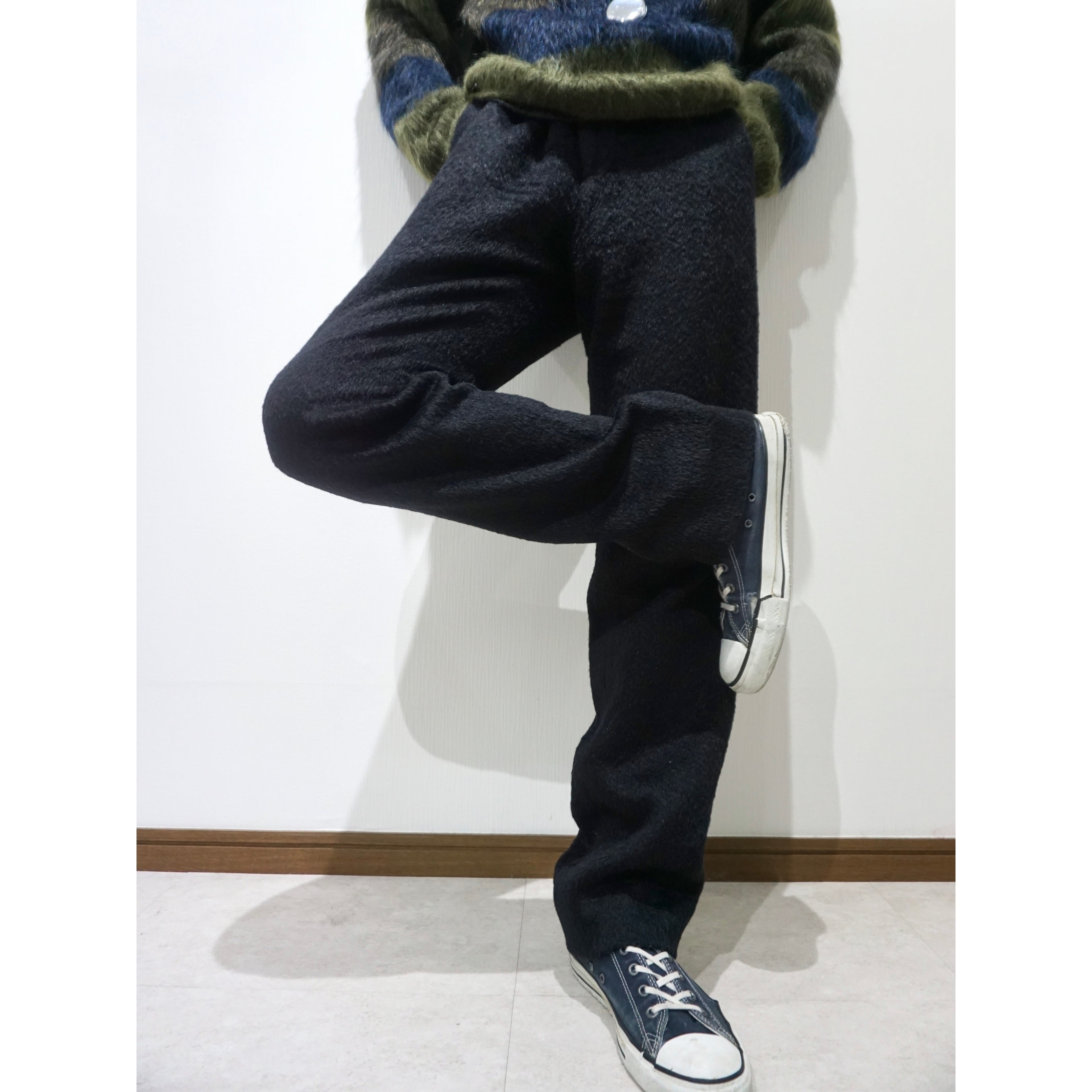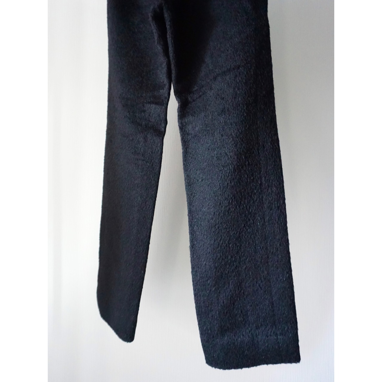 モヘアが33%と贅沢に混紡されたストレートシルエットの黒スラックス。