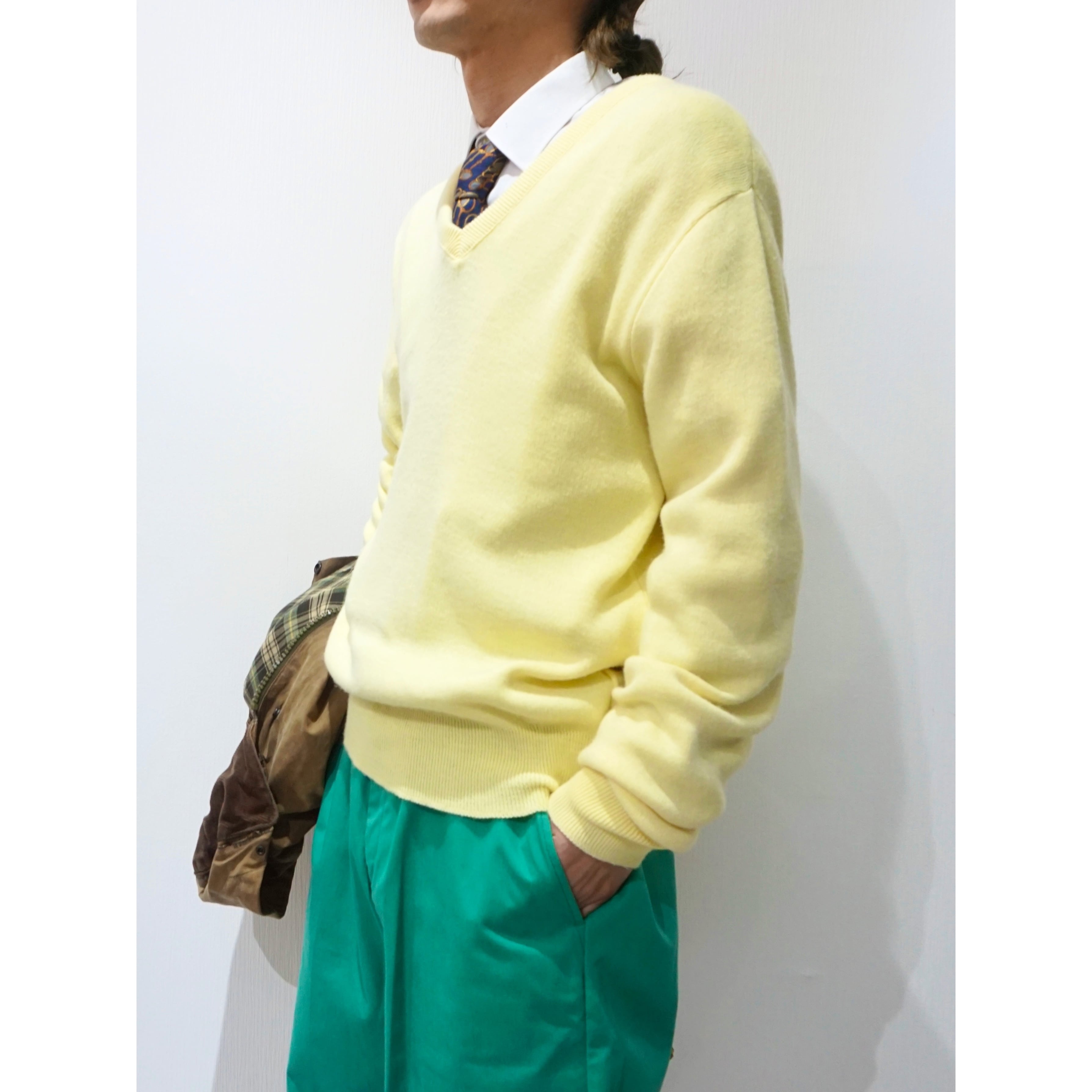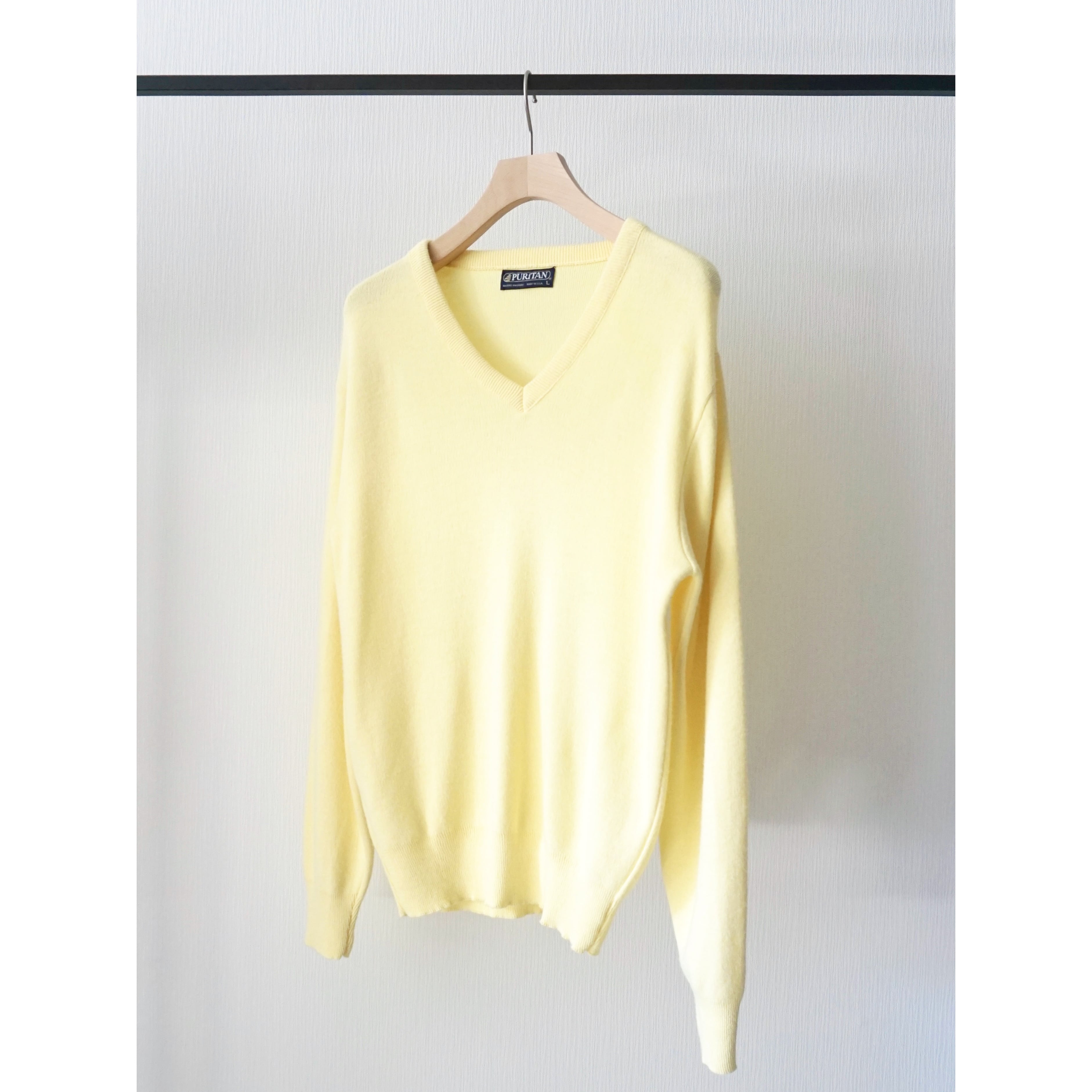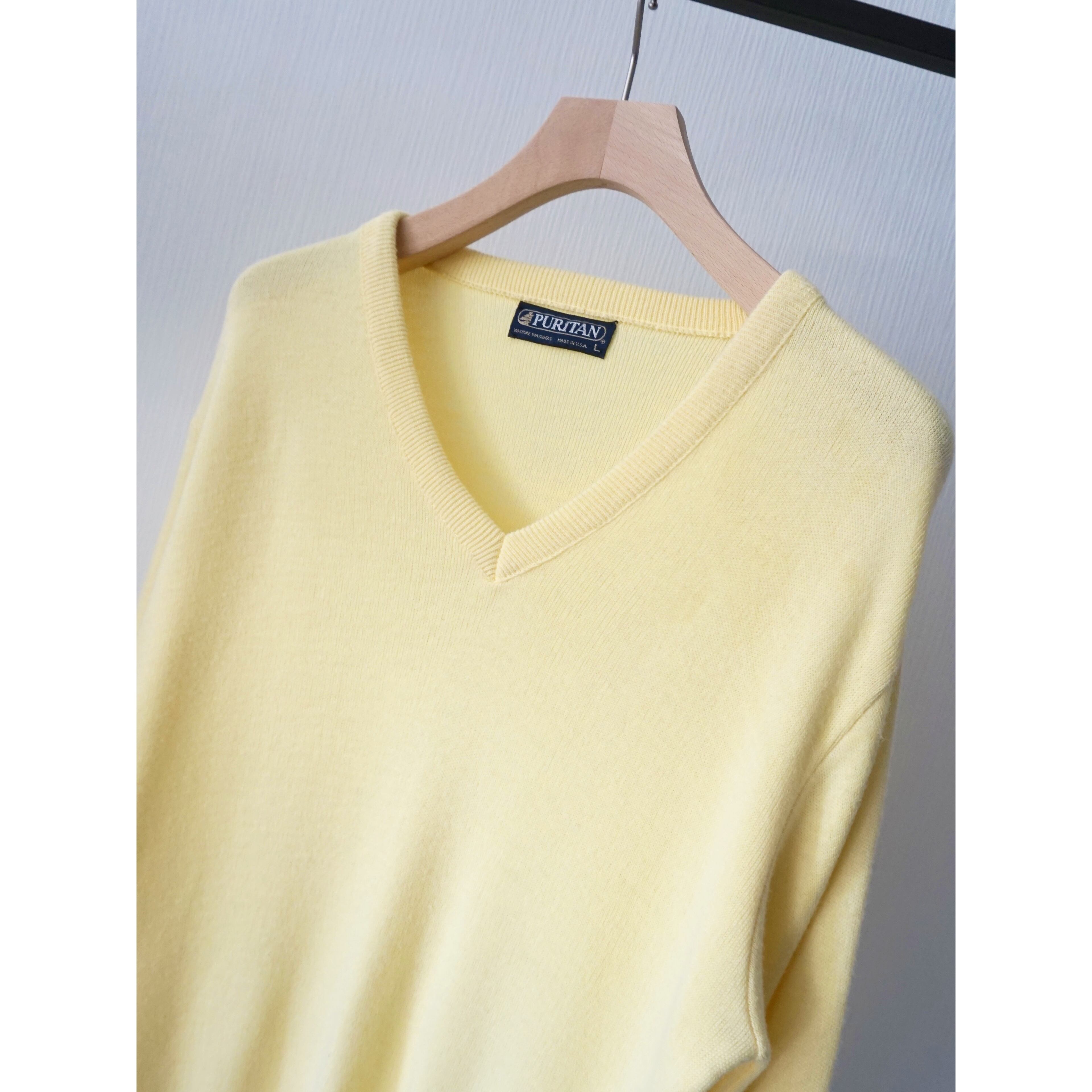 1980s vintage "PURITAN" pastel yellow color v-neck knit sweater made in USA