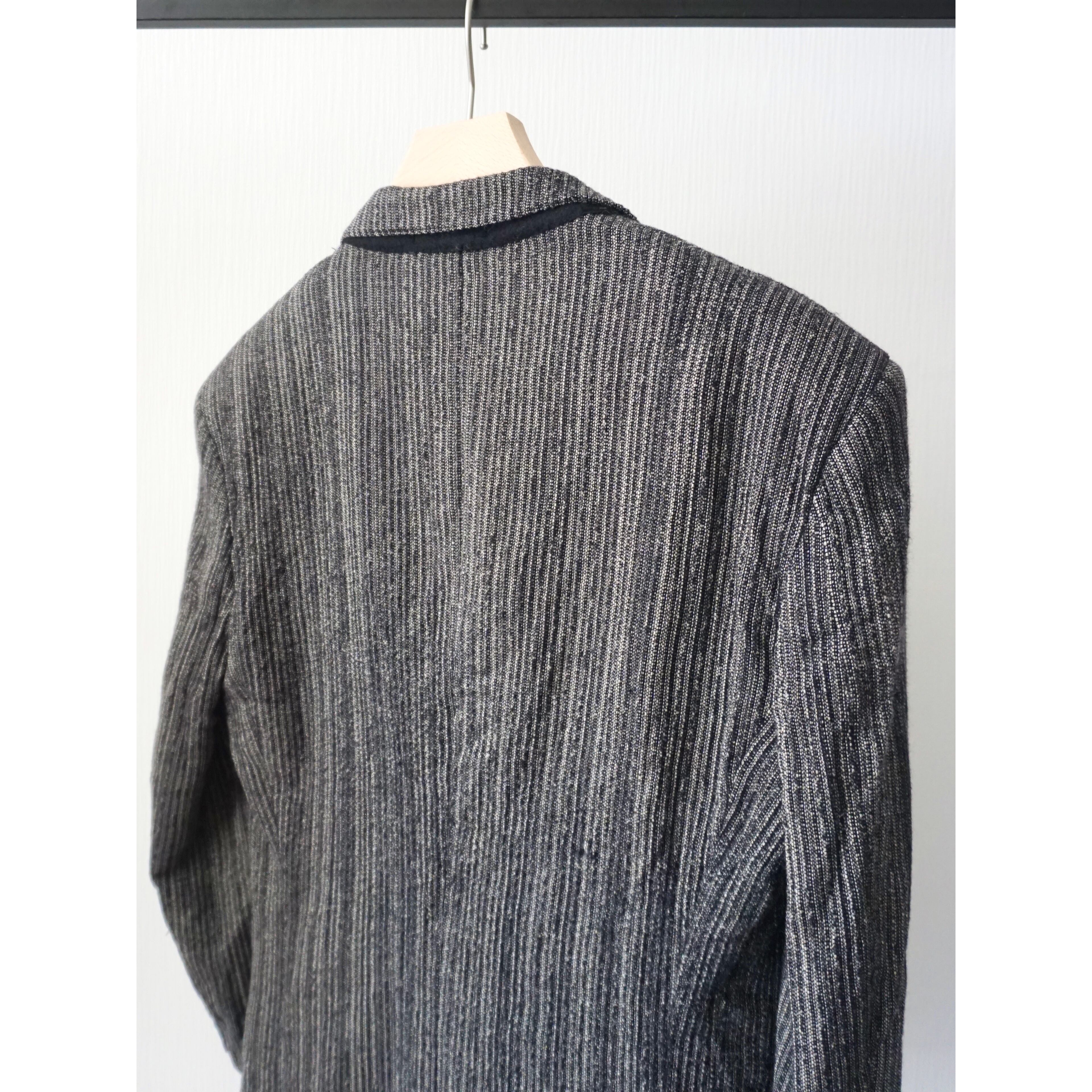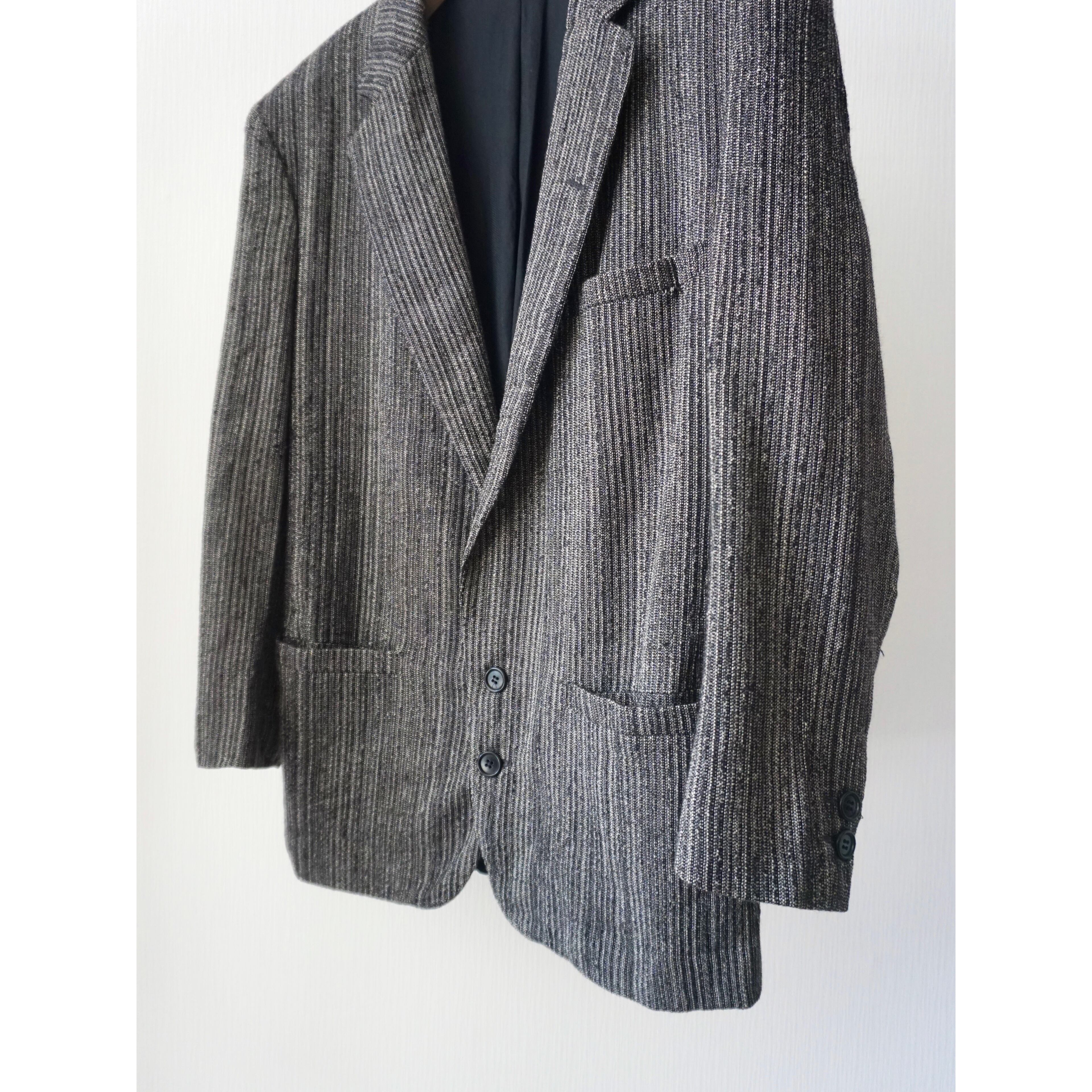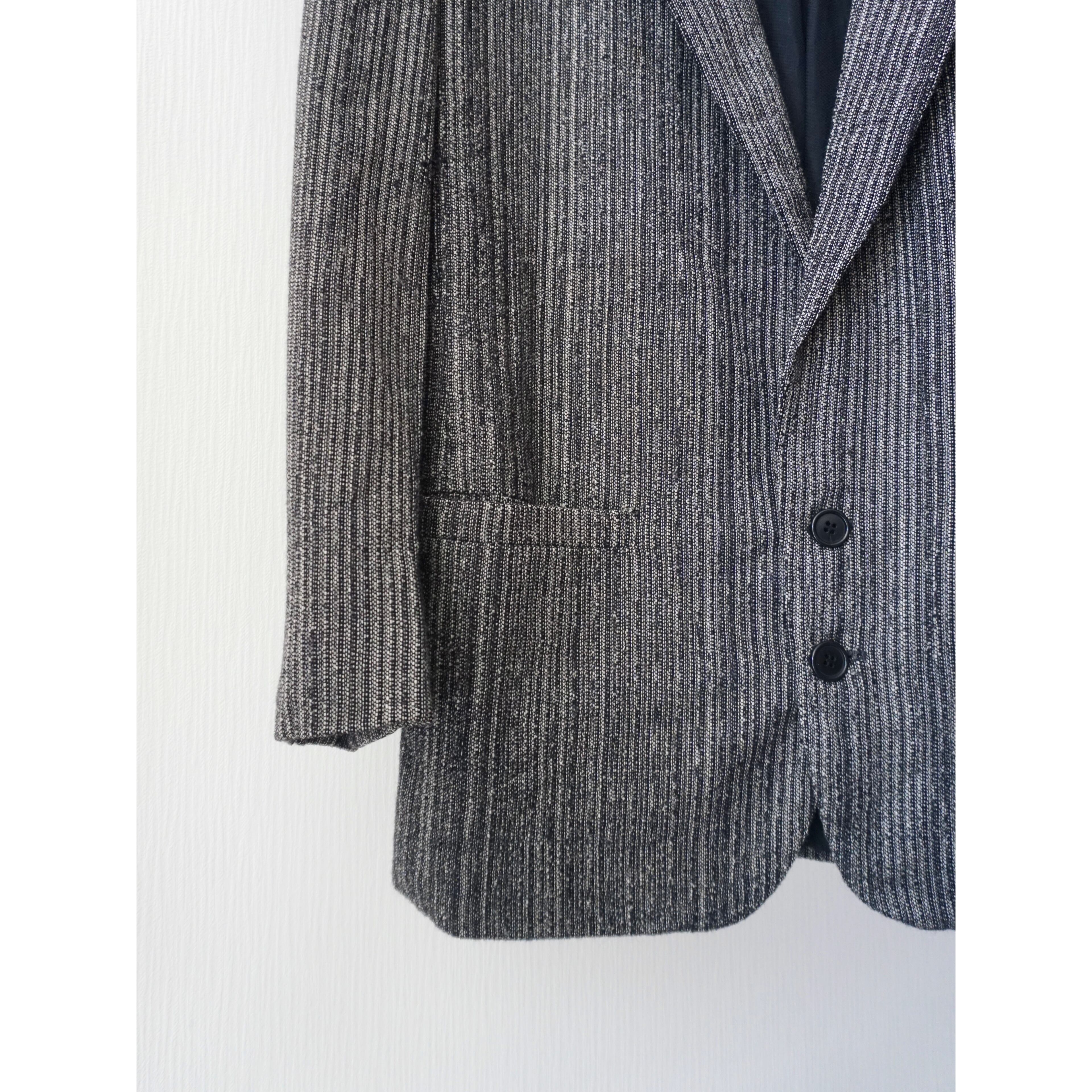 ブラック×グレーのごま塩カラーで凹凸感のある織りによりストライプ柄がデザインされた一着。