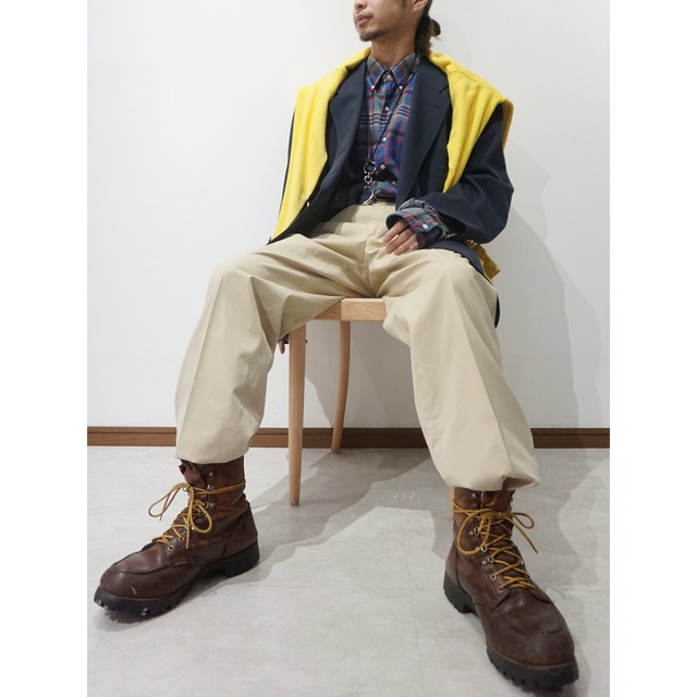 TALONジッパーが使用された少し古めな、 Dickiesのペインターパンツ。 オフホワイトボディに間違いなく塗装屋さんが作業着で使ってたであろう激しくペンキが飛び散っためちゃくちゃクールなルックスな一本。 着込まれクタッとした生地やリアルなダメージ等も含め素晴らしい雰囲気です◎ サイズも実寸W36L29と、ベルトでギュッと絞って良い太さで穿いていただけるめちゃくちゃ良いサイズバランスかと☺︎ 穿くだけでグッと雰囲気を纏える一本です。 お好きな方は是非この機会に 【ブランド】 Dickies 【カラー】 オフホワイト (※お使いのモニター環境により、画像の色味が実物と異なって見える場合がございます。) 【素材】 コットン 【サイズ】 表記サイズ : 不明 ウエスト 93cm / 股下 74cm / 総丈 104cm / 裾幅 22.5cm ※測定における若干の誤差はご了承下さいませ。 実寸サイズ : メンズW39 L29程度 着用モデル : 171cm 52kg 【状態】 ヴィンテージワーク製品特有の激しいペンキ飛び、細かなダメージ、全体的な使用感がございます。どれもヴィンテージ デニム製品特有の風合いとしてご理解ある方のみご注文お願いいたします ※尚、実店舗でも販売しております為、掲載されていても時間差で在庫切れになる場合がございます。予めご了承下さい。