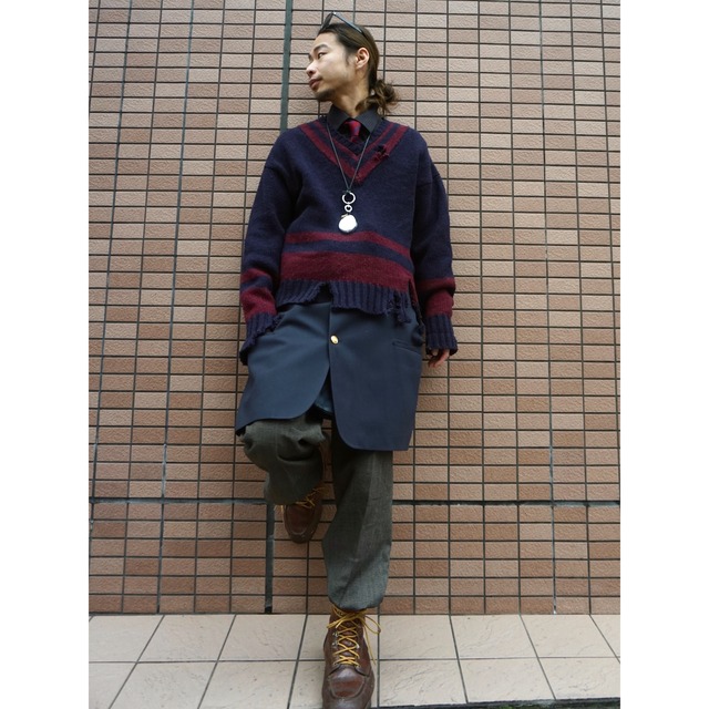 当店では普段からほぼ取り扱わないブランドの一つ、Polo by Ralph Laurenよりウールのチルデンニットセーター。 ですが此方は各所にクラッシュや裂け、リアルなダメージが入る雰囲気抜群なBoroな個体!中々に新鮮ですし、とてもクールなルックスな一着です。 1990年代上質な香港製時代のラルフローレン。素材は100%ウール素材で程良く肉厚でしなりがあり、今時期にしっかり暖かく着ていただけるラルフらしい上質なニットファブリックです。 深みあるネイビー×ボルドーの間違いの無いクラシカルな配色のチルデンニット。この感じでBoroってところがまた良いですね☺︎ 一点物感漂う良い古着です。 お好きな方は是非この機会に 【ブランド】 Polo by Ralph Lauren 【カラー】 ダークネイビー、ボルドー (※お使いのモニター環境により、画像の色味が実物と異なって見える場合がございます。) 【素材】 100% ウール 【サイズ】 表記サイズ : L 肩幅 66cm / 身幅 60cm / 袖丈 61cm / 着丈 60cm ※測定における若干の誤差はご了承下さいませ。 着用モデル : 171cm 52kg 【状態】 古着製品特有の破れやほつれ、全体的な使用感等ございます。どれも製品特有の風合いとしてご理解ある方のみご注文お願いいたします。 ※尚、実店舗でも販売しております為、掲載されていても時間差で在庫切れになる場合がございます。予めご了承下さい。